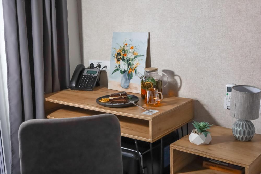 Стандартный двухместный номер с собственной террасой, кроватью king-size и ванной комнатой. В номере есть все для комфортного пребывания: набор полотенец, махровые халаты, тапочки, средства личной гигиены, фен, бесплатный Wi-Fi, телевизор, сейф, рабочий стол, стулья, шкаф, вешалки, отопление, звукоизоляция, зеркало, а также чайник с чашками.