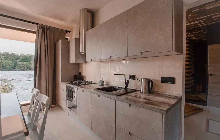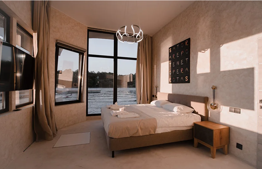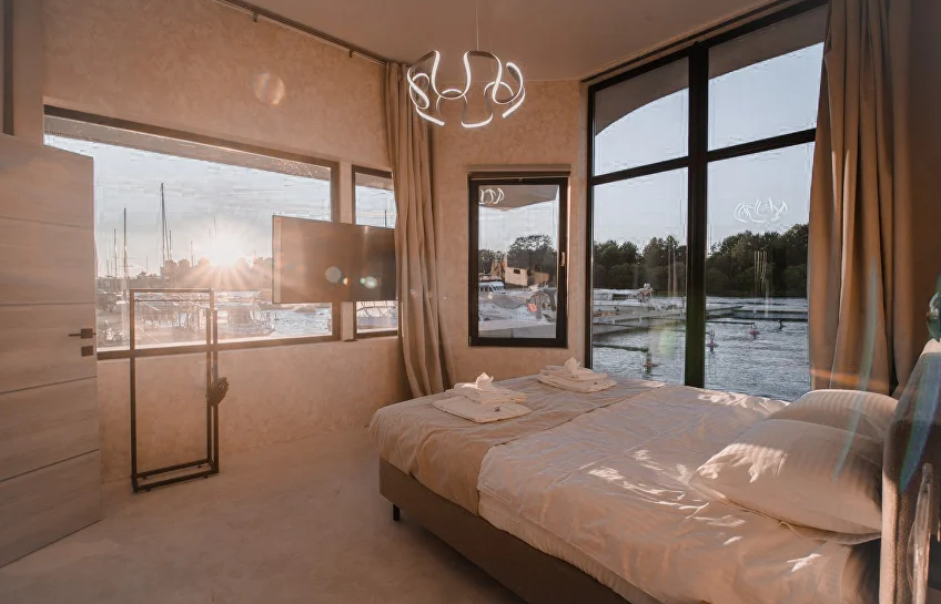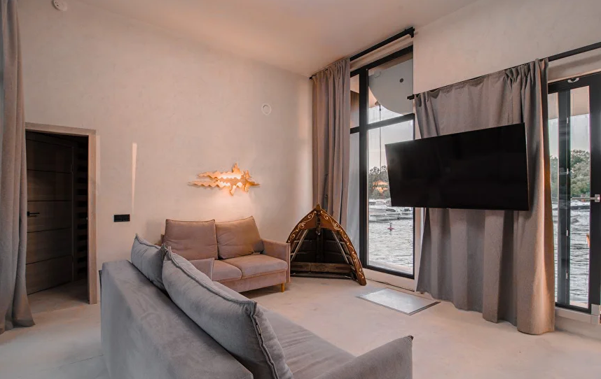 Дом на воде оборудован всем необходимым для комфортного отдыха, три комфортабельные мебелированные спальни, кухня, телевизор, Wi-Fi, панорамные окна с видом на реку Нева. Собственный совмещенный санузел с гигиеническими принадлежностями.