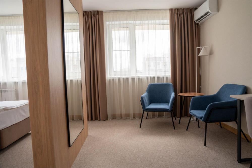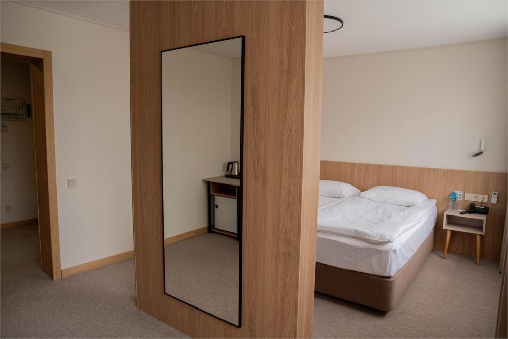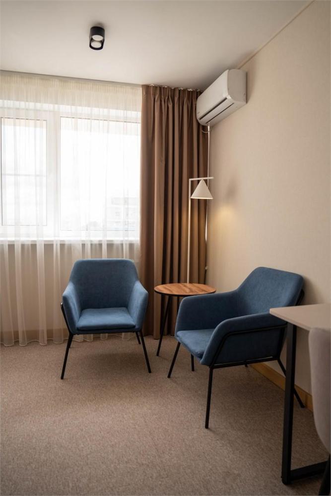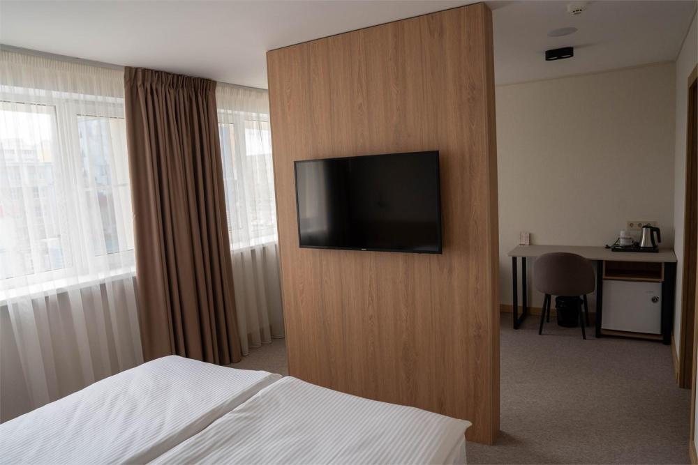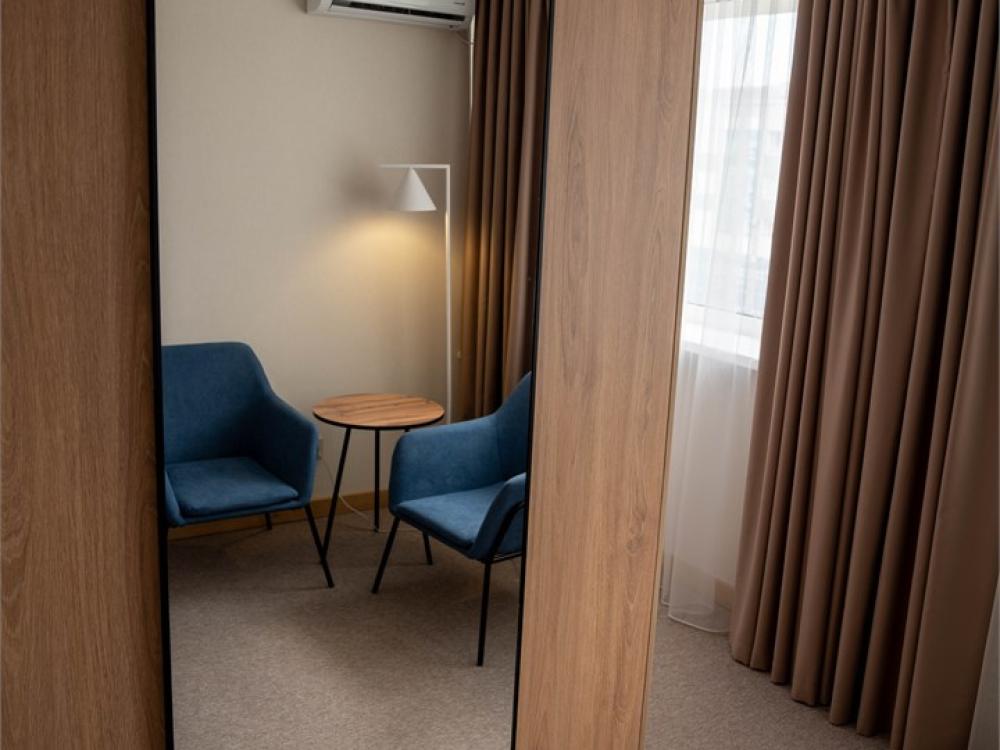 Новые просторные номера (от 20 кв.м.) с зонированием на спальную и гостиную зоны. Конфигурация кроватей адаптируется под ваши потребности (она двуспальная или две односпальные). Вид на центр города и удобная рабочая зона. Идеально для работы и отдыха!