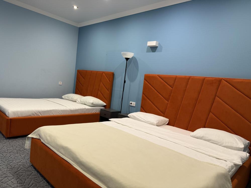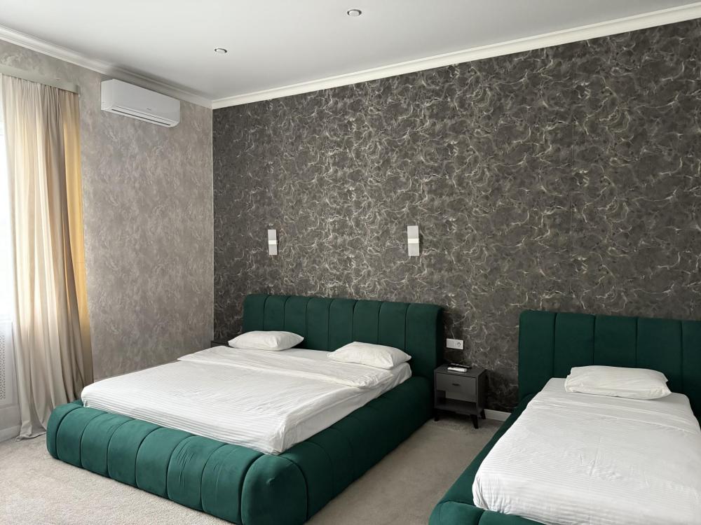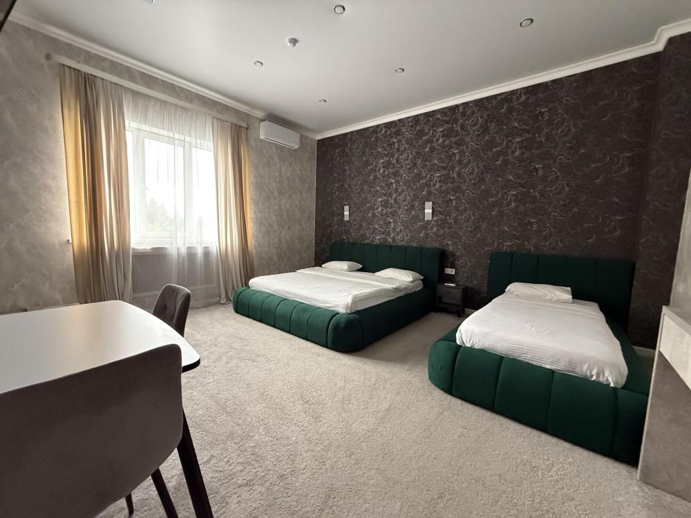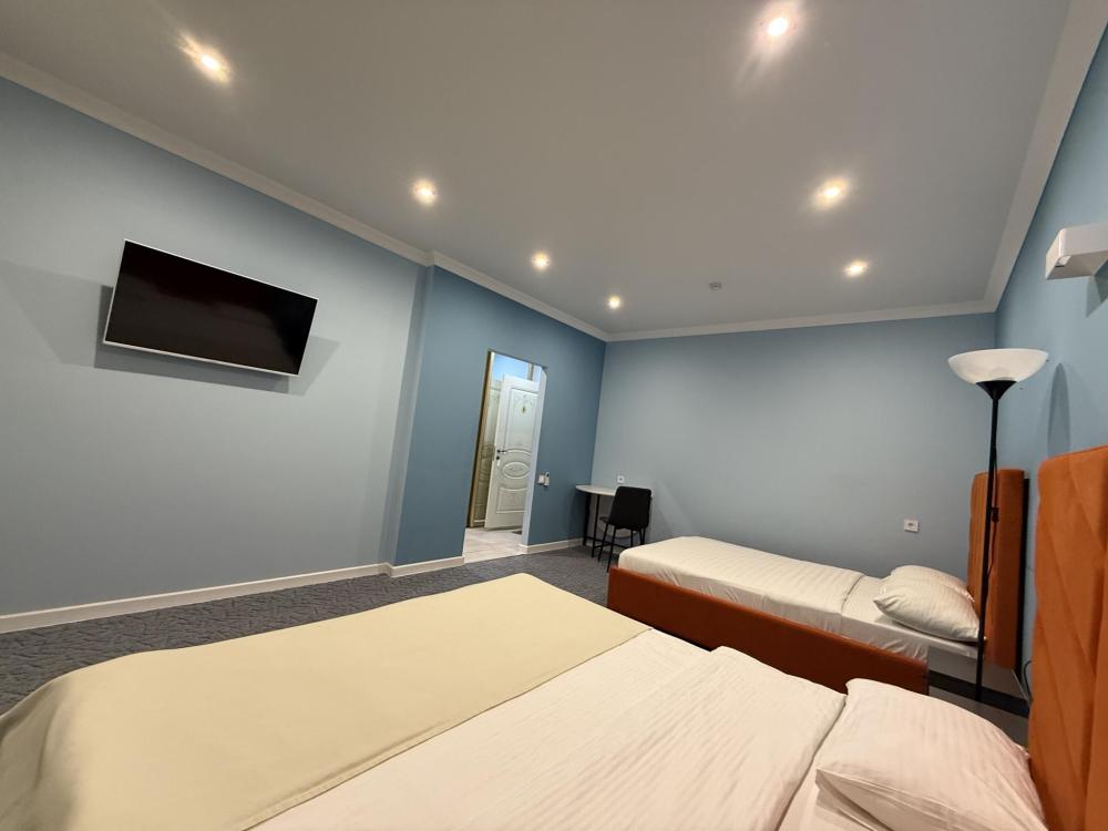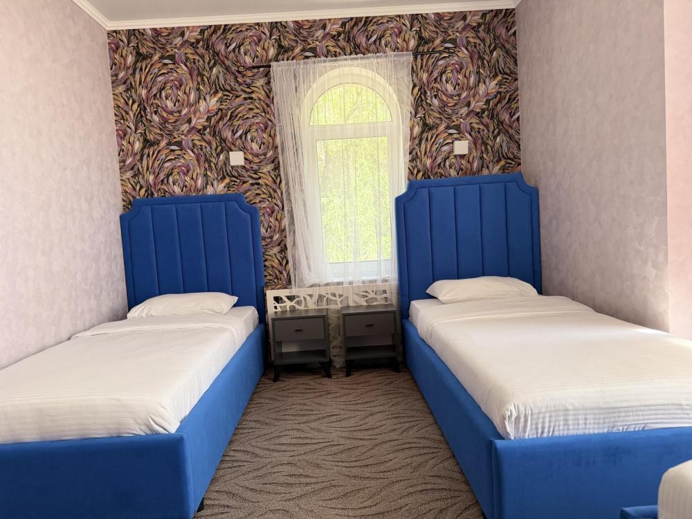 Комната в спокойных пастельных тонах со всеми удобствами. К распоряжению гостей холодильник, собственная ванная комната с душем , телевизор с плоским экраном , электрочайник , халаты , тапочки и ванные принадлежности. Одна комната с двумя односпальными (под запрос).