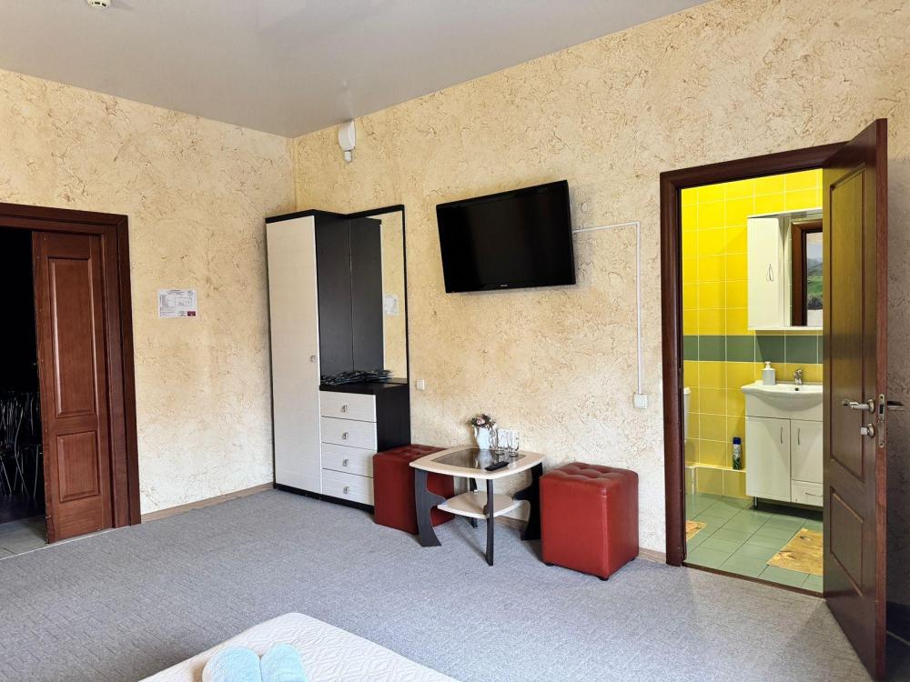 Уютный семейный номер: № 6. Двуспальная кровать, телевизор, кондиционер, холодильник, комплект полотенец, душ, туалет, гель для душа, шампунь, зубной набор, тапочки. На стойке регистрации можно взять фен, чайник, воспользоваться микроволновой печью.