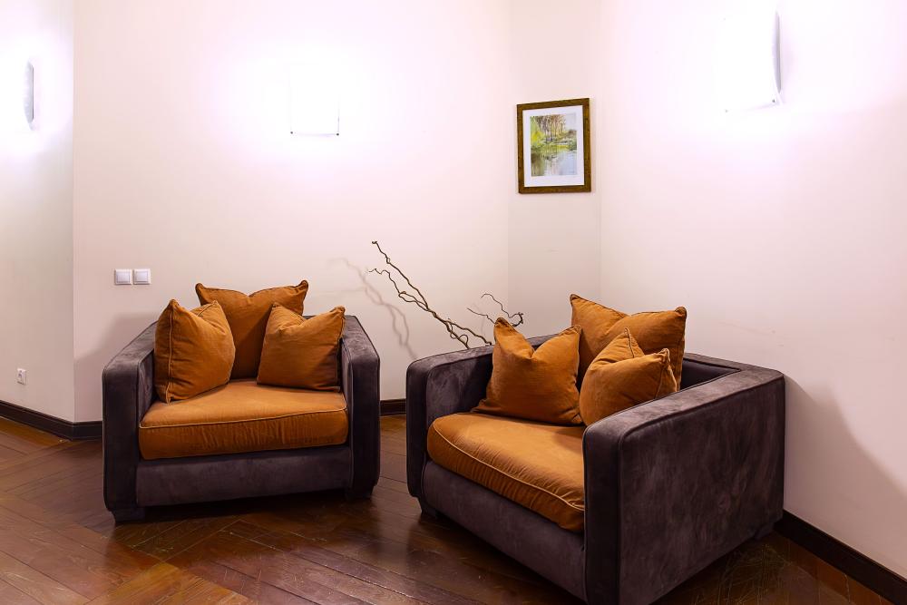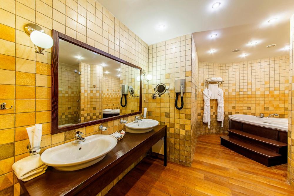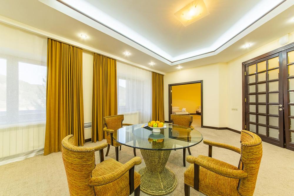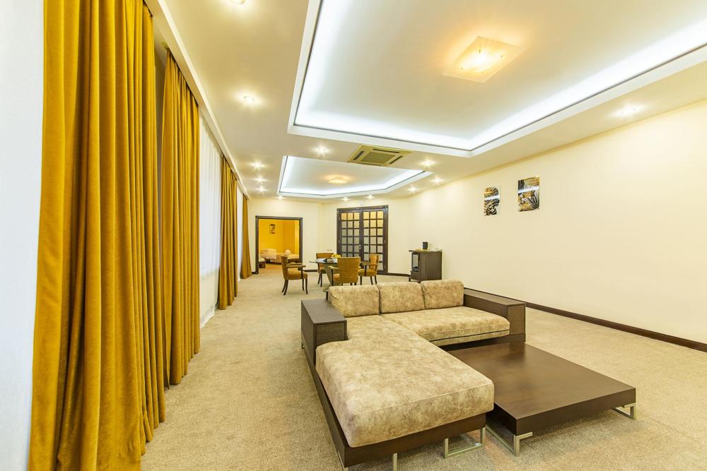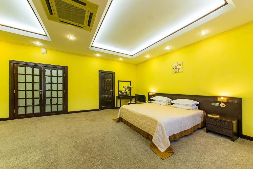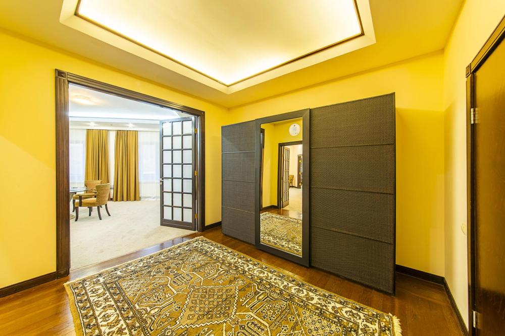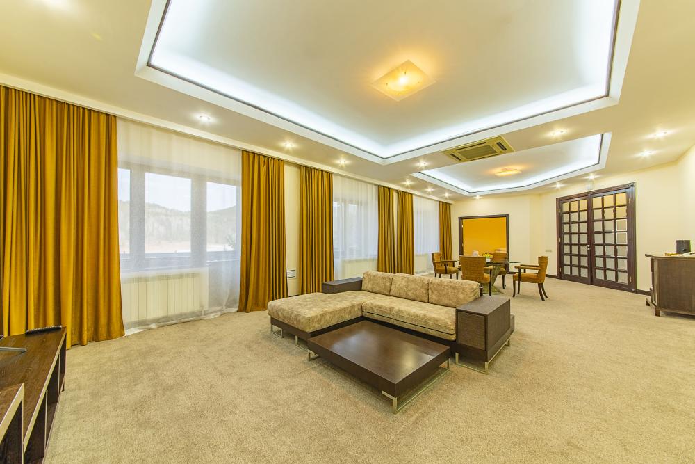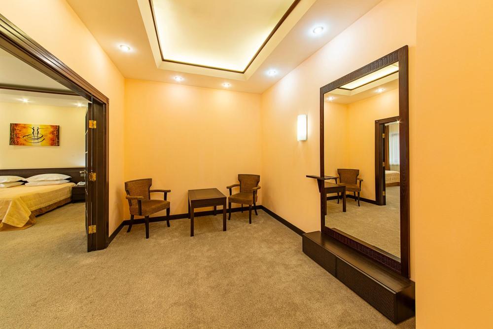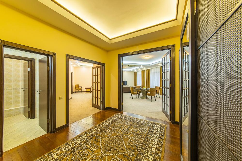 Площадь номера — 55 м2 Комнаты — спальня (1 кровать), гостиная, 2 санузла, гардеробная В номере — телевизор, DVD, телефон, мини-бар, сейф, продукция индивидуального пользования, фен