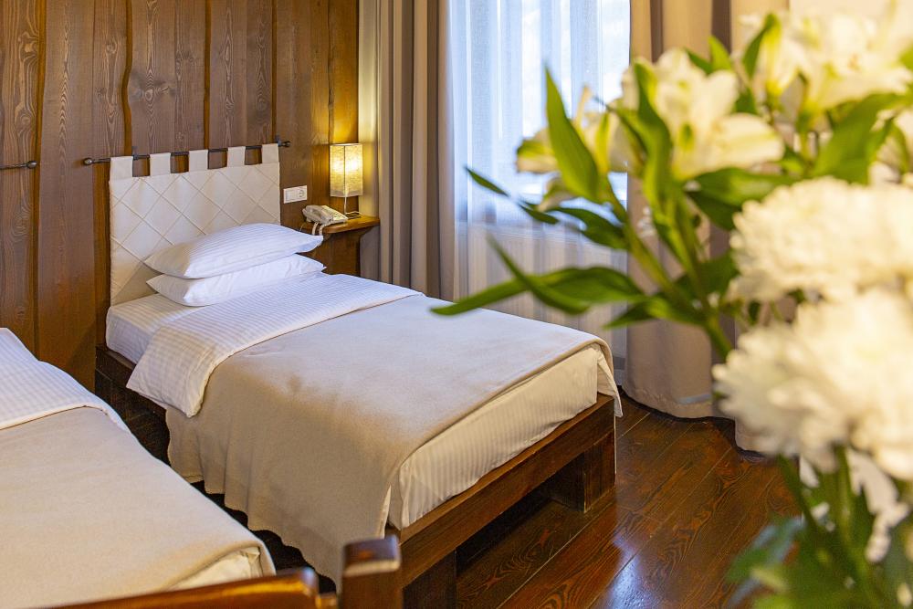 Площадь номера — 22 м2 Комнаты — спальня (2 кровати), санузел. В номере — телевизор, телефон, продукция индивидуального пользования, фен.