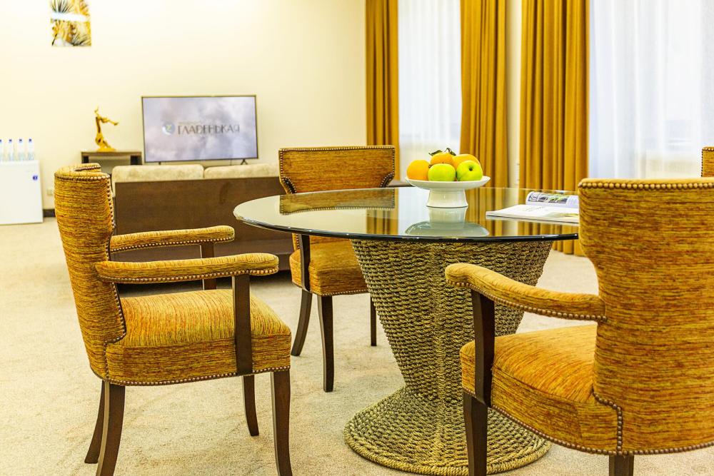 Площадь номера — 187 м2 Комнаты — спальня, гостиная, кабинет, гардеробная, 2 санузла В номере — 3 телевизора, компьютер, принтер, ксерокс, факс, телефон, мини-бар, сейф, продукция индивидуального пользования, фен