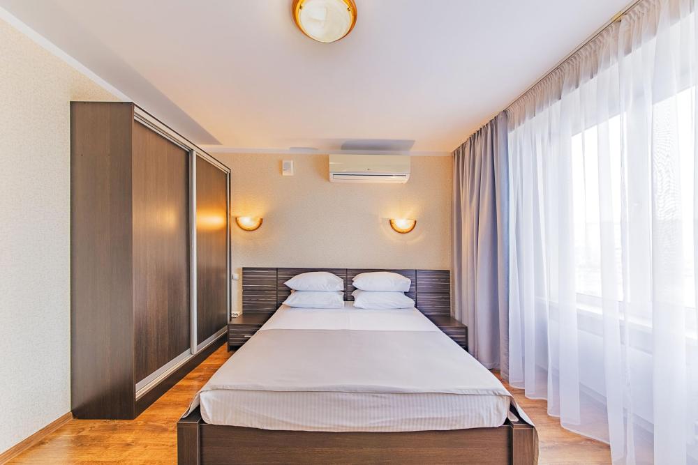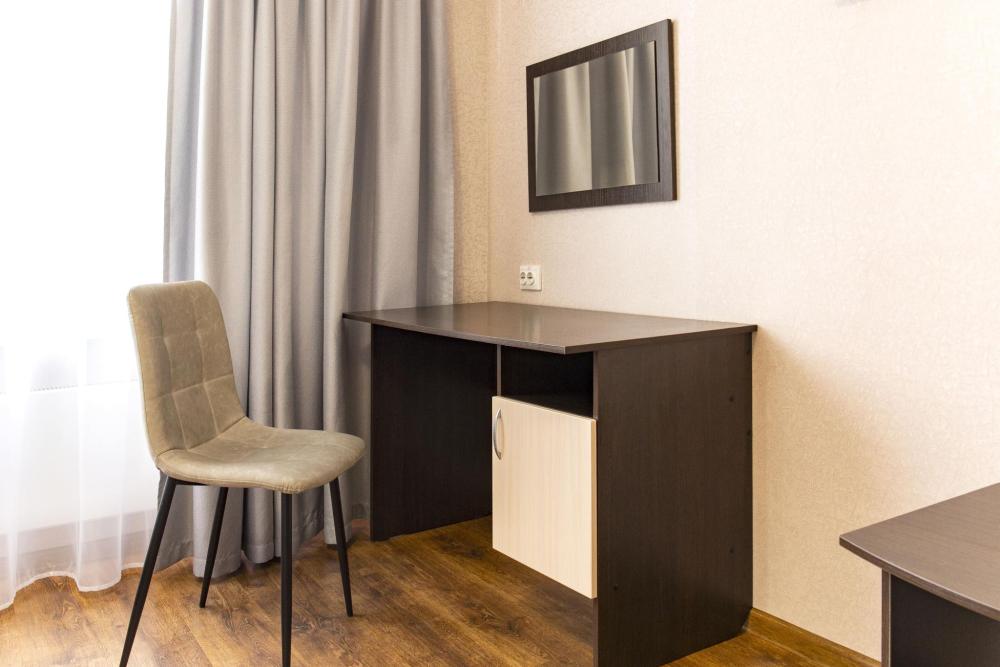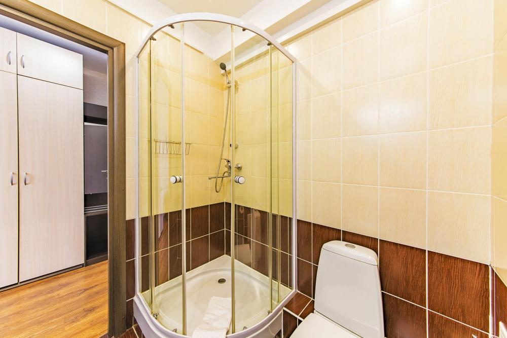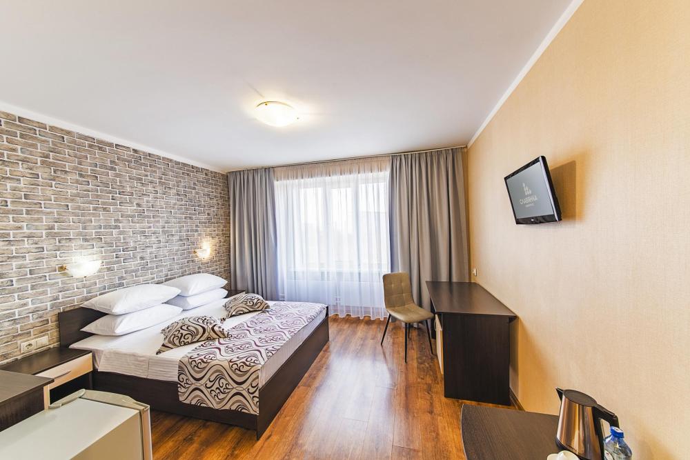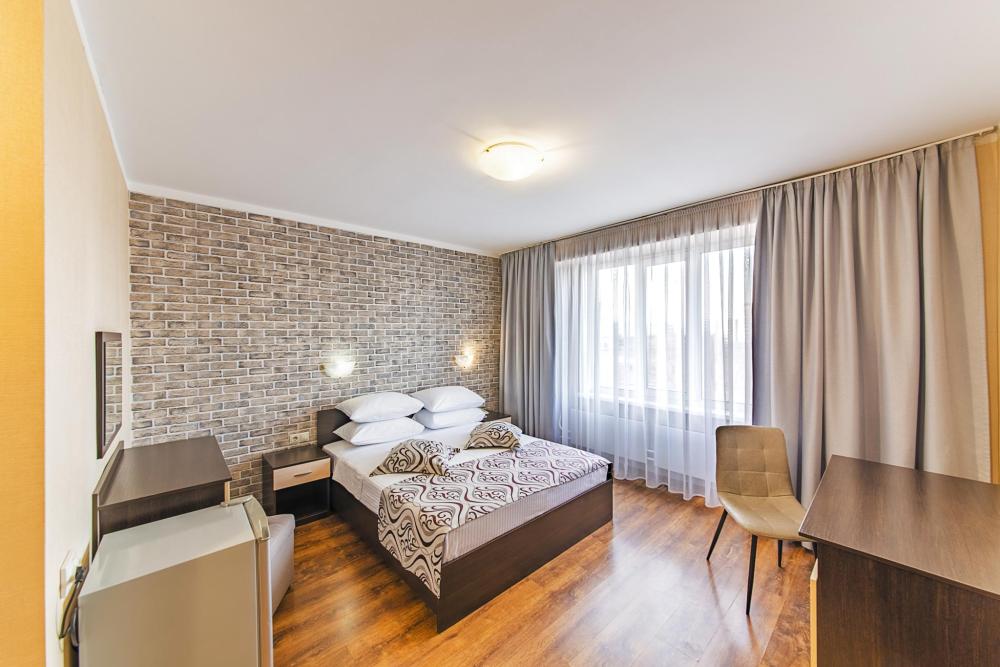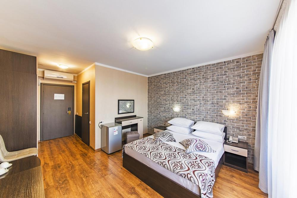 Номер состоит из одной жилой комнаты с двуспальной кроватью, санузел с душевой кабиной. Комплектация: телевизор, телефон, холодильник, продукция индивидуального пользования, фен.