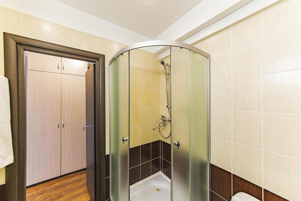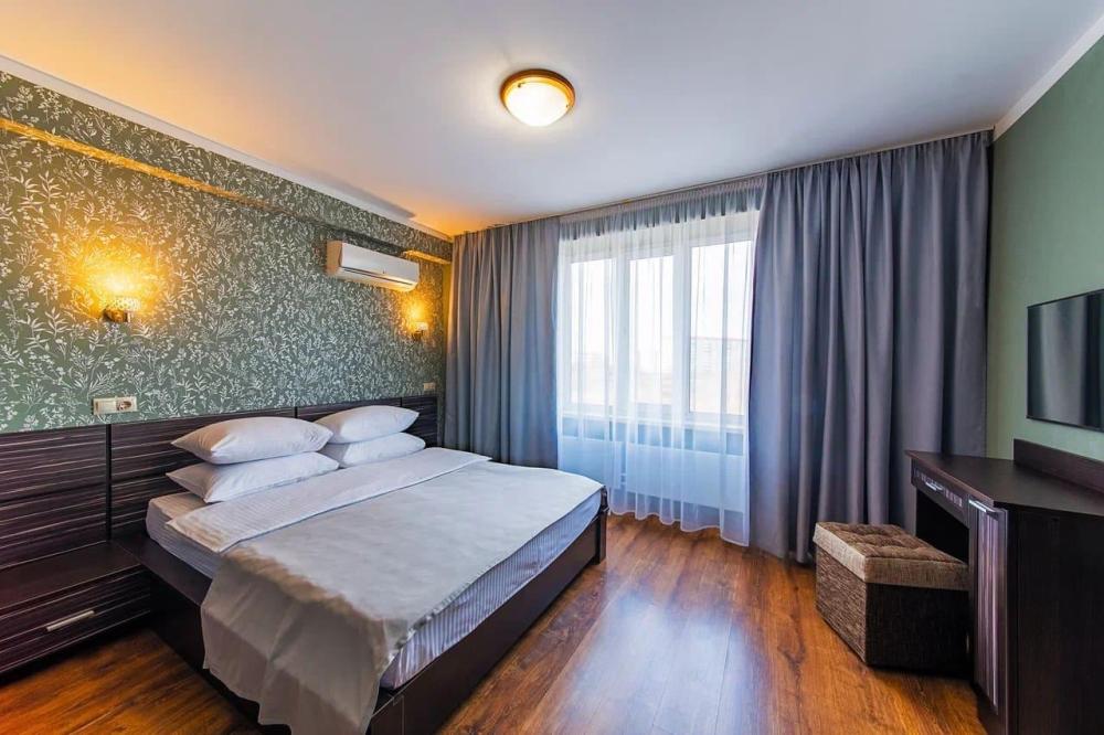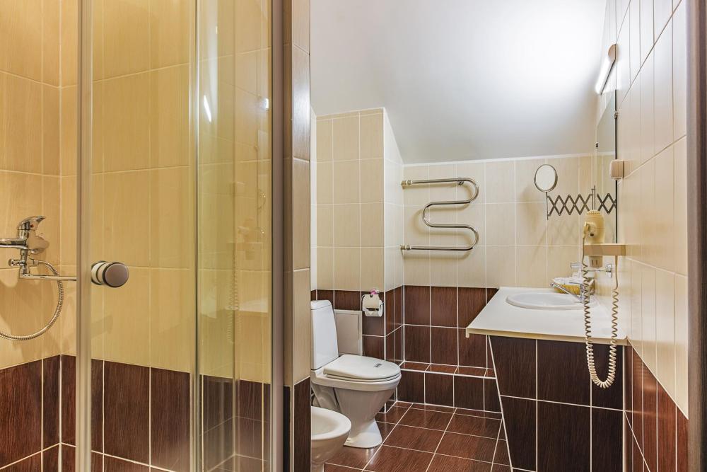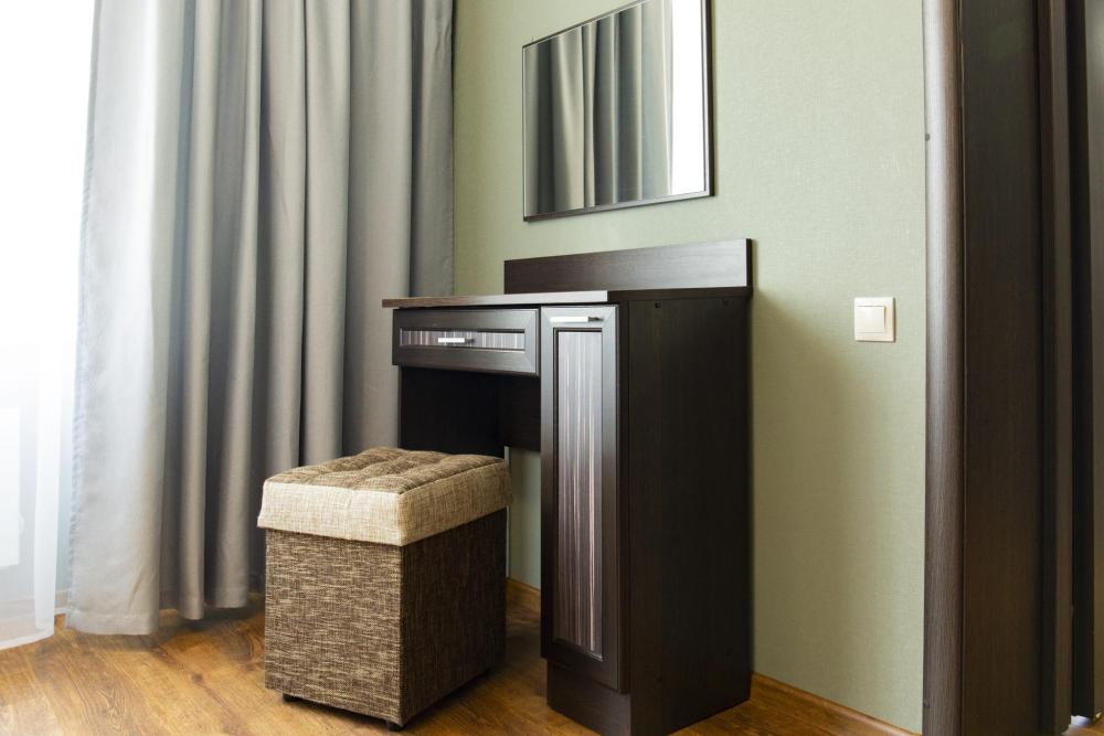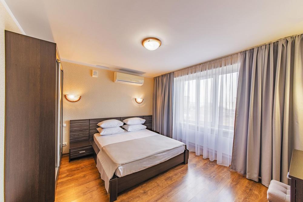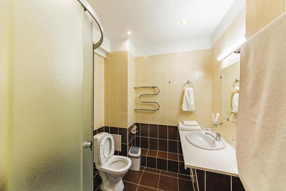 Номер состоит из одной жилой комнаты с двуспальной кроватью, санузел с душевой кабиной. Комплектация: телевизор, телефон, холодильник, продукция индивидуального пользования, фен.
