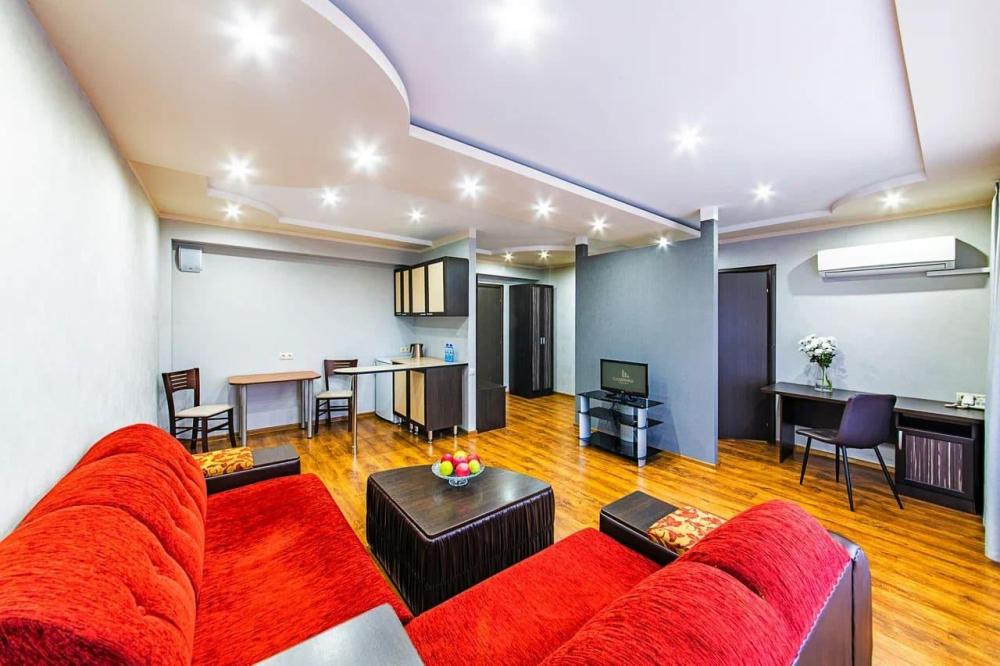 Номер состоит из двух жилых комнат (гостиная с кухонной зоной и спальня), санузел с душевой кабиной. Комплектация: телевизор, телефон, холодильник, продукция индивидуального пользования, фен.