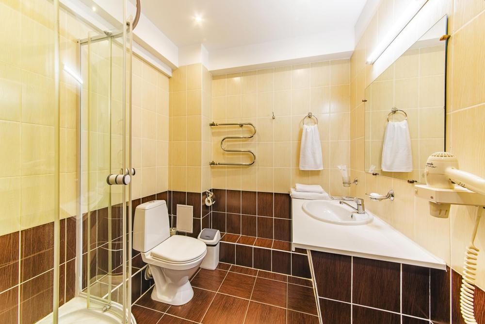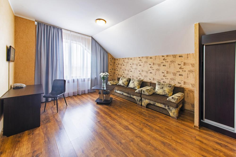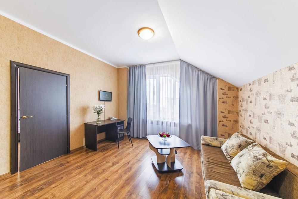 Номер состоит из двух жилых комнат (гостиная и спальня), санузел с душевой кабиной. Комплектация: телевизор, телефон, холодильник, продукция индивидуального пользования, фен.