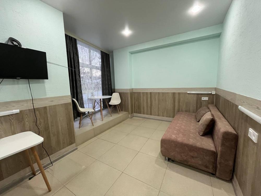В комнате: две односпальные кровати, телевизор тумбы, шкаф, диван, столик. Удобства в виде отдельной комнаты, в блоке на два номера. Вода, средства личной гигиены предоставляются бесплатно.