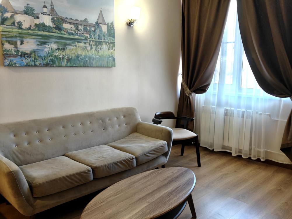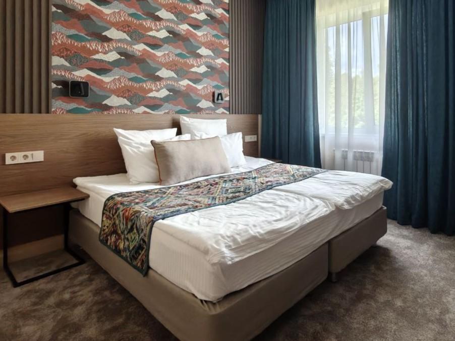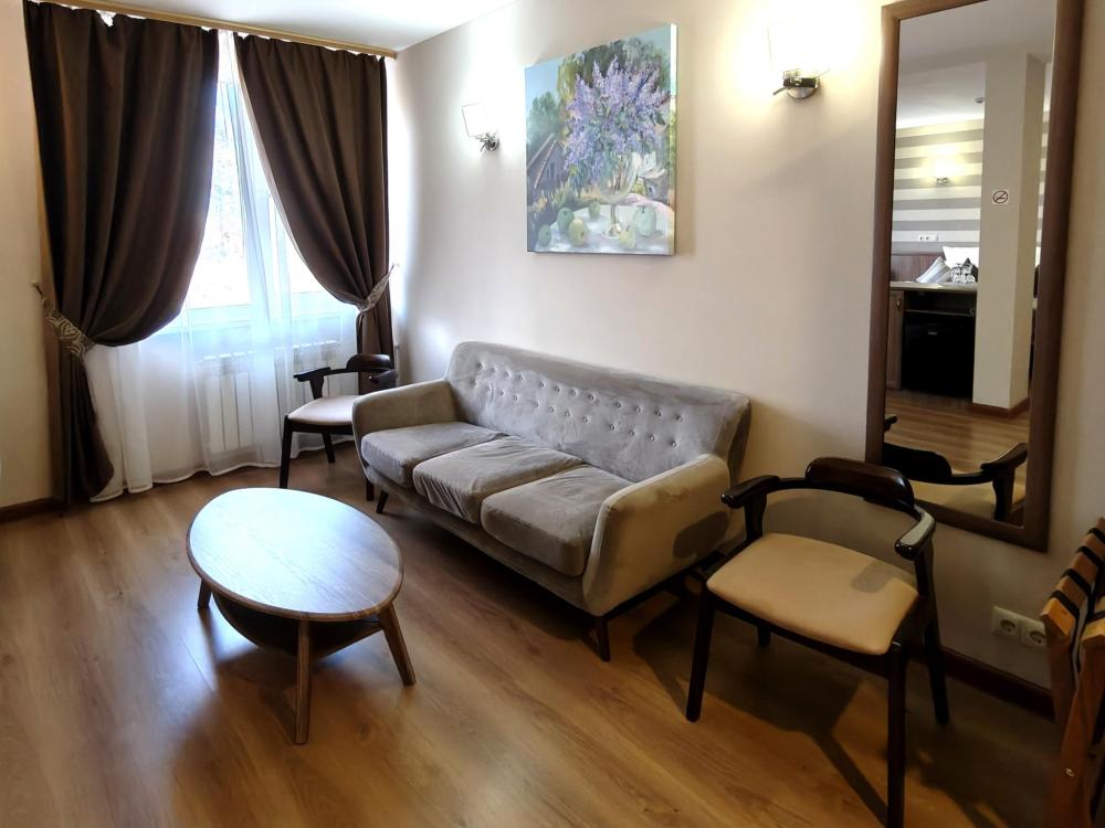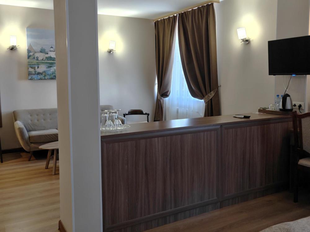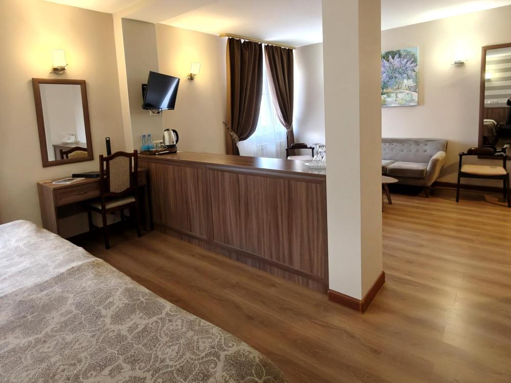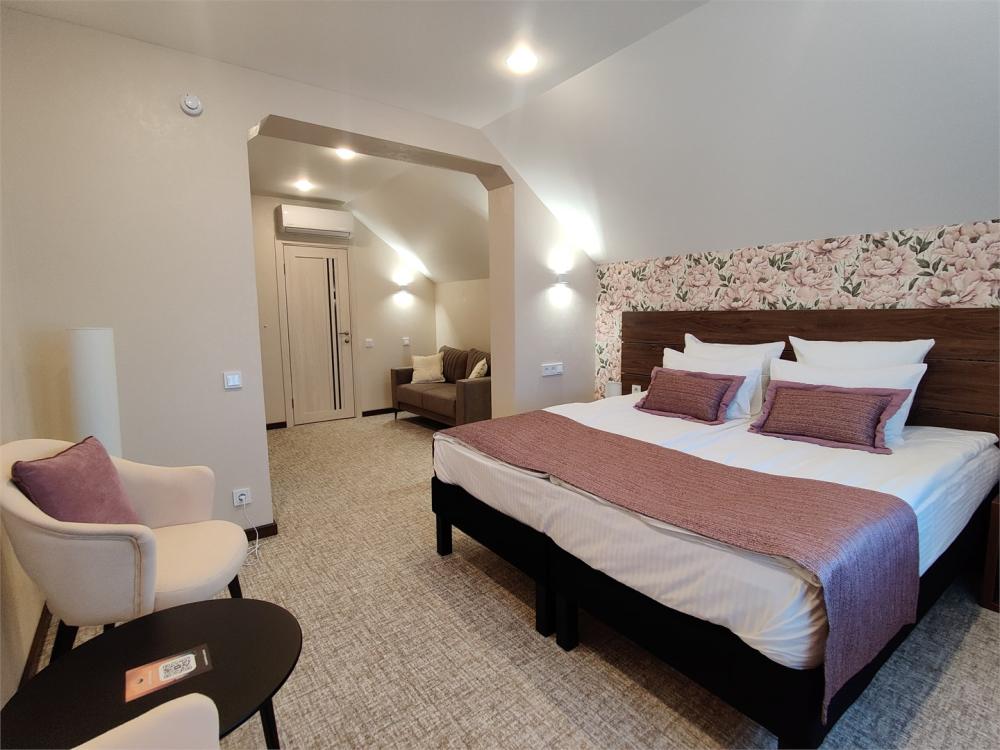 Двухкомнатный номер с двуспальной кроватью и диваном. В номере есть шкаф, мини-холодильник, чайник, ванная комната с душем.