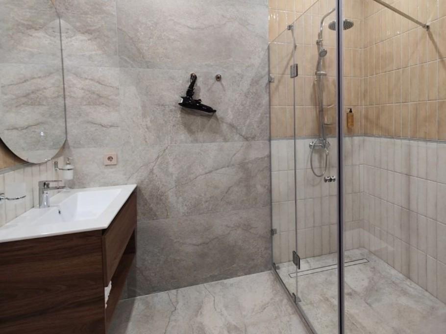 В номере кровать с ортопедическим матрасом, тумба, комод для белья, платяной шкаф, телевизор, санузел с душевой кабиной.