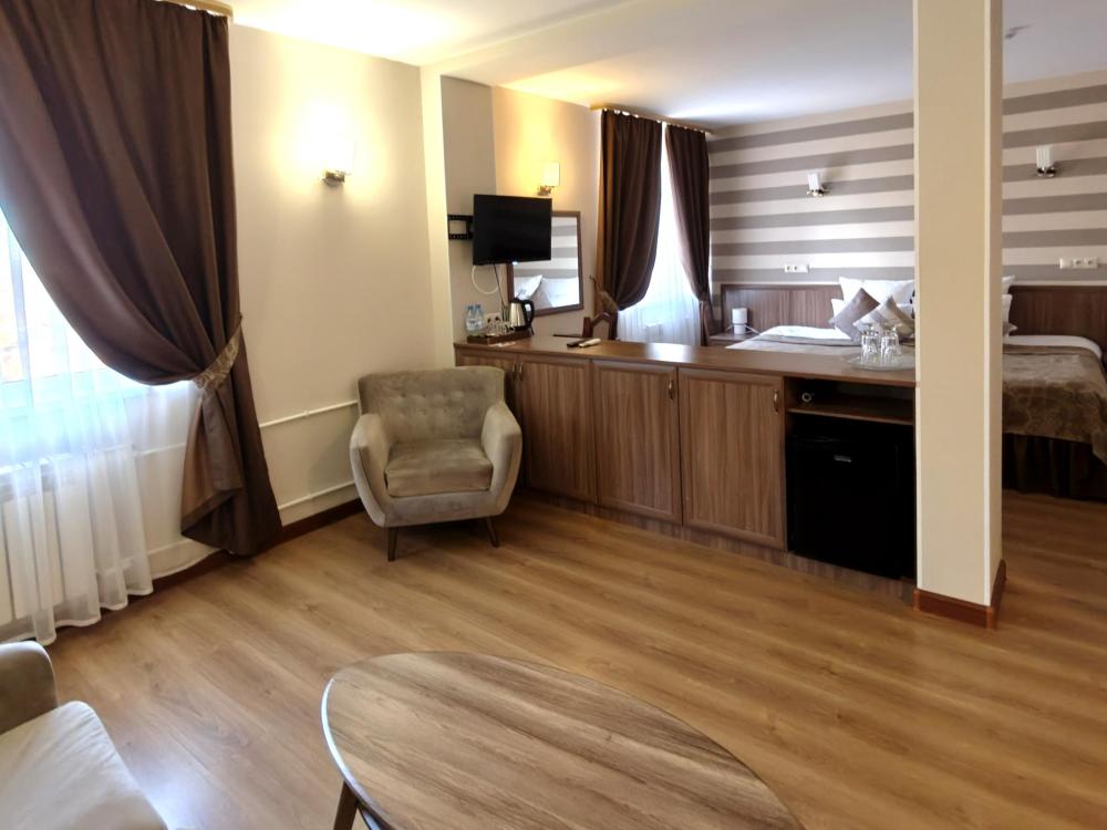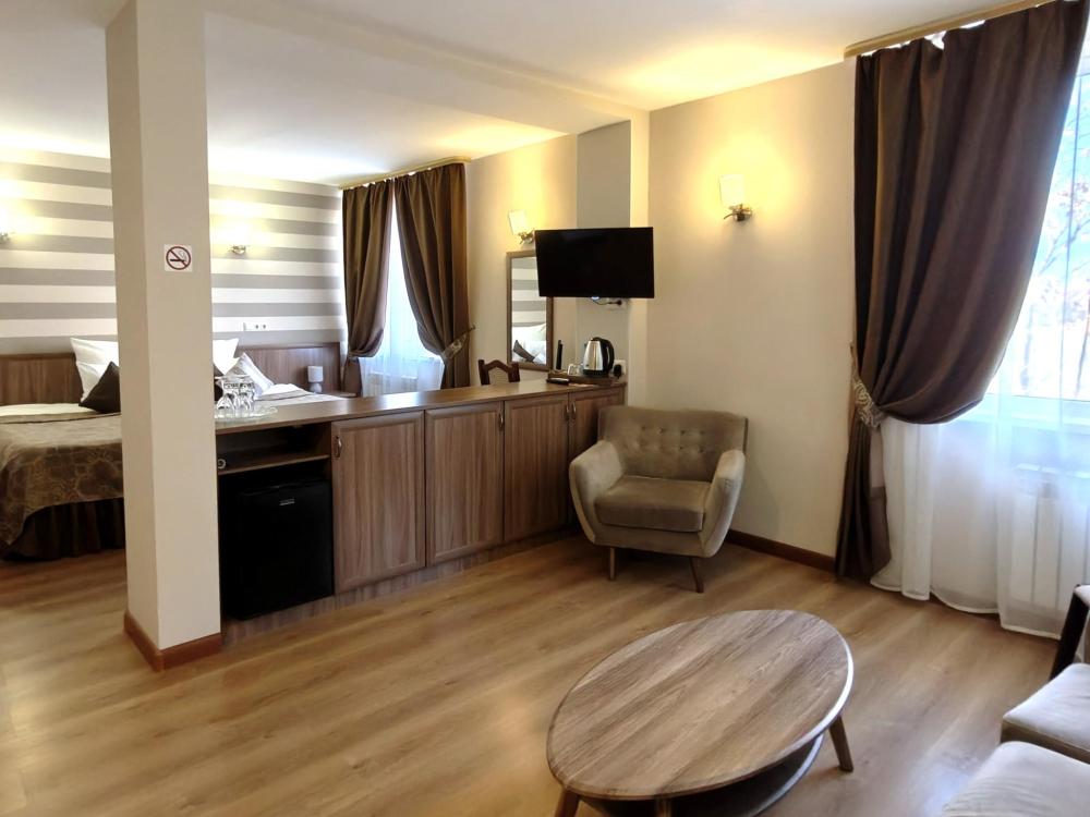 В номере есть большая двуспальная кровать, выделенная гостиная зона с мягкой мебелью. Спальная и гостиная зоны разделены мебельной перегородкой. В номере есть возможность размещения дополнительного места.