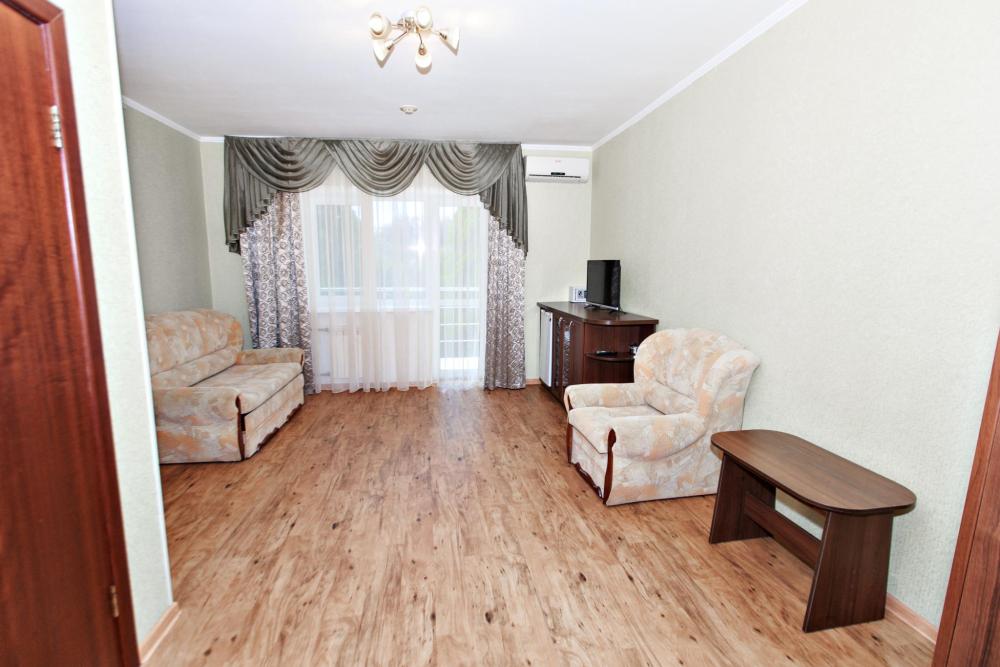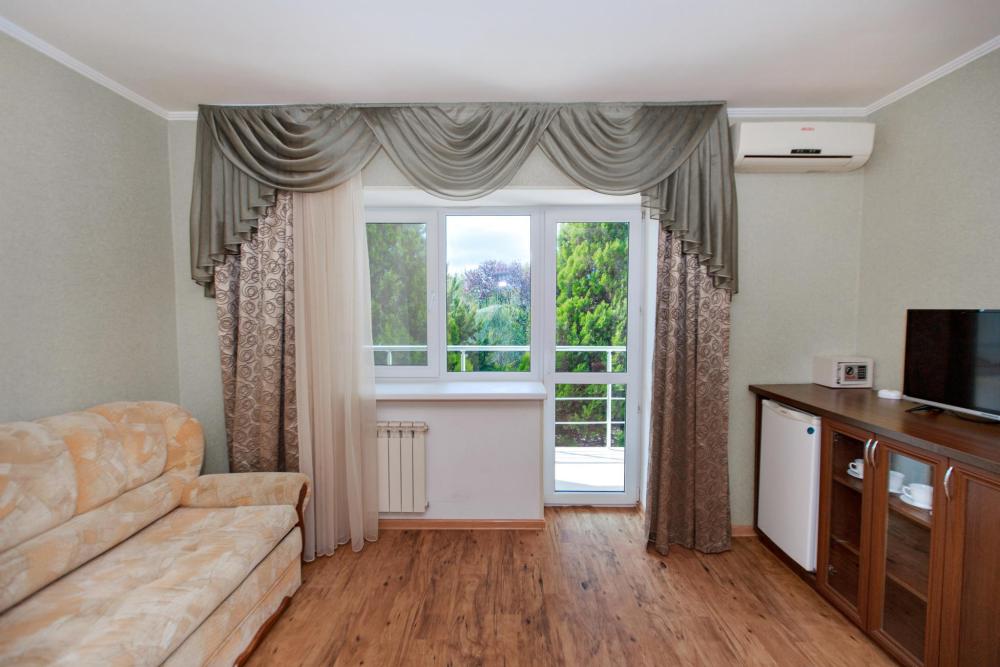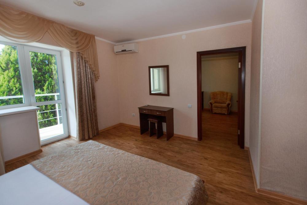 Комфортная двухкомнатная комната с видом на море и на внутренний ухоженный дворик. Уютная обстановка номера позволит расслабиться и полноценно отдохнуть. А с балкона насладиться невероятными закатами побережья. Прекрасно подойдет для семьи из трех-пяти человек.