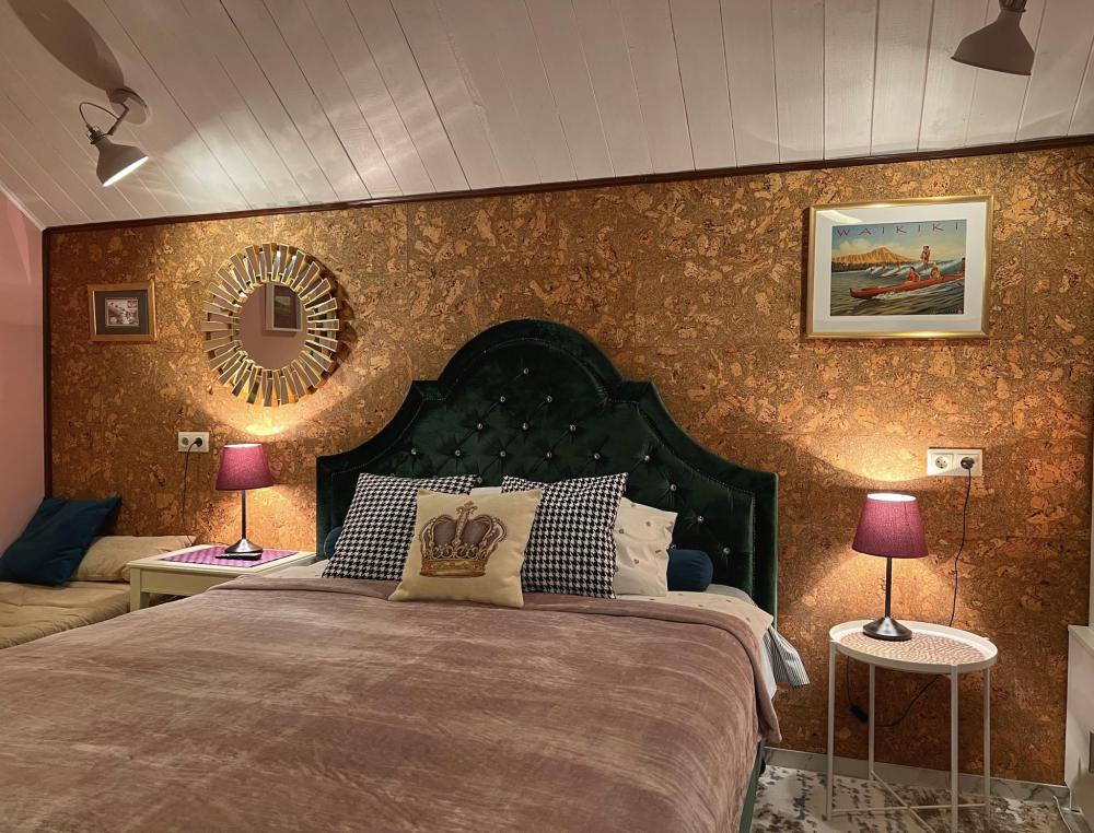 Семейная комната с двуспальной кроватью и диваном. Комната оснащена телевизором, местом для хранения одежды, постельным бельем, душевой кабиной, предоставляются туалетно-косметические принадлежности.