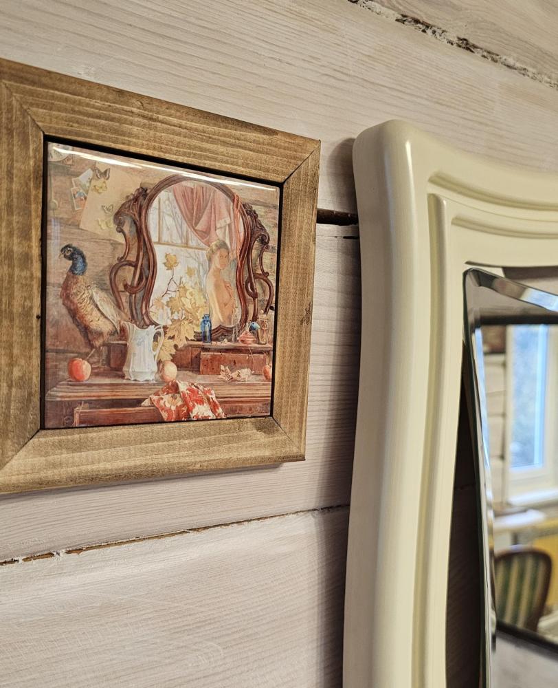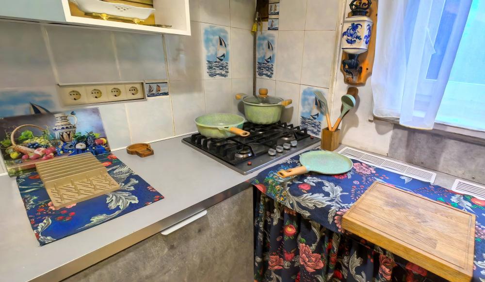 Необычный дом он как бы растет из земли. На крыше растет трава, круглые окна и двери, антикварный буфет. комод и туалетный столик.