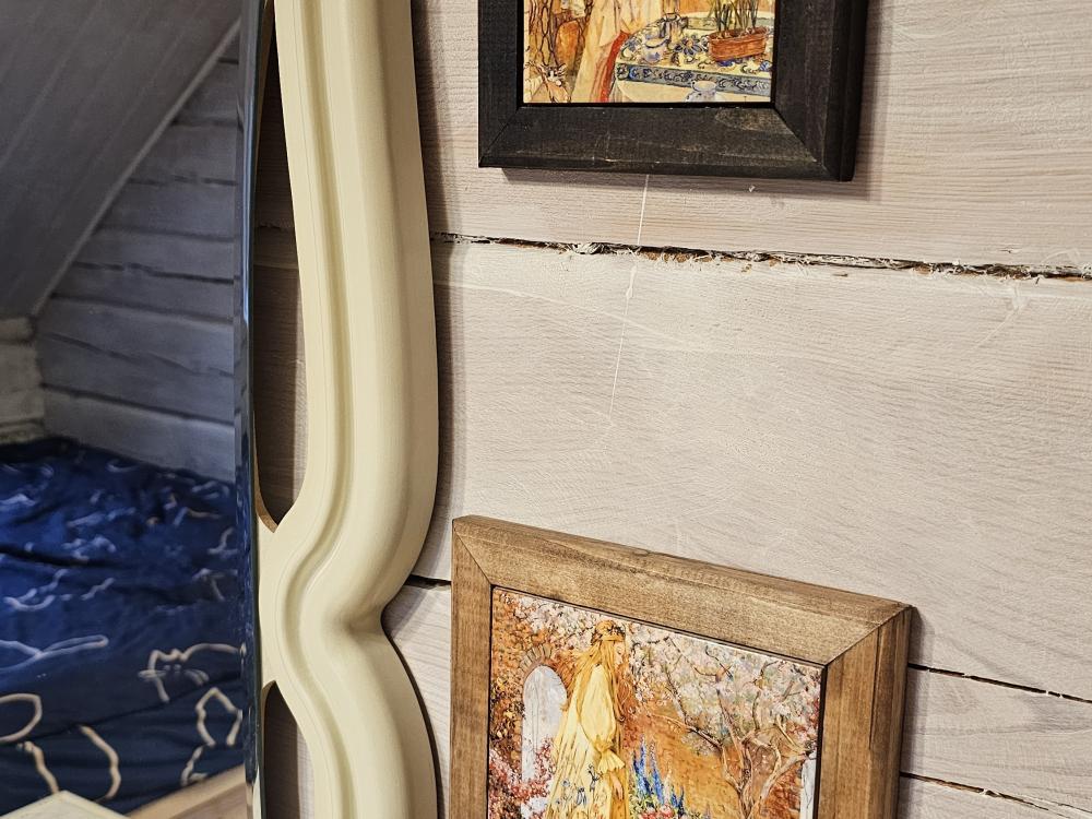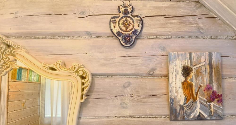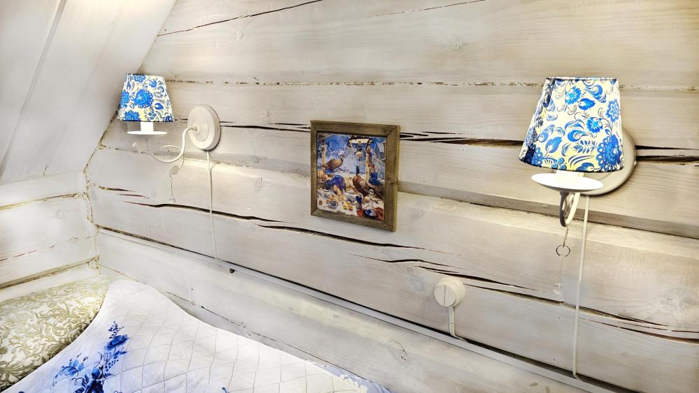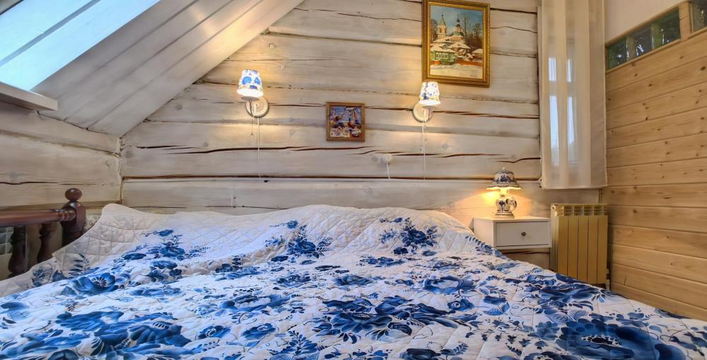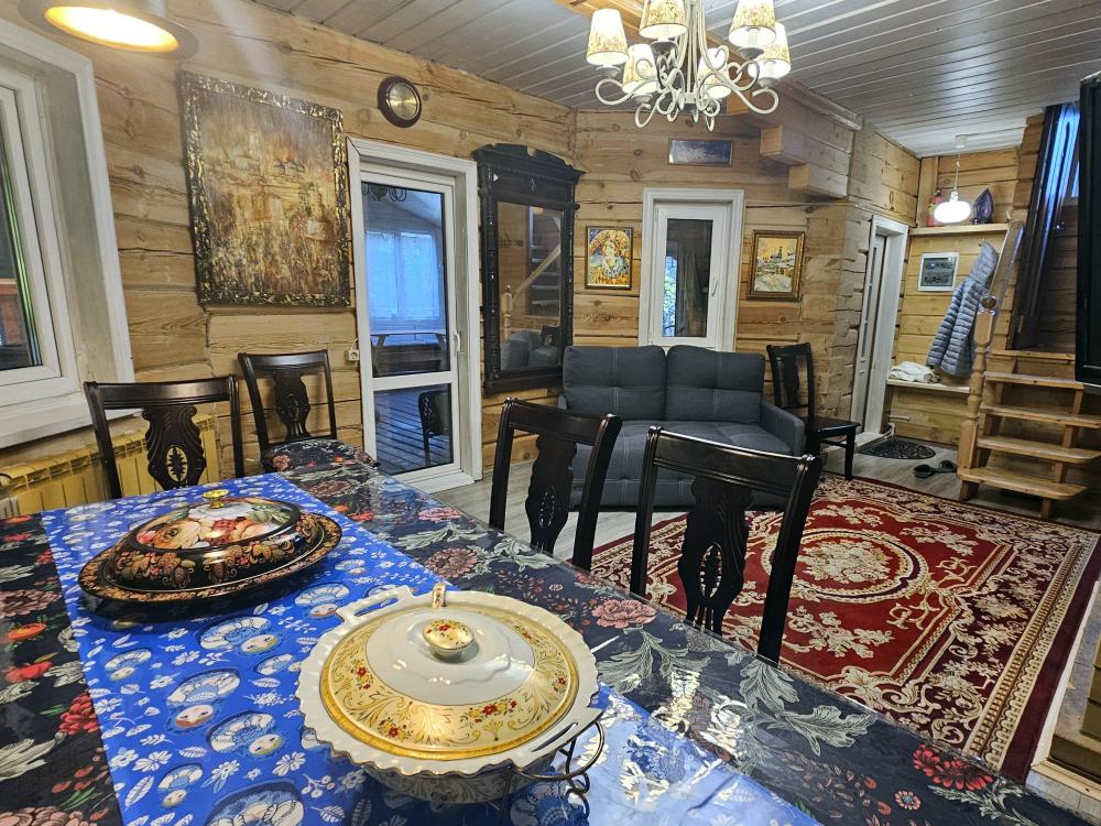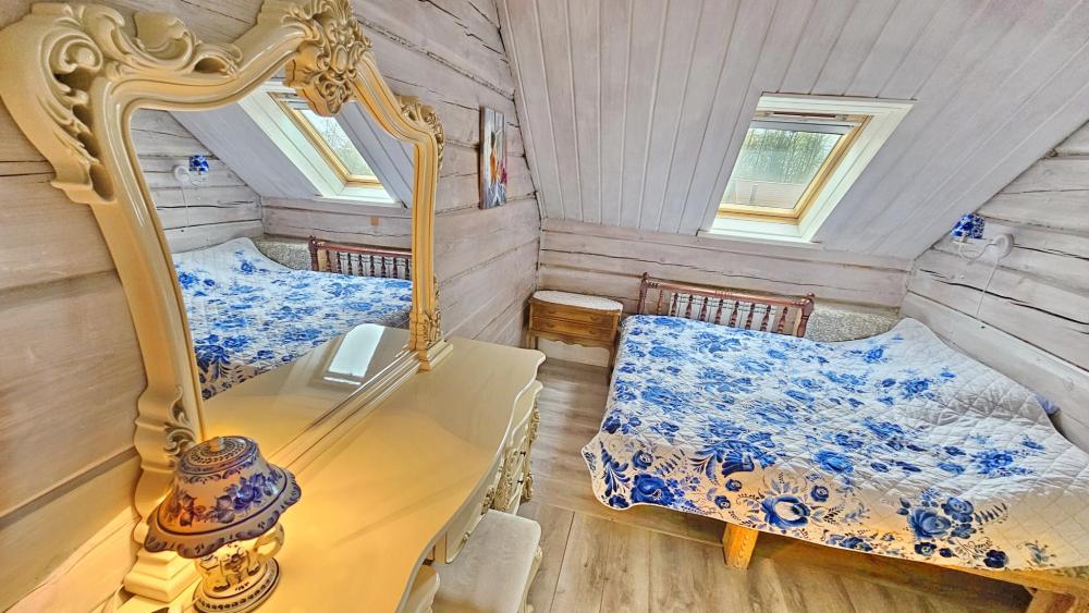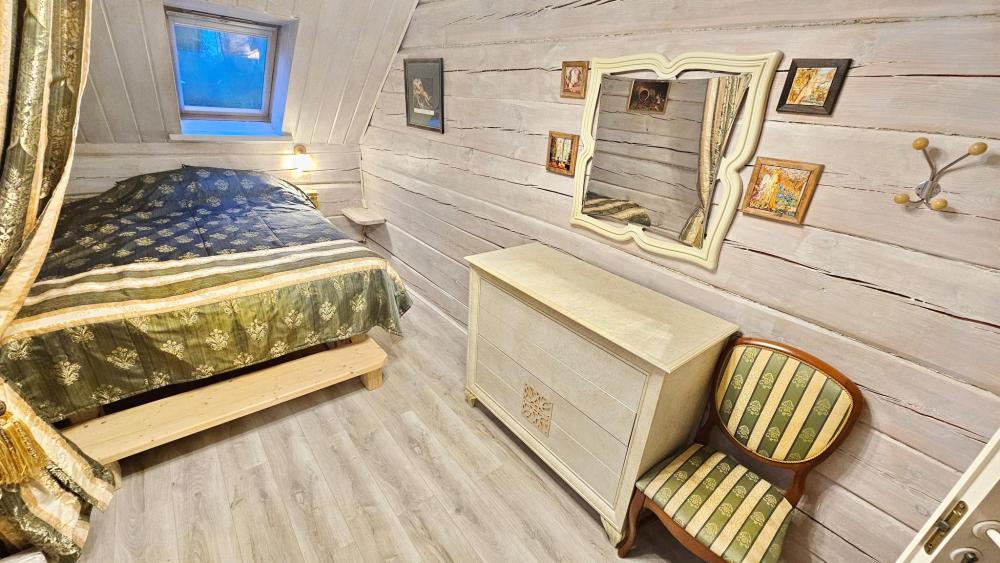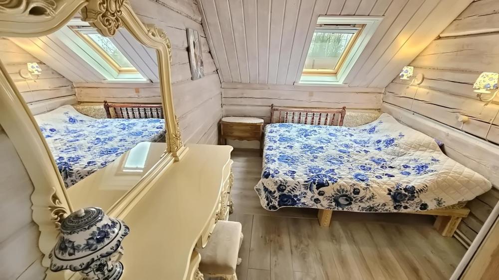 На 1 этаже: кухня с посудой, приборами, плитой, посудомойкой и стиралкой. Столовая с телевизором и камином. Баня с душевой, туалетом и парной. На 2 этаже: спальня с большой кроватью, вторая спальня с двумя большими кроватями, туалет, тёплая лоджия - там два двуспальных места.