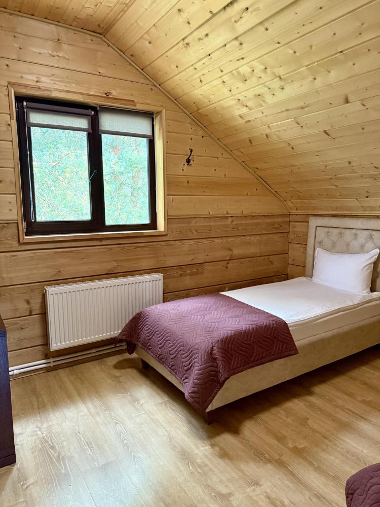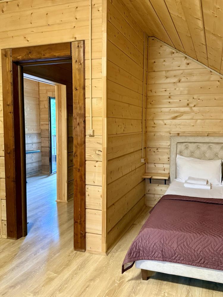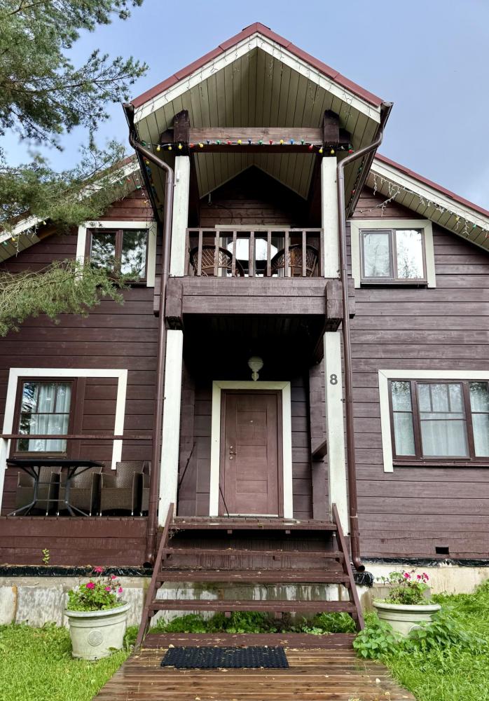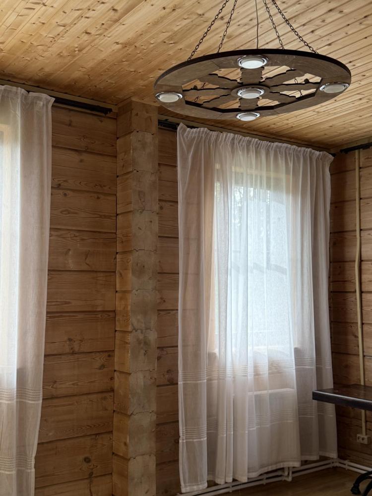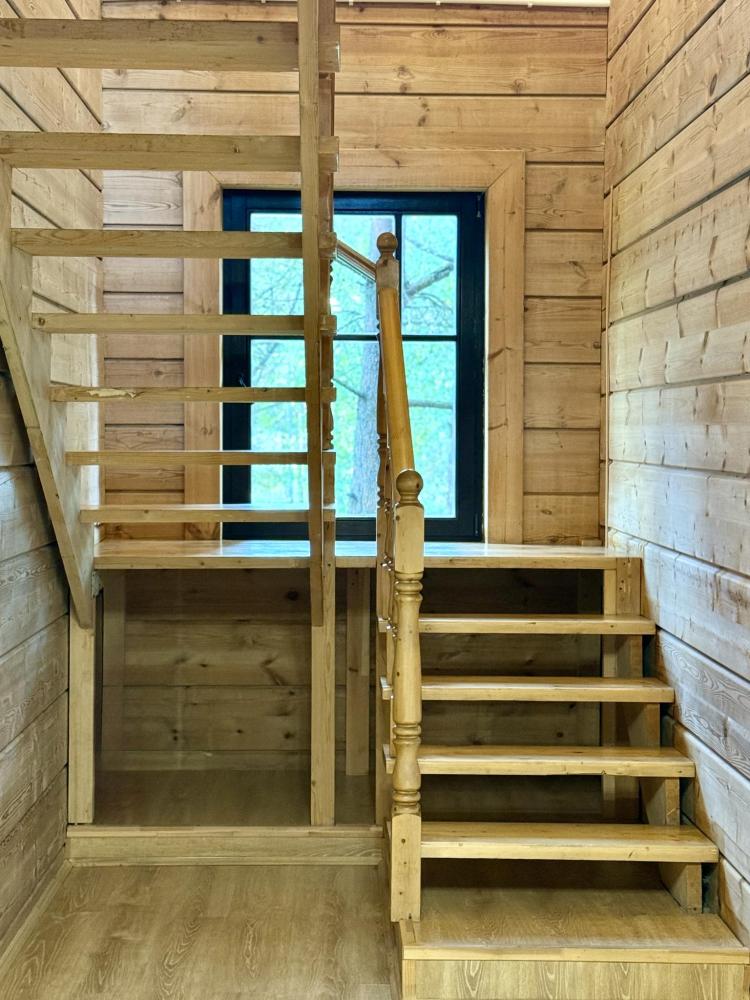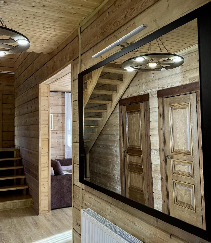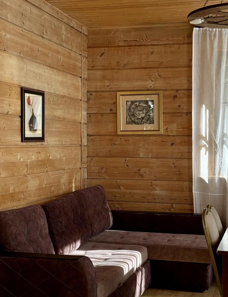 Коттедж из клееного бруса с четырьмя спальными комнатами и террасой, общая площадь 130 кв м. Вместимость коттеджа - 8 персон, максимально 10 персон На первом этаже располагаются : спальная комната, два санузла, гардеробная и большая гостиная с кухонным уголком, оборудованным варочной панелью и духовым шкафом, холодильником, эл.чайником и микроволновой печью. Гостиная оснащена обеденным столом на 6 персон , угловым диваном и телевизором. На втором этаже расположены три спальные комнаты, одна из оснащена двумя раздельными кроватями, санузел с душевой кабиной и выход на балкон.