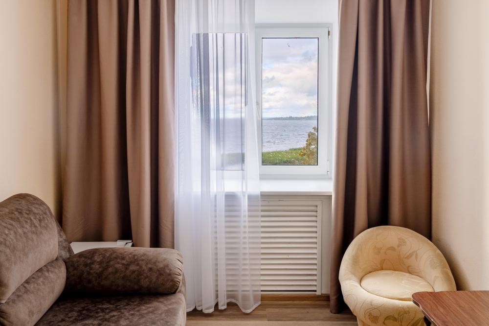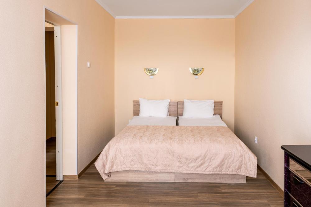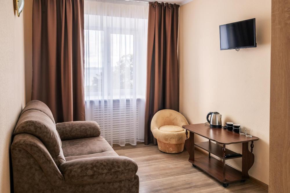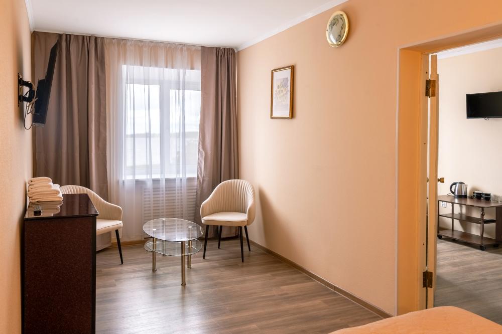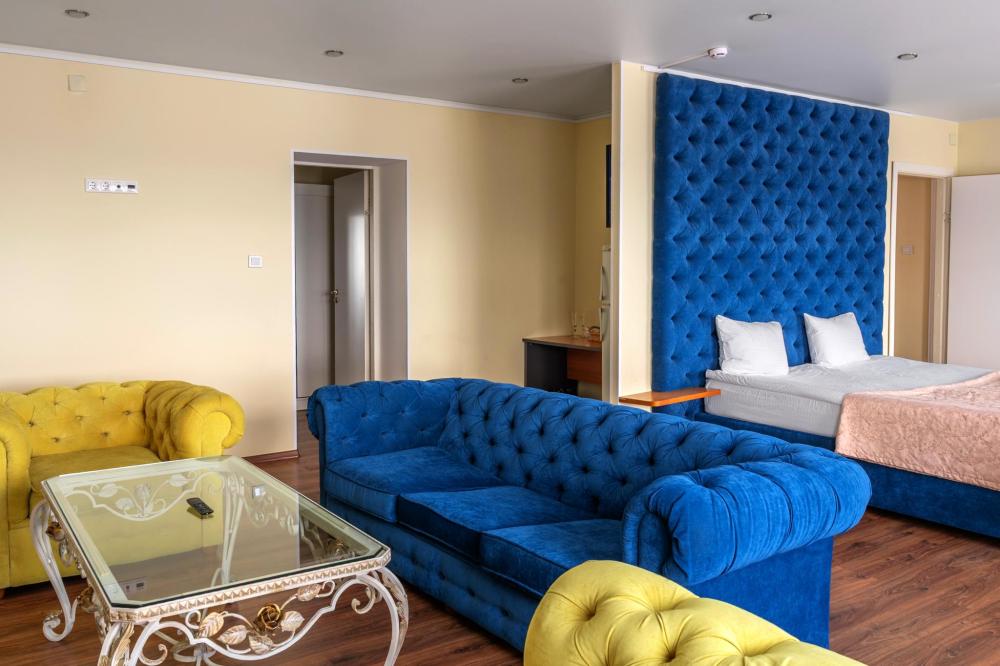 Однокомнатный просторный номер с выделенной гостиной зоной, укомплектованной мягкой мебелью, журнальным столом и ЖК-телевизором, холодильником, эл.чайником с набором чайных принадлежностей. В спальной зоне большая двуспальная кровать. Санузел раздельный, в ванной комнате душевая кабина и ванна.