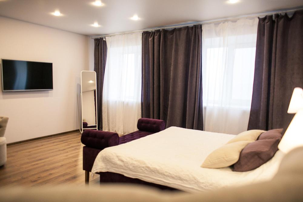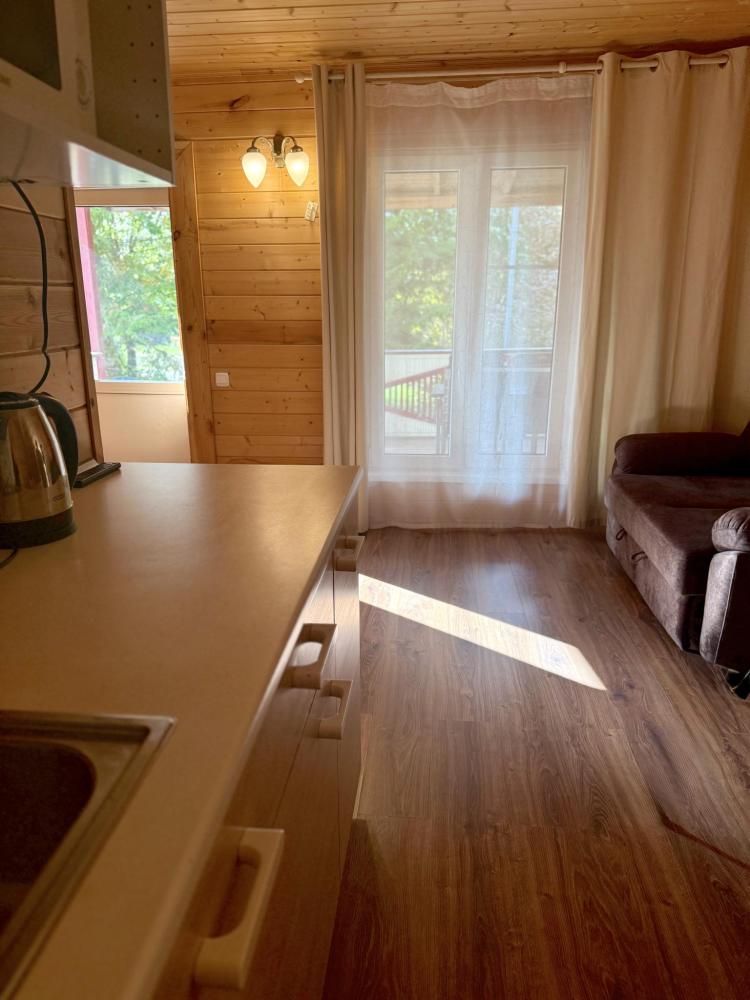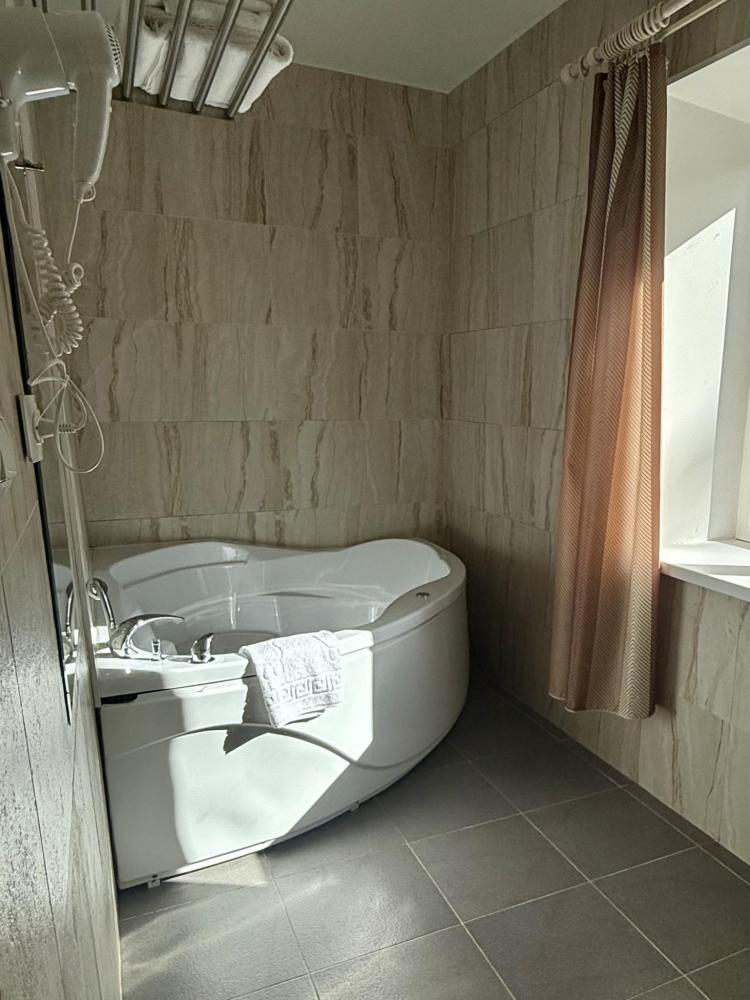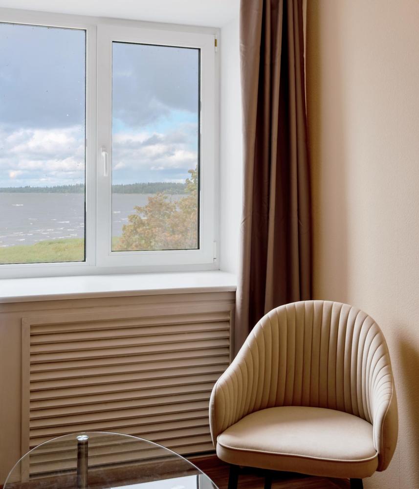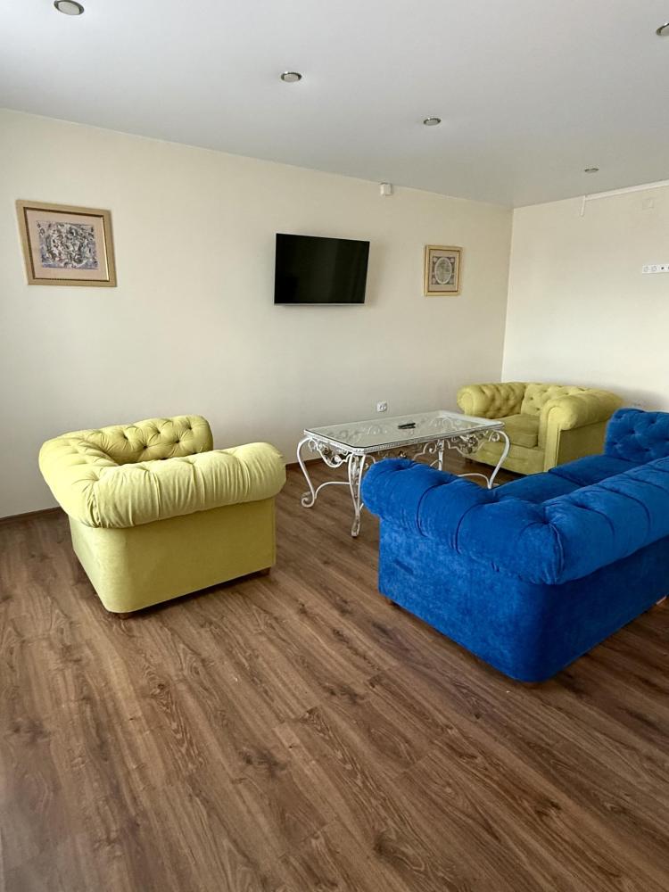 Однокомнатный просторный номер с выделенной гостиной зоной, укомплектованной мягкой мебелью, журнальным столом и ЖК-телевизором, холодильником, эл.чайником с набором чайных принадлежностей. В спальной зоне большая двуспальная кровать. Санузел раздельный, в ванной комнате душевая кабина и ванна.