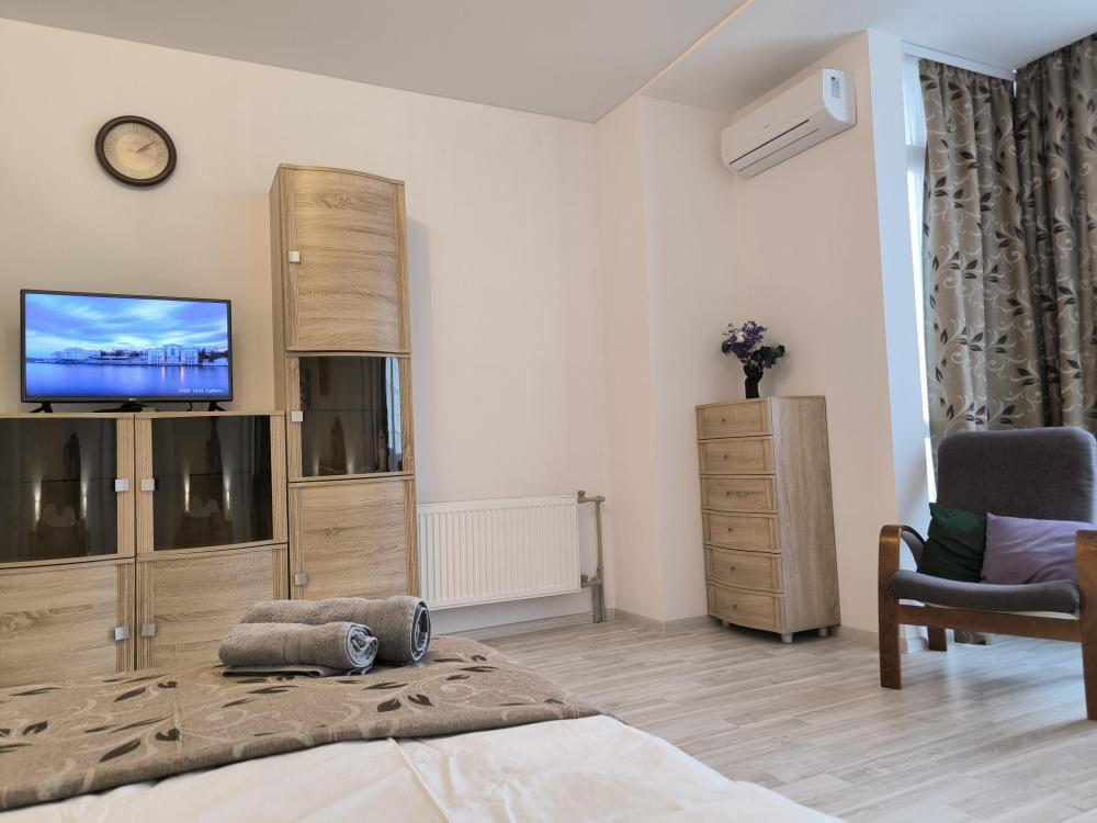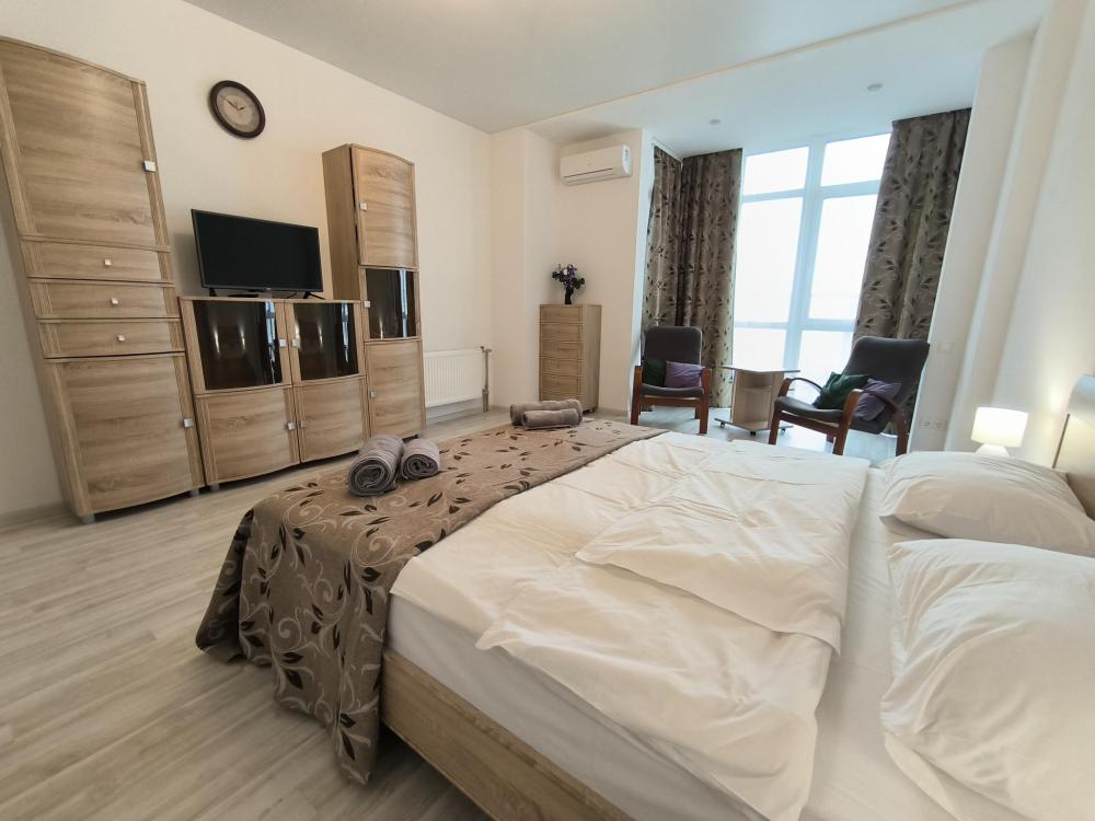 Спальные места (2+2): двуспальная кровать 160х200 с ортопедическим матрасом, в меру жесткий диван-кровать (140х200). Адрес: пр. Античный 64\4. Общая площадь 57 кв.м. В комнатах WI-FI, LED телевизор, цифровое HD ТВ, кондиционер, необходимая мебель и техника для комфортного отдыха. Имеется балкончик.
