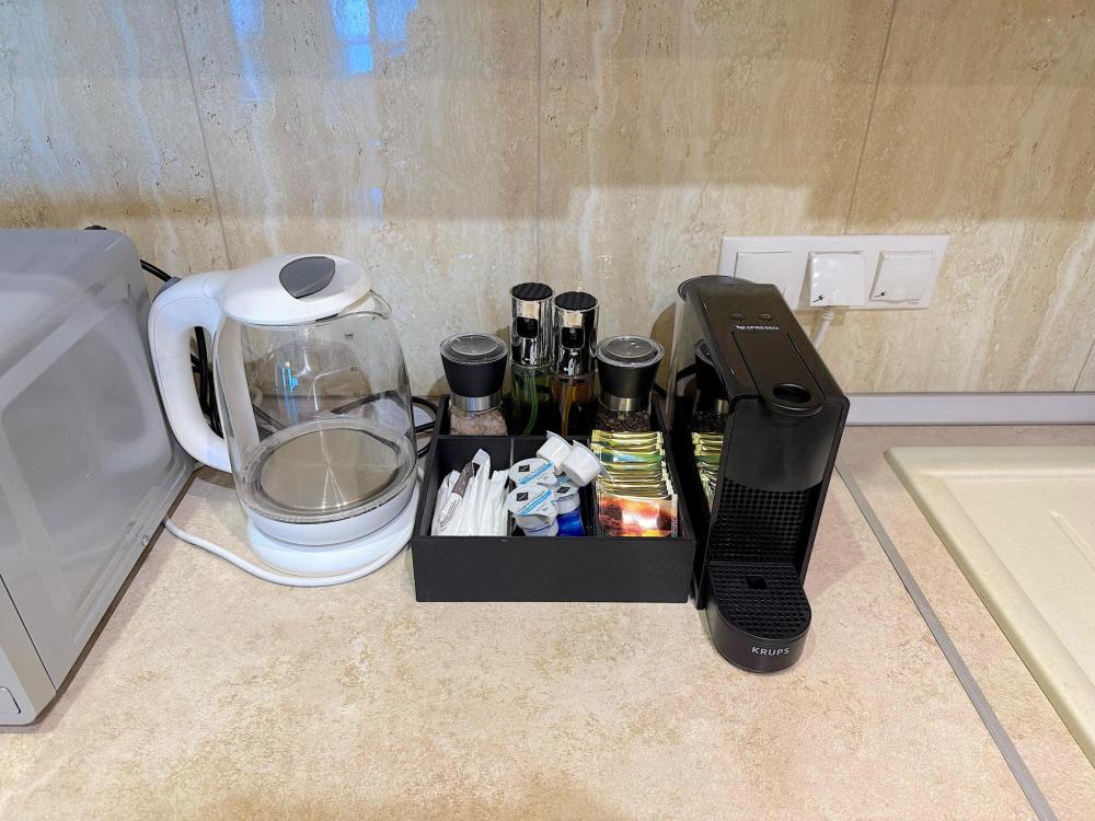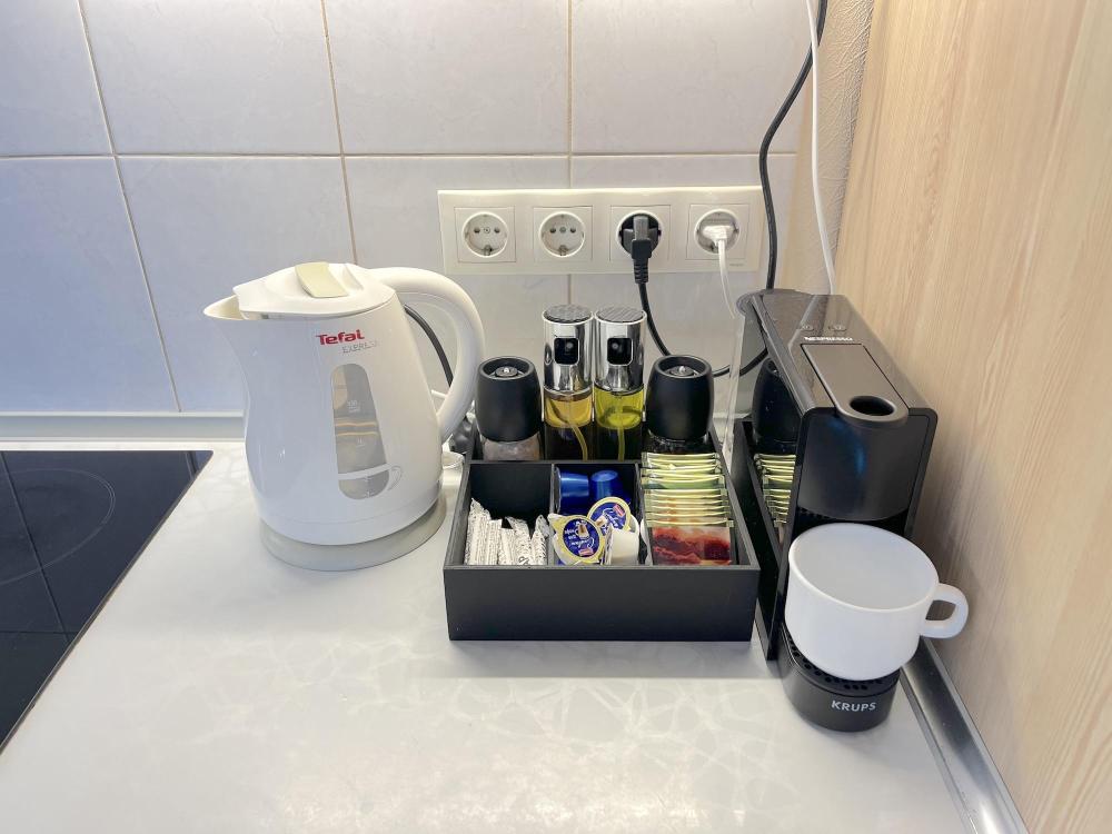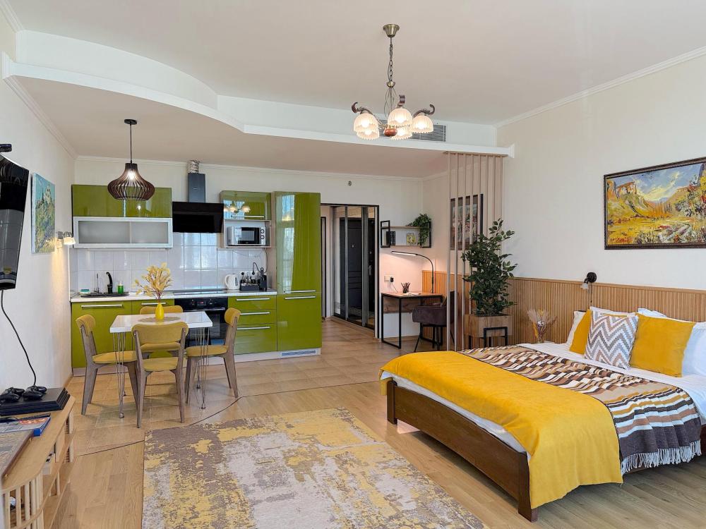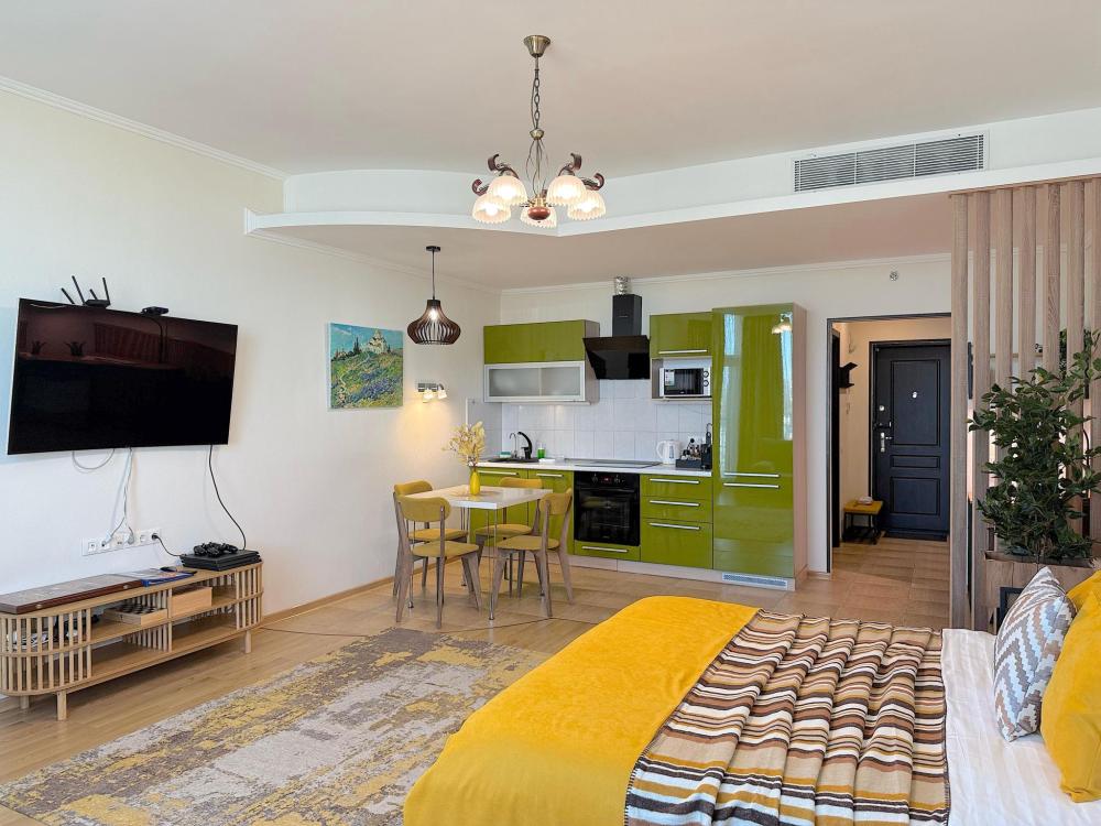 Апартаменты вместимостью до 4 человек. В апартаментах есть все, что необходимо для комфортного проживания: двуспальная кровать с ортопедическим матрацем, раскладной диван, сатиновое постельное бельё, комплекты махровых полотенец, махровые халаты и тапочки для взрослых гостей, кондиционер, телевизор, Wi-Fi, сейф, холодильник, варочная поверхность, духовой шкаф, микроволновая печь, мультиварка, электрочайник и капсульная кофемашина, фильтр для воды, посуда, обеденный стол и стулья, шкаф-купе, гигиенические и гладильные принадлежности, стиральная машина, сушилка для белья, фен.