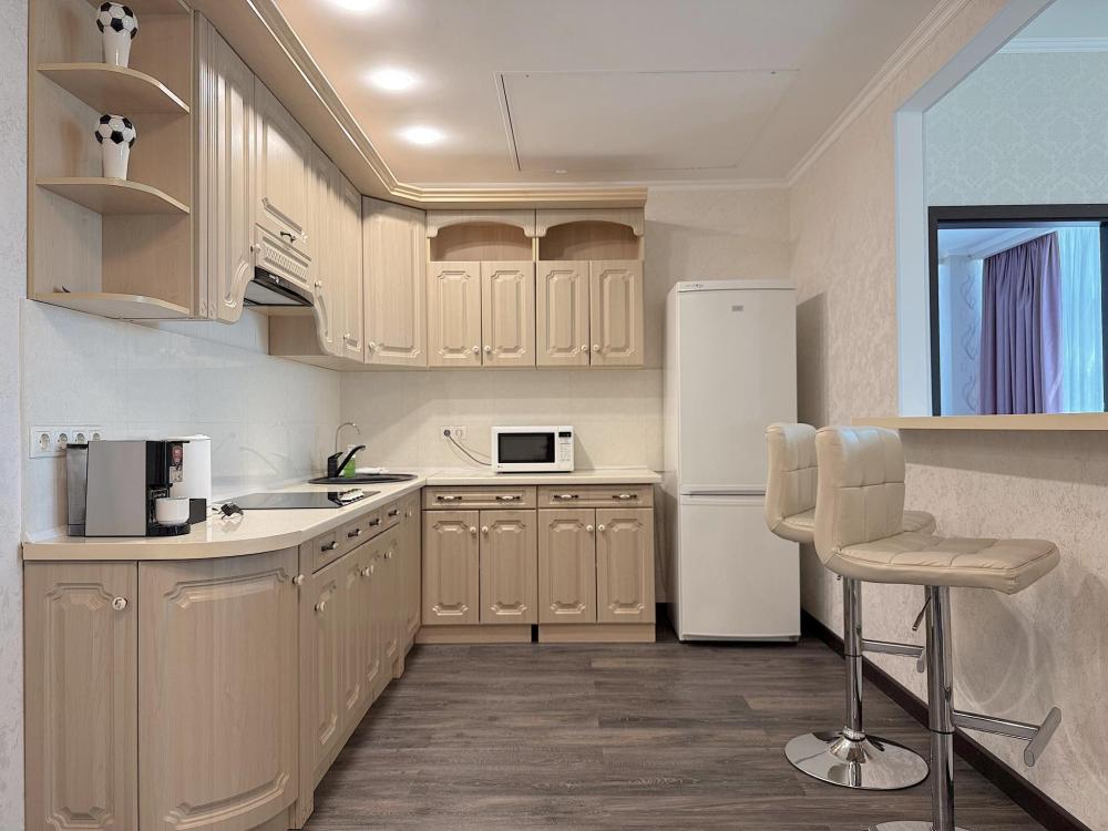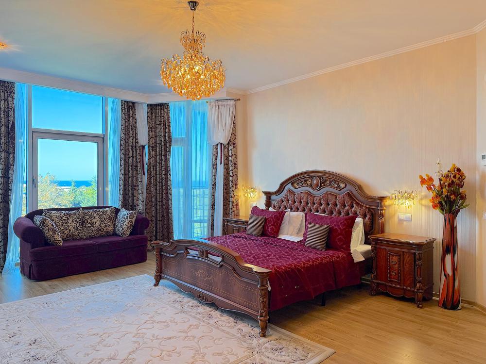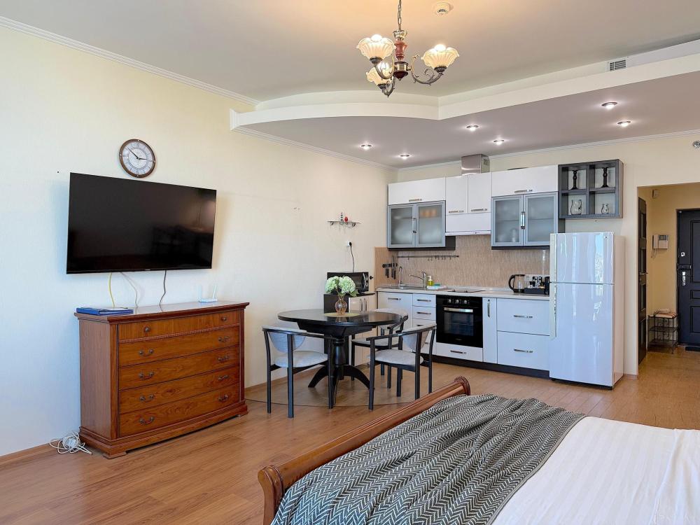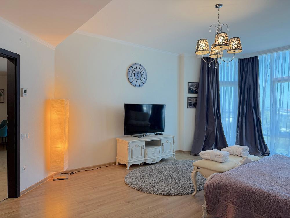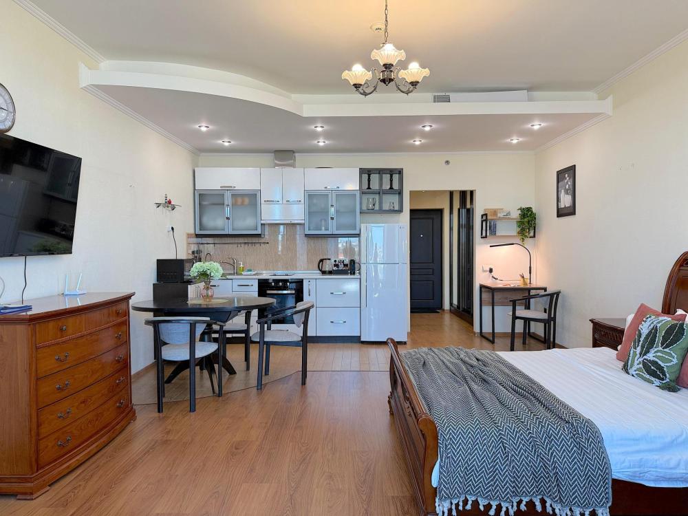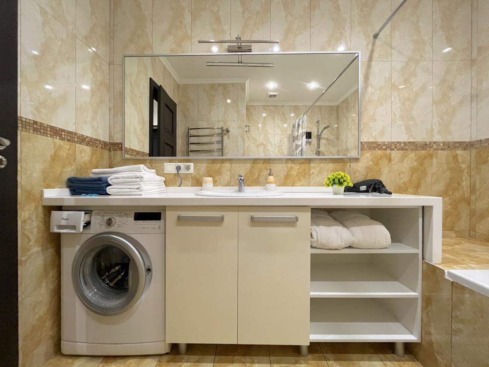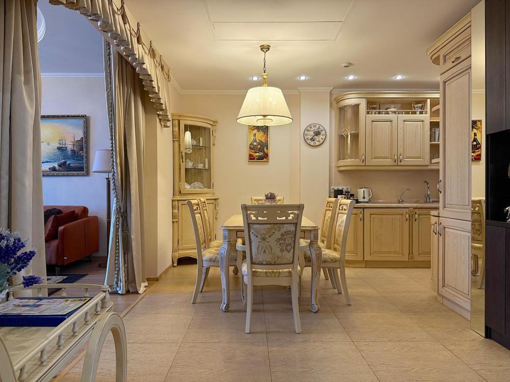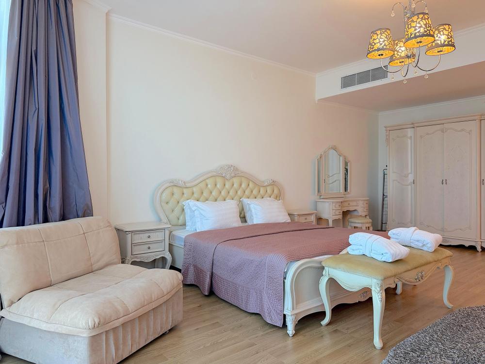 Апартаменты вместимостью до 4 человек. В апартаментах есть все, что необходимо для комфортного проживания: двуспальная кровать с ортопедическим матрацем, раскладной диван, сатиновое постельное бельё, комплекты махровых полотенец, махровые халаты и тапочки для взрослых гостей, кондиционер, телевизор, Wi-Fi, приставка SonyPlaystation 4.0, сейф, холодильник, варочная поверхность, духовой шкаф, микроволновая печь, мультиварка, электрочайник и капсульная кофемашина, фильтр для воды, посуда, обеденный стол и стулья, шкаф-купе, гигиенические и гладильные принадлежности, стиральная машина, сушилка для белья, фен.