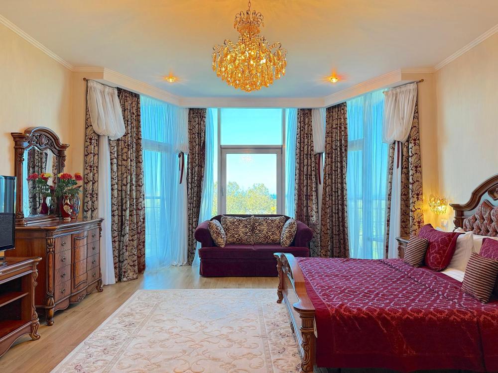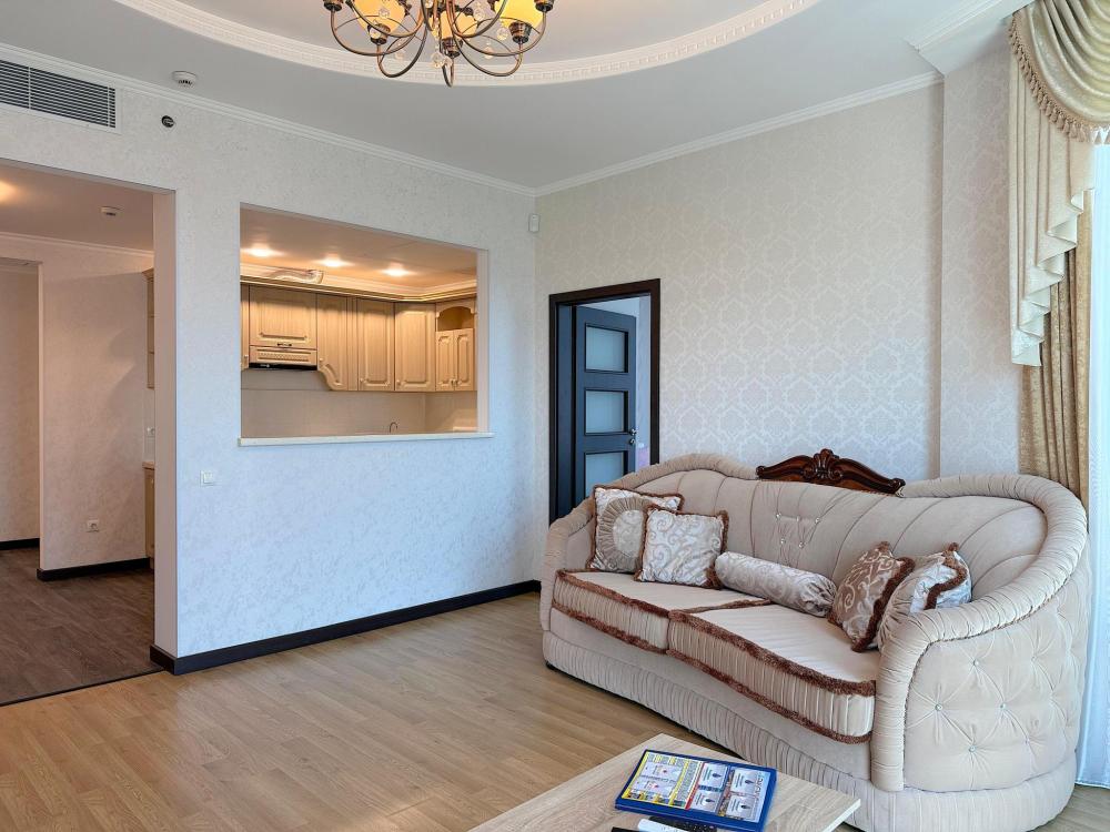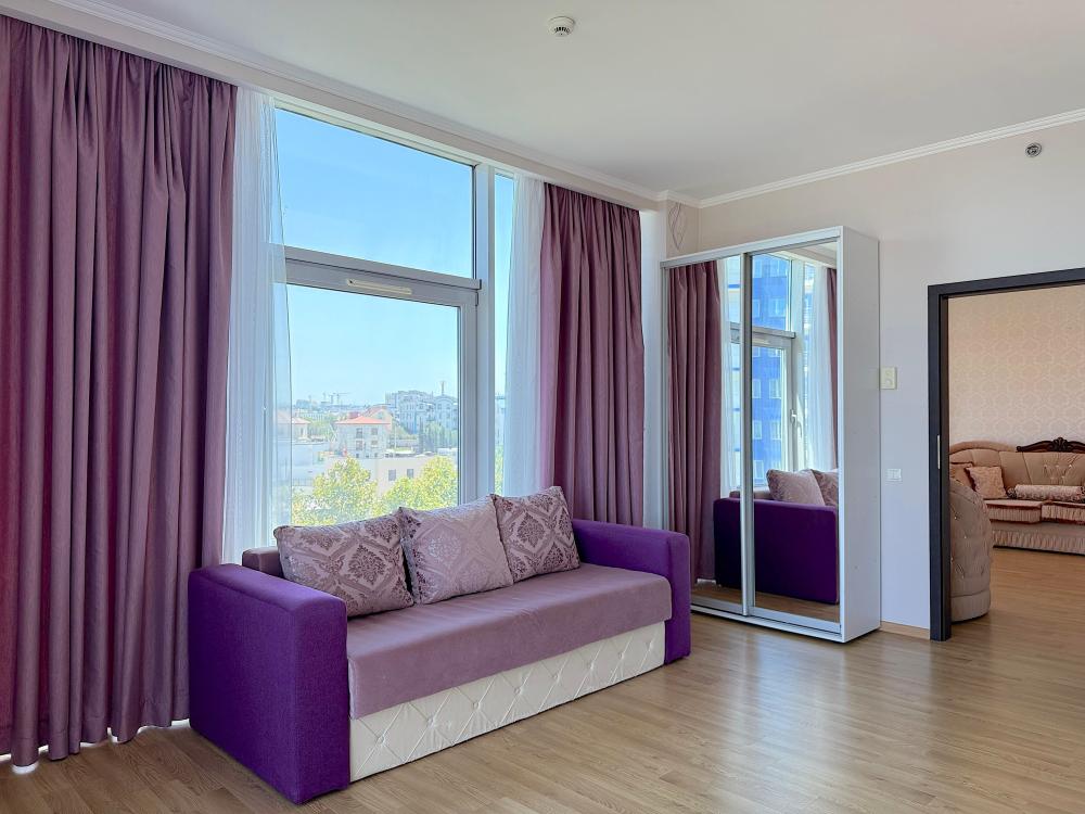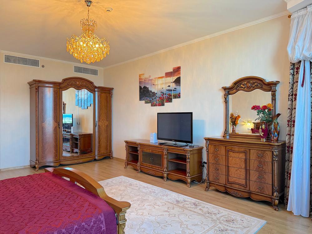 Двухкомнатные апартаменты вместимостью до 6 человек. В апартаментах есть все, что необходимо для комфортного проживания: двуспальная кровать с ортопедическим матрацем, два раскладных дивана, сатиновое постельное бельё, комплекты махровых полотенец, махровые халаты и тапочки для взрослых гостей, кондиционер, телевизор, Wi-Fi, сейф, холодильник, варочная поверхность, духовой шкаф, микроволновая печь, мультиварка, электрочайник и капсульная кофемашина, фильтр для воды, посуда, обеденный стол и стулья, шкаф-купе, гигиенические и гладильные принадлежности, стиральная машина, сушилка для белья, фен.