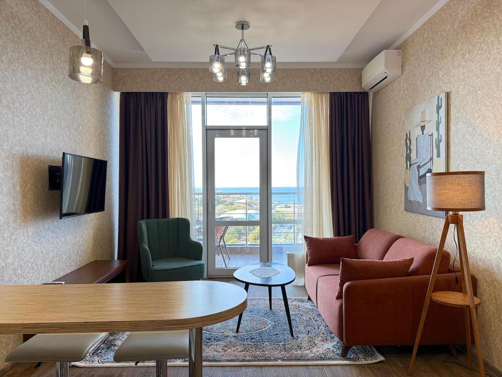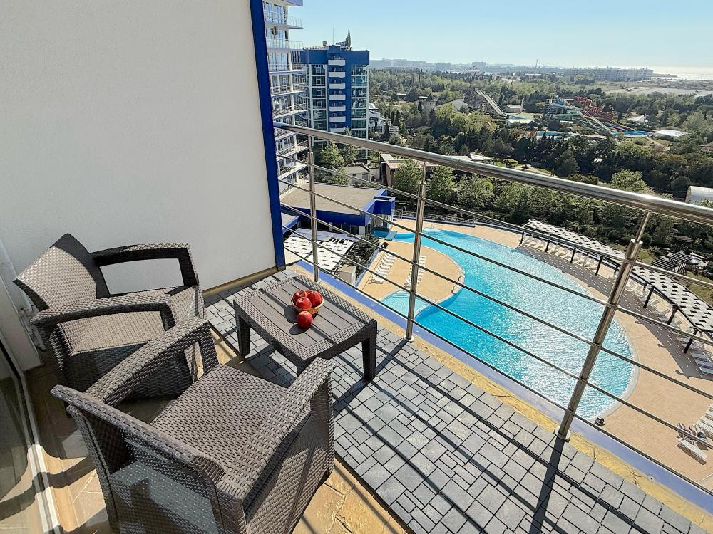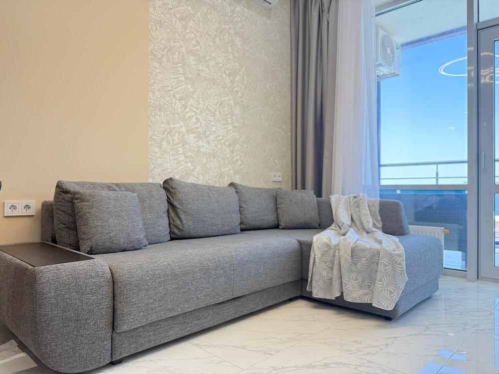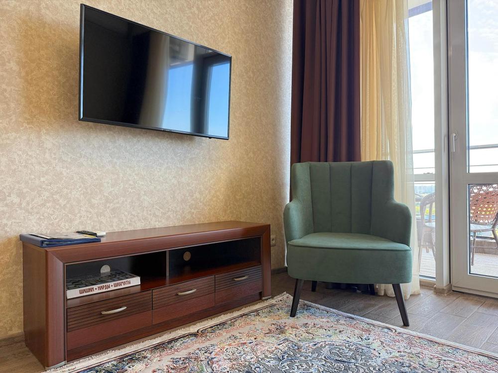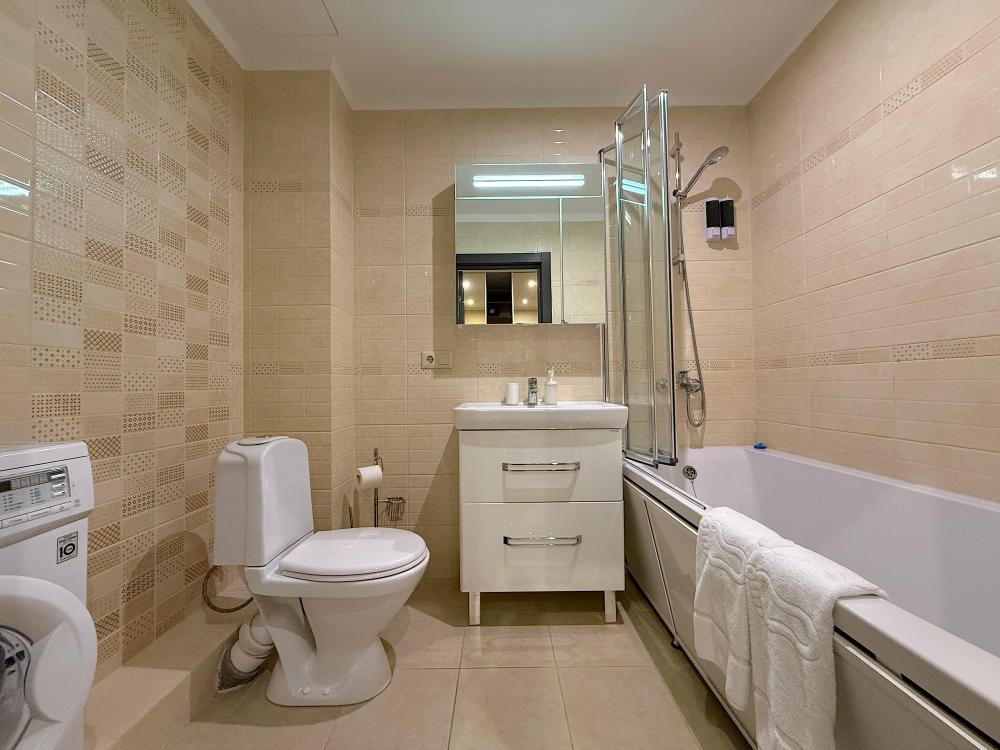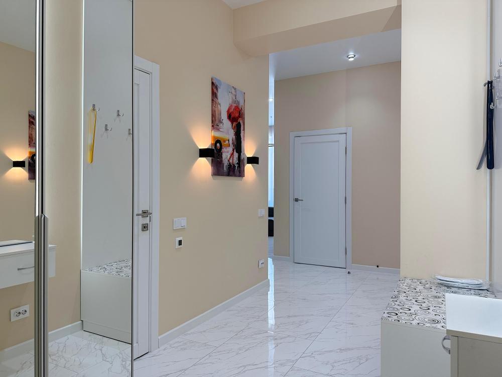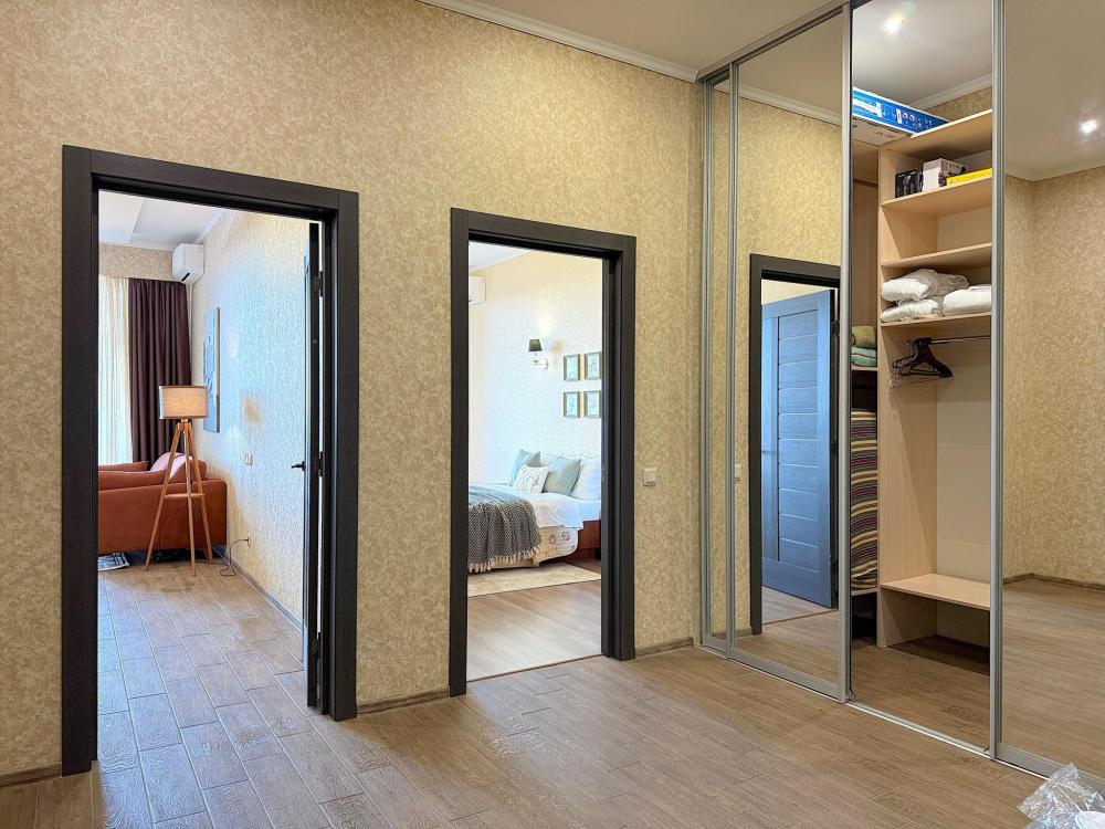 Апартаменты вместимостью до 4 человек. В апартаментах есть все, что необходимо для комфортного проживания: двуспальная кровать, раскладной диван, сатиновое постельное белье, комплекты махровых полотенец, махровые халаты и тапочки для взрослых, балкон и два кресла со столиком, кондиционер, телевизор, Wi-Fi, игровая приставка SonyPlayStation 5, шкаф-купе, холодильник, варочная поверхность, микроволновая печь, электрочайник, капсульная кофемашина, посуда, посудомоечная машина, гигиенические и гладильные принадлежности, теплые полы, стиральная машина, фен.