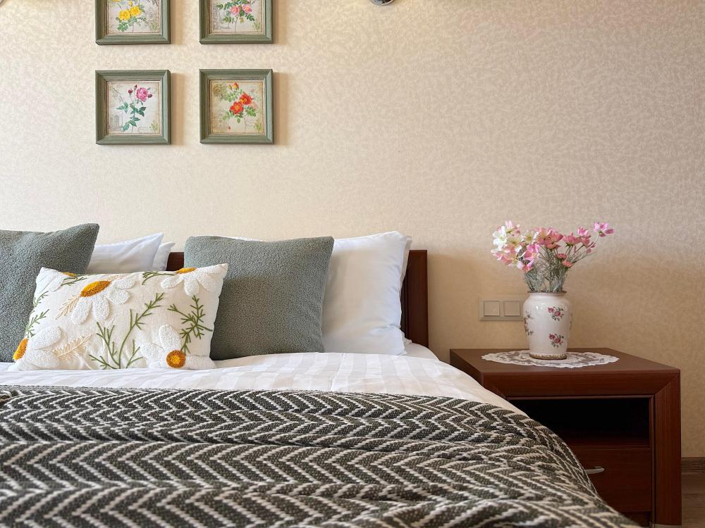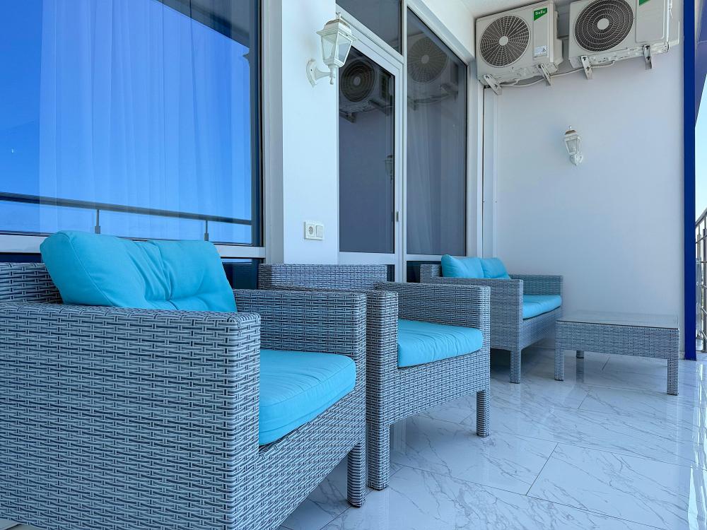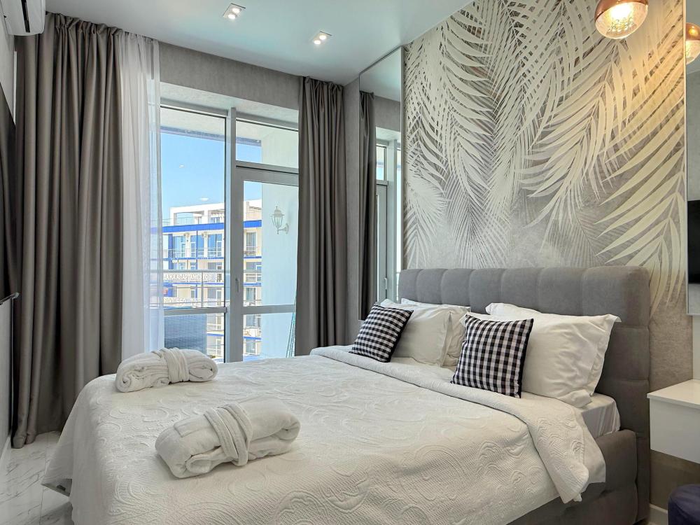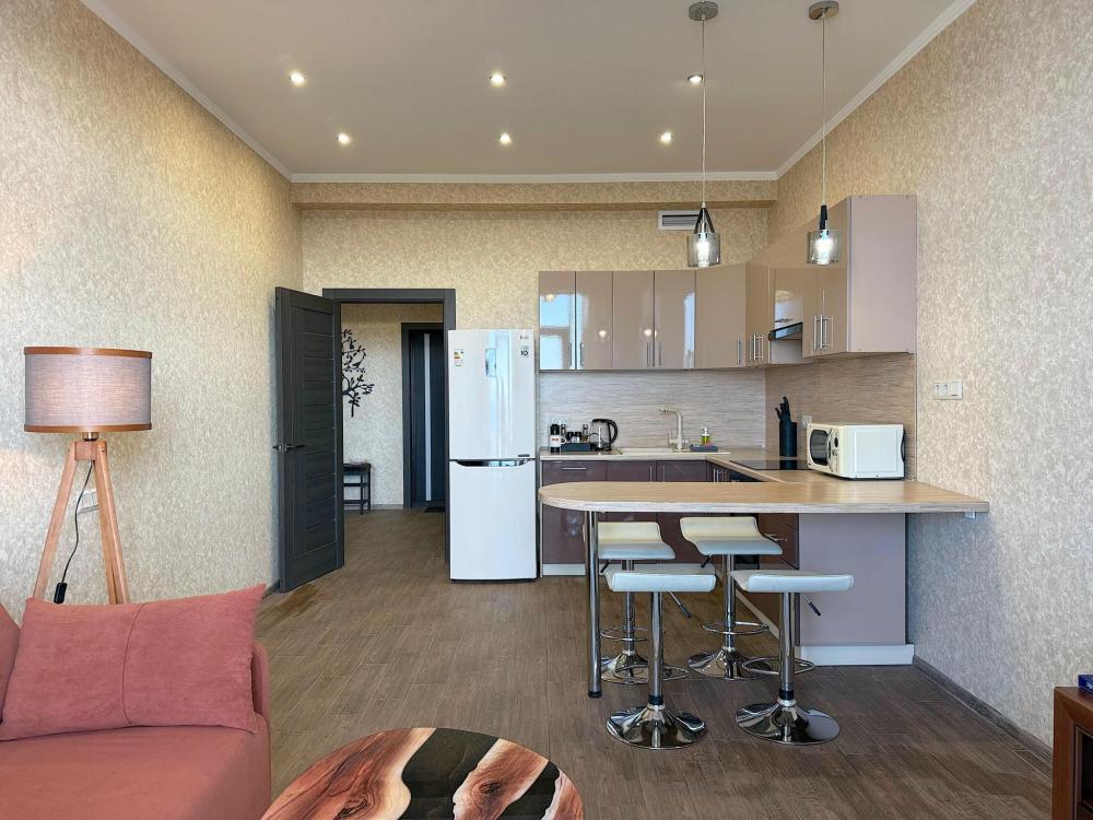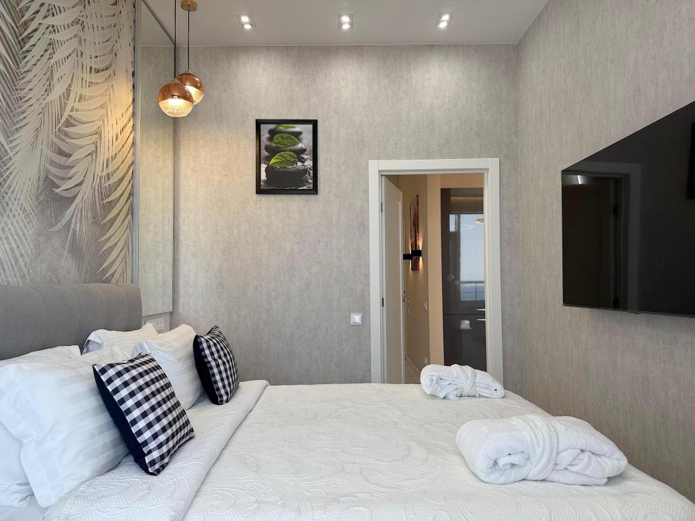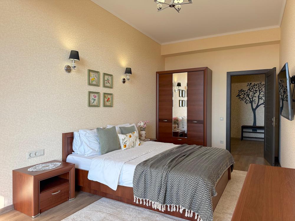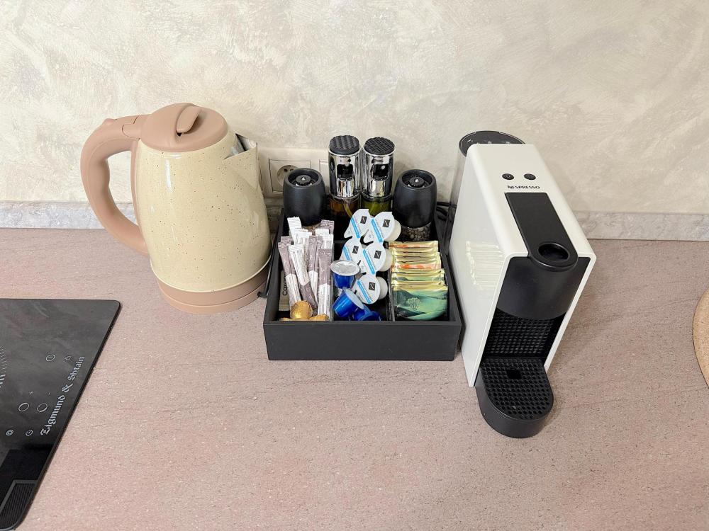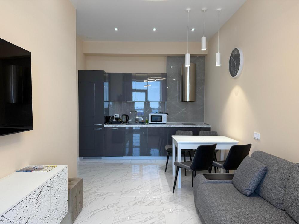 Апартаменты вместимостью до 4 человек. В апартаментах есть все, что необходимо для комфортного проживания: двуспальная кровать, раскладной диван, сатиновое постельное белье, комплекты махровых полотенец, махровые халаты и тапочки для взрослых, балкон и два кресла со столиком, кондиционер, телевизор, Wi-Fi, игровая приставка SonyPlayStation 5, шкаф-купе, холодильник, варочная поверхность, микроволновая печь, электрочайник, капсульная кофемашина, посуда, посудомоечная машина, гигиенические и гладильные принадлежности, теплые полы, стиральная машина, фен.