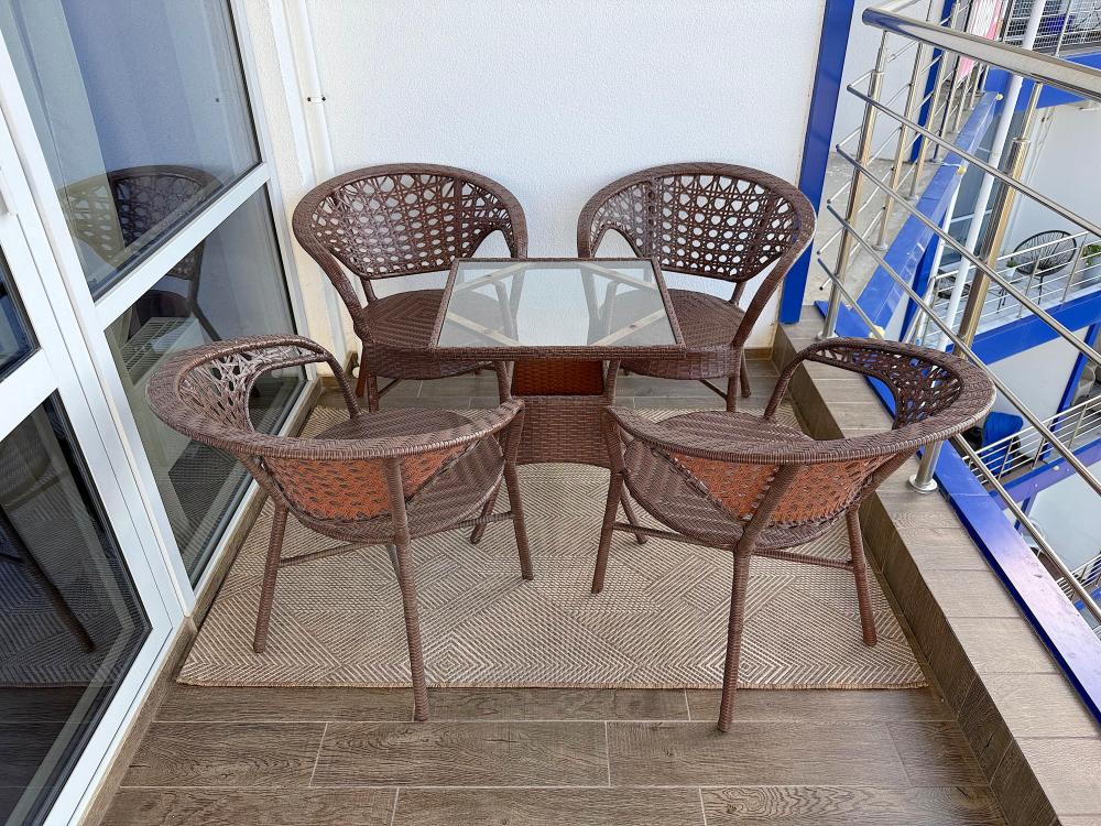 Апартаменты вместимостью до 2х человек. В апартаментах есть все, что необходимо для комфортного проживания: двуспальная кровать, сатиновое постельное белье, комплекты махровых полотенец, махровые халаты и тапочки для взрослых, балкон и два кресла со столиком, кондиционер, телевизор, Wi-Fi, шкаф-купе, холодильник, варочная поверхность, микроволновая печь, электрочайник, капсульная кофемашина, посуда, гигиенические и гладильные принадлежности, стиральная машина, фен.