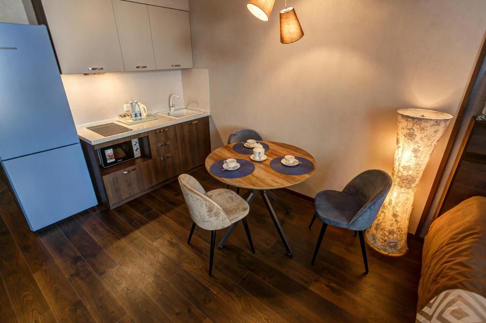 Однокомнатные апартаменты. Панорамные окна, Wi-Fi, балкон с летней мебелью (5-7 кв.м). Оборудован автоматической системой пожаротушения, централизованным отоплением, сплит-системой (кондиционирование). В номере: двуспальная кровать (160*200см), текстиль высокого качества (белое сатиновое постельное белье); тумбочки; туалетный столик с зеркалом; диванчик или кресло, журнальный столик; тумба под телевизор, плазменный Smart; прихожая: шкаф, сушилка для одежды, гладильная доска, утюг, сейф; обустроенная кухня со встроенной техникой: вытяжка, холодильник, кухонная электроплита, посудомоечная машинка (в отдельных номерах), микроволновая печь, чайная станция, обеденный стол или барная стойка, стулья, полный набор посуды; санузел: ванна, умывальник, туалет, стиральная машинка, фен, мини-косметика (шампунь, гель для душа, мыло), банные принадлежности (мягкие белые полотенца: банные, для лица, ножки), халаты (по количеству взрослых), тапочки (по количеству взрослых), пляжные полотенца. Возможно: 2 основных и 1 дополнительное место (раскладной диванчик или раскладное кресло).