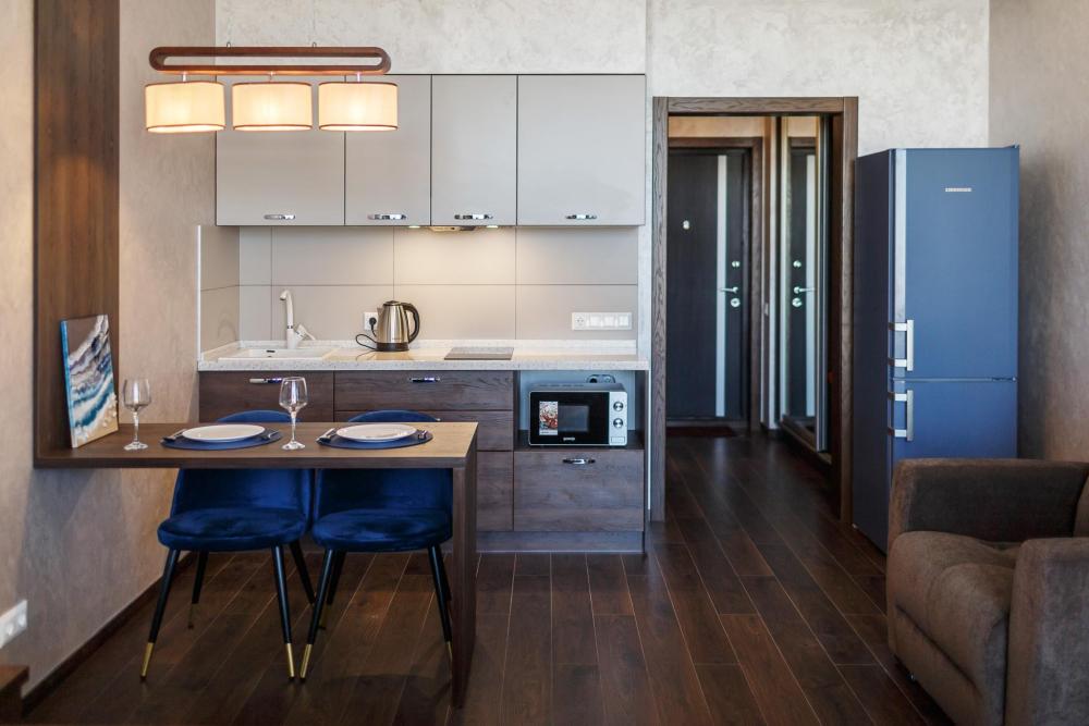 Однокомнатные апартаменты/ Панорамные окна, Wi-Fi, балкон с летней мебелью (5-7 кв.м). Оборудован автоматической системой пожаротушения, централизованным отоплением, сплит-системой (кондиционирование). В номере: двуспальная кровать (160*200см), текстиль высокого качества (белое сатиновое постельное белье); тумбочки; диванчик или кресло, журнальный столик; туалетный столик с зеркалом; тумба под телевизор, плазменный Smart; прихожая: шкаф или шкаф-купе, сушилка для одежды, гладильная доска, утюг, сейф; полноценная кухня со встроенной техникой: вытяжка, холодильник, кухонная электроплита; электрическая духовка (в отдельных номерах), посудомоечная машинка (в отдельных номерах), микроволновая печь, чайник/чайная станция, обеденный стол или барная стойка, стулья, полный набор посуды; санузел: ванна, умывальник, туалет, стиральная машинка, фен, мини-косметика (шампунь, гель для душа, мыло), банные принадлежности (мягкие белые полотенца: банные, для лица, ножки), халаты (по количеству взрослых), тапочки (по количеству взрослых), пляжные полотенца. Возможно: 2 основных и 1 дополнительное место (раскладной диванчик или раскладное кресло).