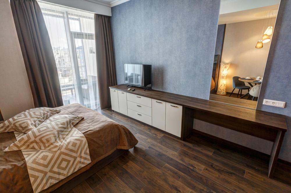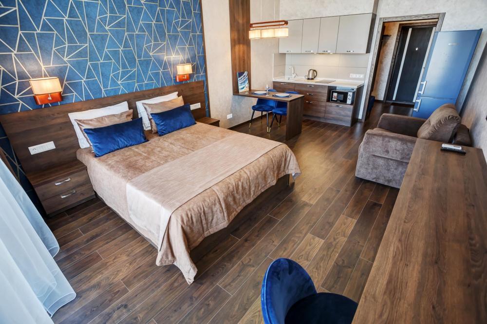 Однокомнатные апартаменты. Панорамные окна, Wi-Fi, балкон с летней мебелью (5 кв.м). Оборудован автоматической системой пожаротушения, централизованным отоплением, сплит-системой (кондиционирование). В номере: двуспальная кровать (180*200 см или 160*200 см), текстиль высокого качества (белое сатиновое постельное белье); тумбочки; дополнительное место - раскладной диван или раскладное кресло; бра; туалетный столик, стул; тумба под телевизор, плазменный Smart; шкаф-купе или шкаф, зеркало, вешалка для одежды, сушилка для одежды, гладильная доска, утюг, сейф; полноценная кухня со встроенной техникой: вытяжка, холодильник, кухонная электроплита, микроволновая печь (духовая печь), чайник, барная стойка, стулья, полный набор посуды; санузел: душевая кабинка, умывальник, зеркало, туалет, гигиенический душ, стиральная машинка, фен, мини-косметика (шампунь, гель для душа, мыло), банные принадлежности (мягкие белые полотенца: банные, для лица, ножки), халаты, тапочки, пляжные полотенца. Возможно: 2 основных места и 1 дополнительное место.