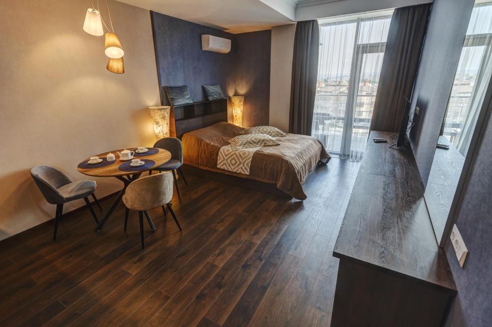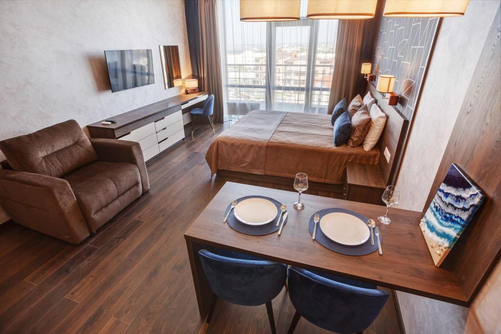 Однокомнатные апартаменты. Панорамные окна, Wi-Fi, балкон с летней мебелью (5-7 кв.м). Оборудован автоматической системой пожаротушения, централизованным отоплением, сплит-системой (кондиционирование). В номере: двуспальная кровать (160*200см), текстиль высокого качества (белое сатиновое постельное белье); в одном из номеров 2 раскладных кресла; тумба под телевизор, плазменный Smart; прихожая: шкаф или шкаф-купе, сушилка для одежды, гладильная доска, утюг, сейф, полноценная кухня со встроенной техникой: вытяжка, холодильник, кухонная электроплита; электрическая духовка, посудомоечная машинка, микроволновая печь, чайник, обеденный стол или барная стойка, стулья, полный набор посуды; санузел: душевая кабина, умывальник, туалет, стиральная машинка, фен, мини-косметика (шампунь, гель для душа, мыло), банные принадлежности (мягкие белые полотенца: банные, для лица, ножки), халаты (по количеству взрослых), тапочки (по количеству взрослых), пляжные полотенца. Возможно: 2 основных в одном из номеров возможно 1 дополнительное место (раскладные кресла).