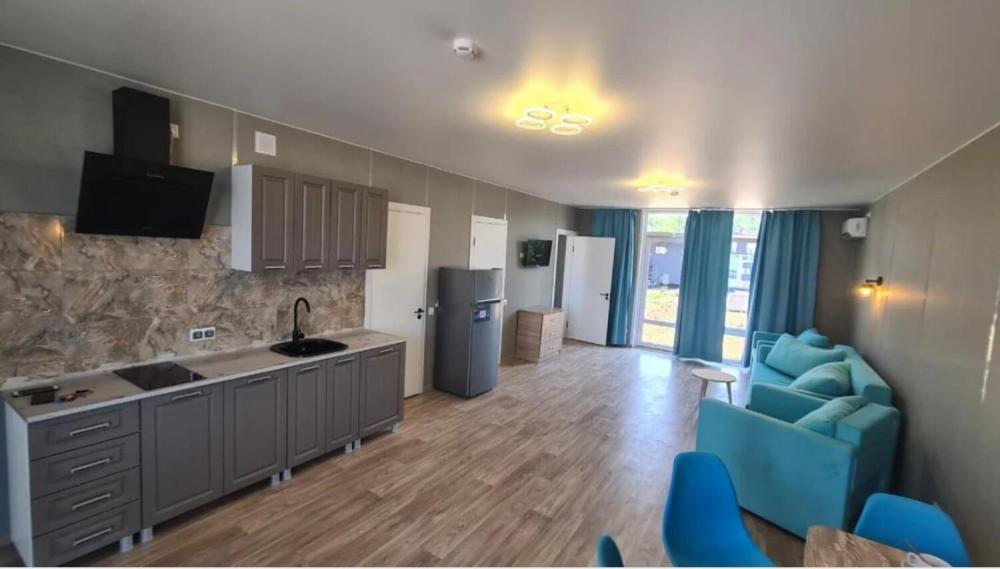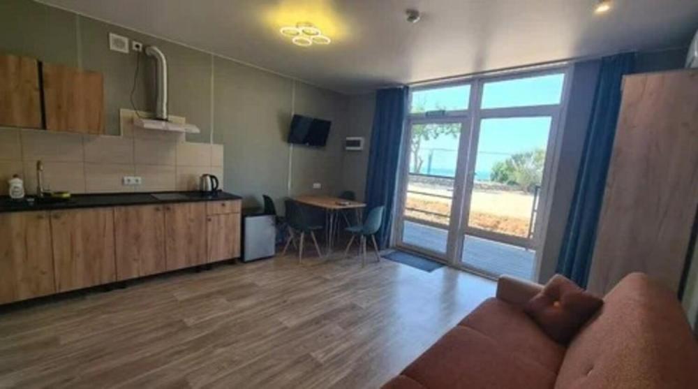 Семейный двухкомнатный номер состоит из одной спальни, кухни-гостиной, санузла с душем и просторной террасы. Площадь номера 43,8м2 ,терраса-14,8м2. В гостиной раскладной диван, полноценное спальное место, телевизор со Smart TV. Кухня оборудована мини холодильником, индукционной плитой, микроволновой печью, необходимой посудой. Обедаем в гостиной или на террасе глядя на море. Спальня с двуспальной кроватью 160х200, шкаф -купе ,письменный стол для работы, раздельное кондиционирование комнат,Wi-Fi. Совмещенный санузел включает в себя душ, унитаз, раковину со смесителем, зеркало, фен, средства гигиены и полотенца.