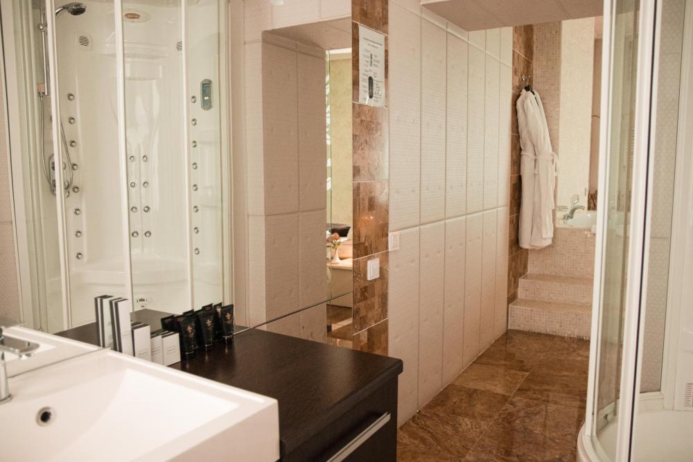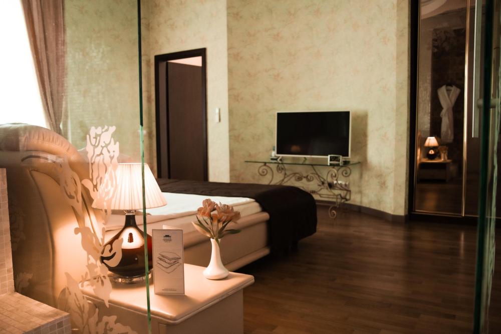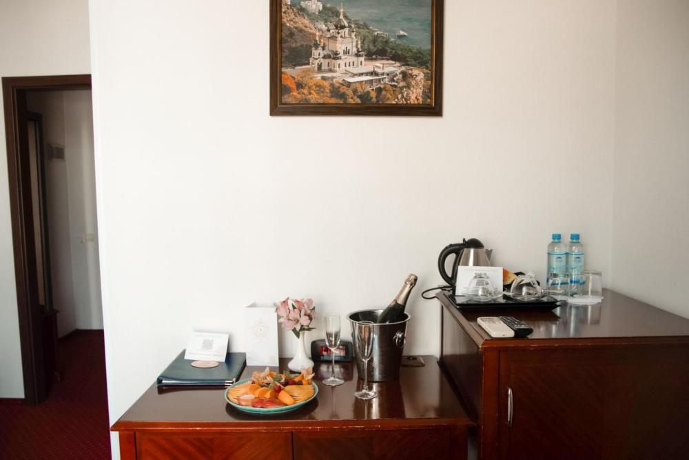 Уютный, комфортабельный номер средней площадью 45 м2. Номер состоит из прихожей и двух комнат – спальня и гостиная, которые разделены аркой или дверью. В гостиной – удобная мягкая мебель, журнальный столик, плазменный телевизор. В спальне – удобная двуспальная кровать 1,6м х 2м, плазменный телевизор. В ванной комнате – ванная или душевая кабинка. Почти все номера этой категории имеют балконы, с которых открывается великолепная панорама Севастопольской бухты. Единоразовое бесплатное посещение банного комплекса (русская, римская, альпийская бани, турецкий Хаммам, финская сауна, джакузи). Каждый номер оборудован: - сплит - системой; - бесплатным Wi-Fi Интернетом; - феном; - мини-баром; - сейфом; - спутниковым телевидением; - телефоном с прямым международным доступом; - чайным набором; - комплиментарной питьевой водой; - электронным замком.