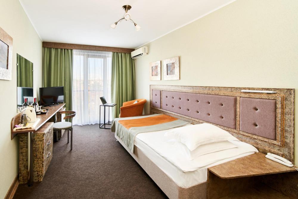 Основное размещение – 2 гостя Однокомнатный двухместный номер, с балкона открывается панорамный вид на город. Стены номера украшают картины. В НОМЕРЕ: двухспальная, две односпальные кровати, прихожая, ванная комната с ванной.