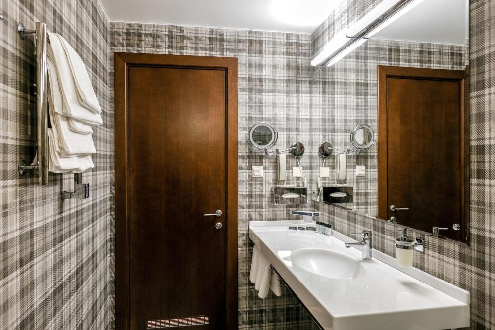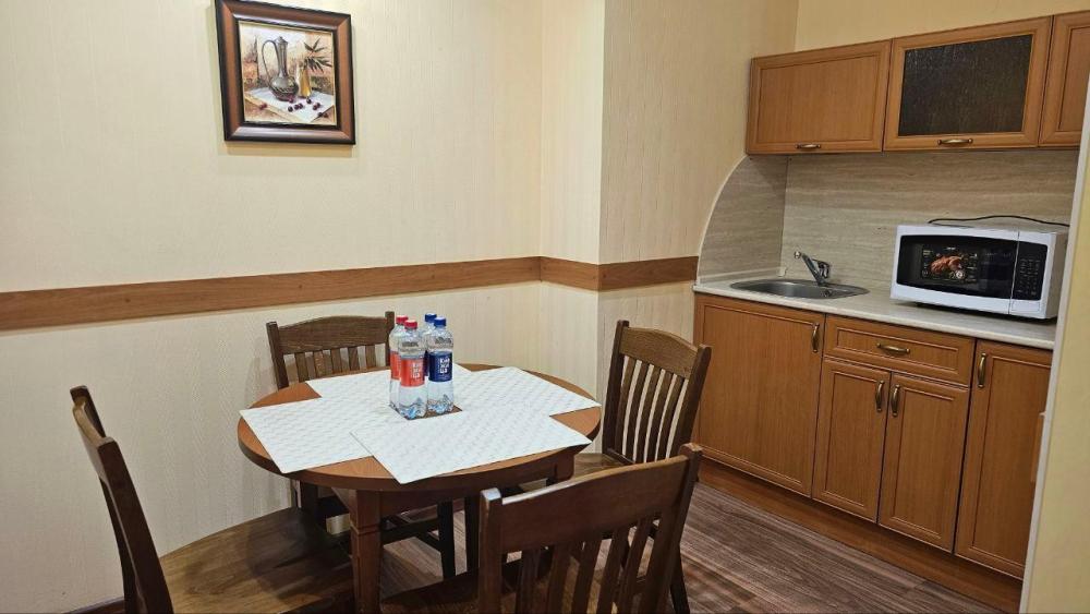 Комфортабельный номер площадью 49 кв.м. с современной итальянской мебелью. Состоит из спальни, гостиной, ванной комнаты и полностью оборудованной кухни. Все окна выходят во двор на солнечную сторону. В номере: Диван, Двуспальная кровать (160*200 см.), 2 односпальные кровати во второй комнате, Журнальный столик, Телевизор ЖК (более 50 каналов), Письменный стол (с канцелярскими принадлежностями), Телефон, Прихожая с просторным гардеробом, Сейф, Кухонный гарнитур, Электрический чайник, Обеденный стол и стулья, Мини-холодильник, Кухонная посуда и столовые приборы на 4 персоны, Туалетные принадлежности