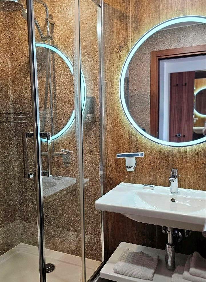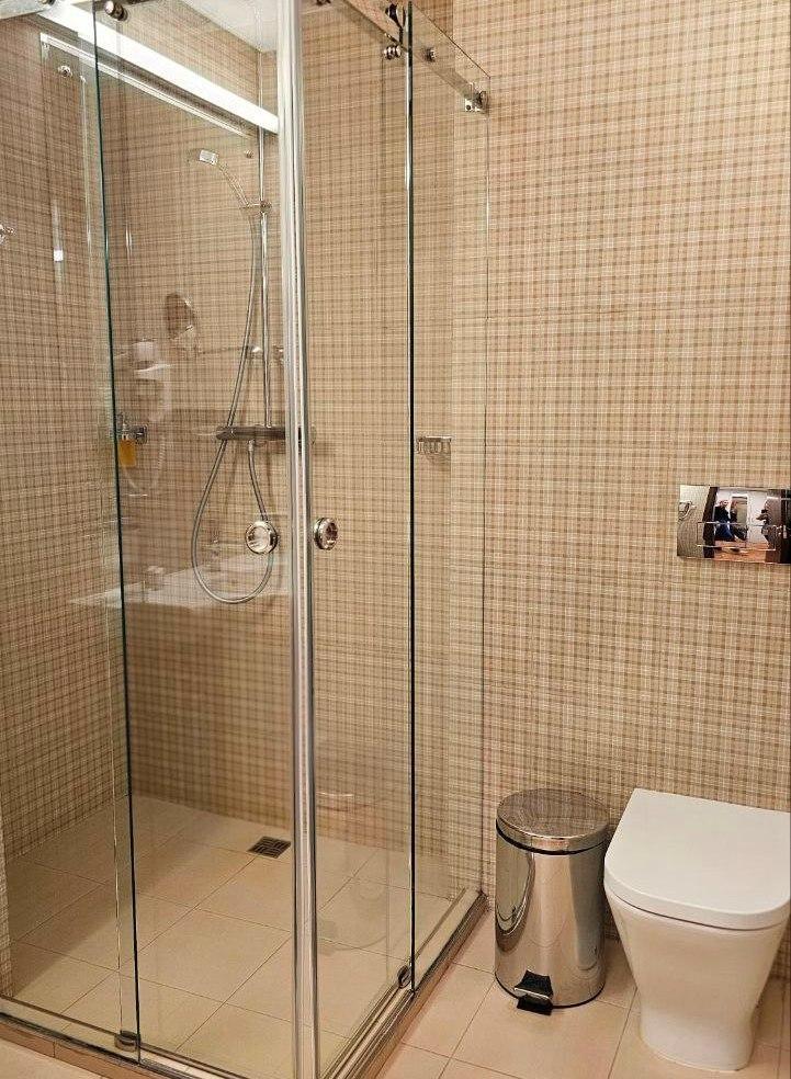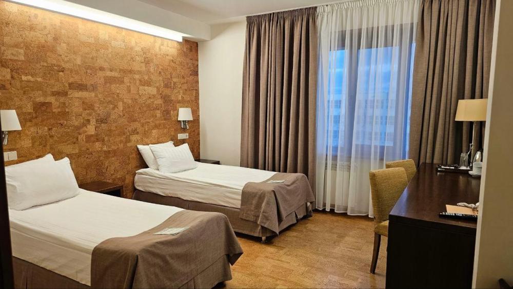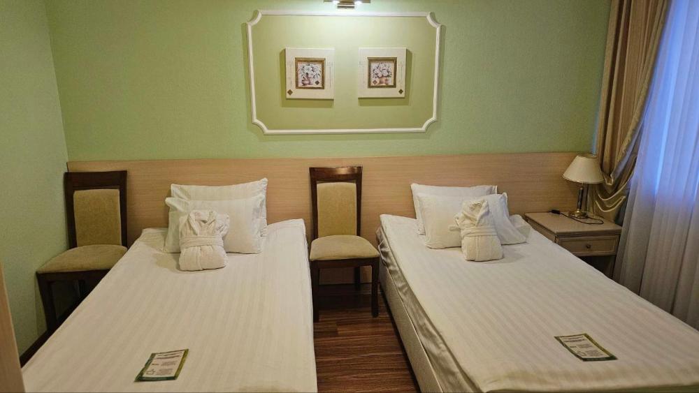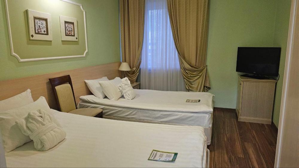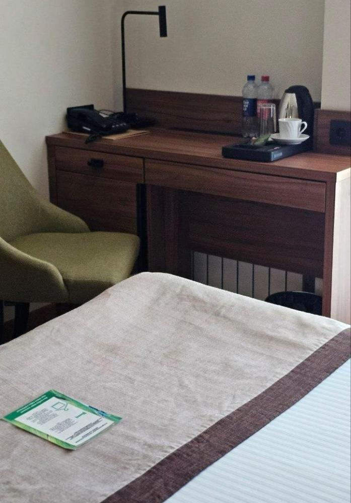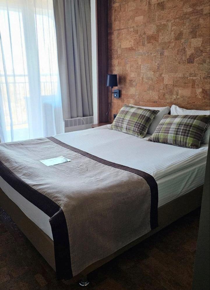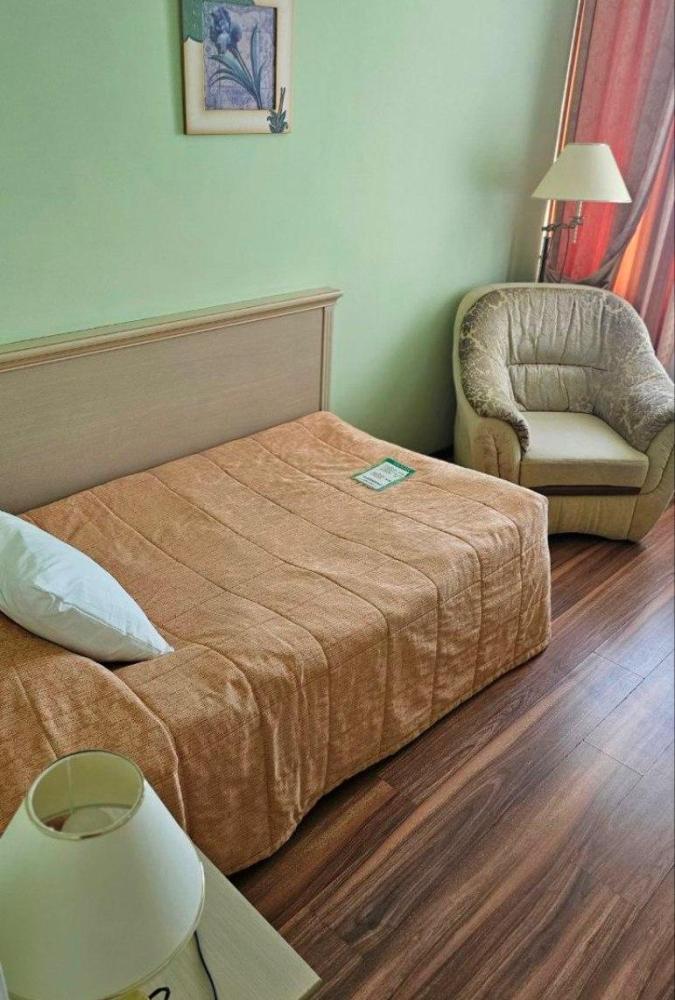 Просторный номер в эко-стиле с пробковым покрытием. 2 односпальные кровати/1 2-спальная кровать (Указывайте, пожалуйста, в комментарии к бронированию). Номер предлагает комфортное проживание благодаря минималистичному дизайну и современному оснащению. В комнате имеется рабочая зона с письменным столом и двумя креслами, что идеально подходит для деловых поездок или отдыха с книгой. Большие окна с плотными шторами обеспечивают достаточное количество дневного света и уютный вечерний покой. Ванная комната выполнена в современном стиле с душевой кабиной; раковина с большим зеркалом и качественные туалетные принадлежности дополняют удобство пребывания в номере. В номере: 1 кровать 180*200 или 2 кровати 90*200 Телевизор ЖК (20 каналов) Письменный стол (с канцелярскими принадлежностями) Телефон Сейф Прихожая с большим шкафом Фен Чайная станция Гладильная станция Электрический чайник Мини-холодильник Кухонная посуда и столовые приборы на 2 персоны Туалетные принадлежности