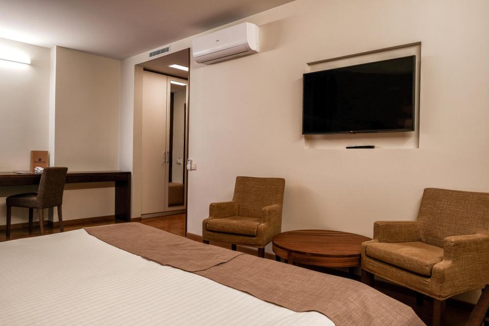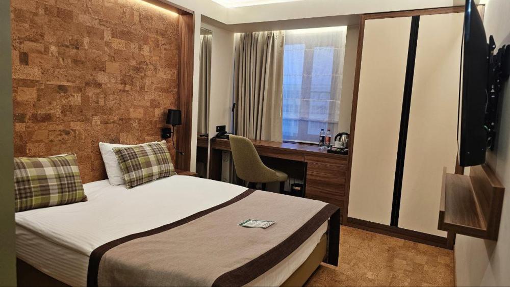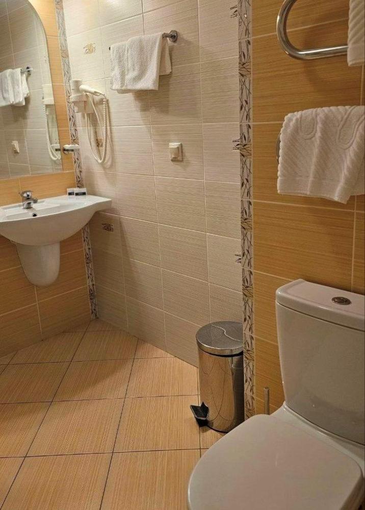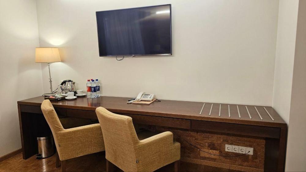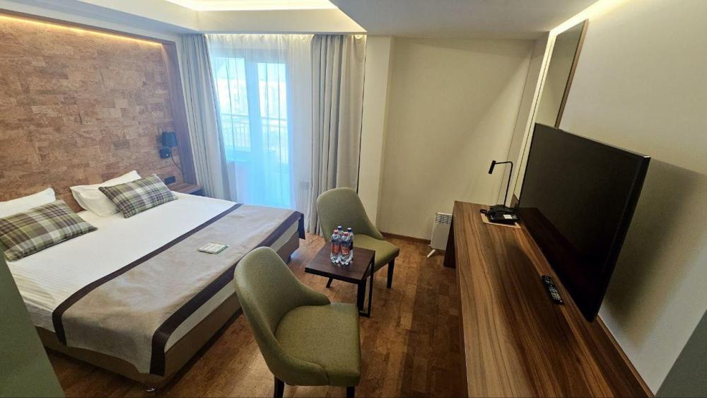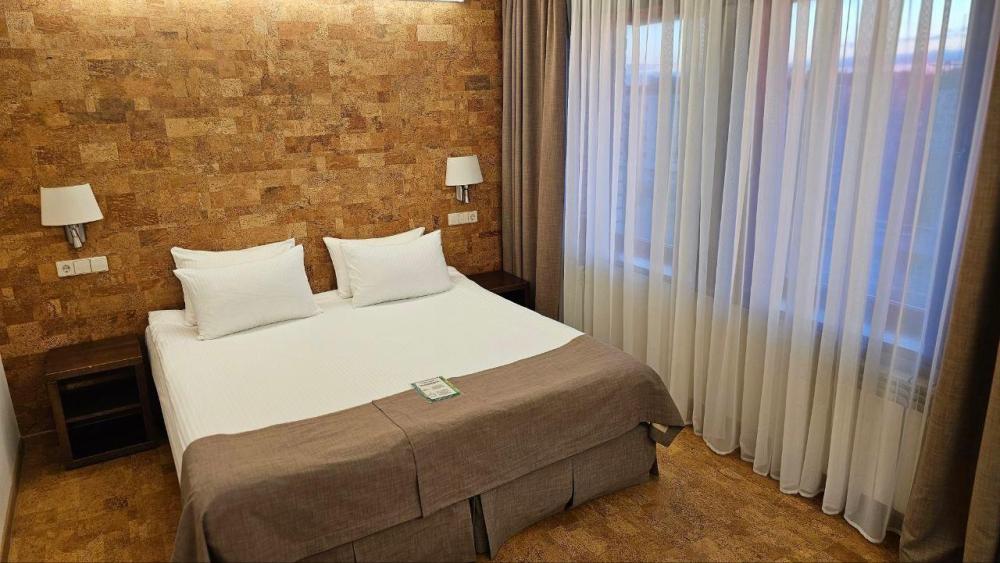 Номер предлагает уютное пространство с современной пробковой отделкой, где комфортно можно отдохнуть после насыщенного дня. Комната оснащена стильной кроватью, гармонично вписывающейся в теплый интерьер. Большое окно освещает уютный рабочий стол, идеально подходящий для деловых задач или просто для чтения. Номер дополнен шкафом для удобного размещения одежды. Ванная комната оформлена в современных оттенках, предусматривает просторную душевую кабину и необходимые удобства, подчеркивающие комфорт пребывания. В номере: Кровать (160*200 см.) Тумбочка прикроватная 2 шт. Телевизор ЖК(20 каналов) Холодильник Письменный стол(с канцелярскими принадлежностями) Телефон Шкаф Электрический чайник+чайная станция Фен