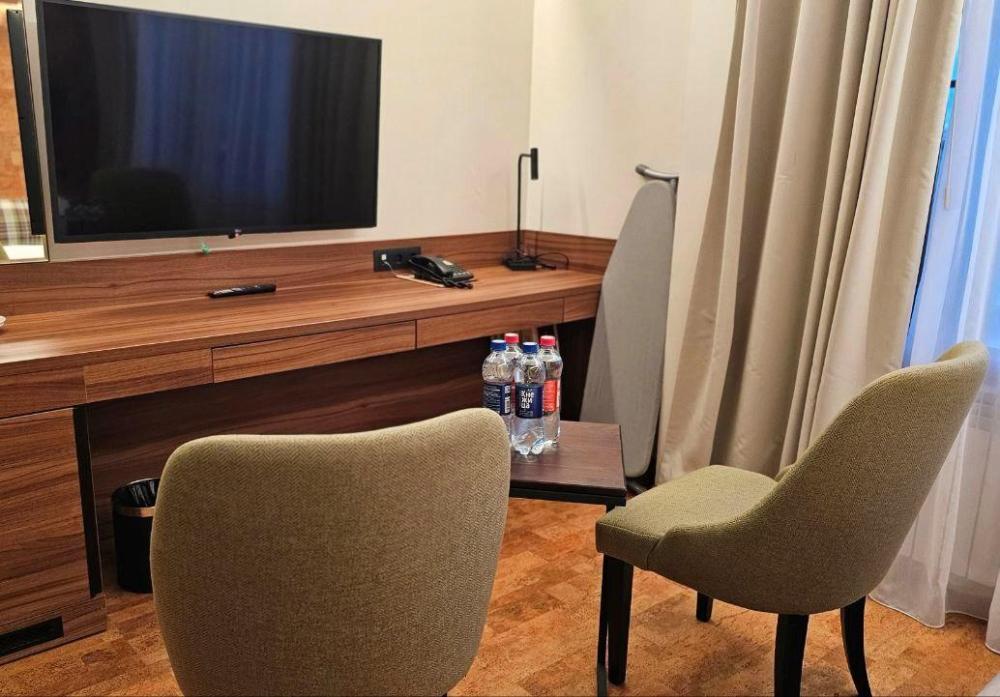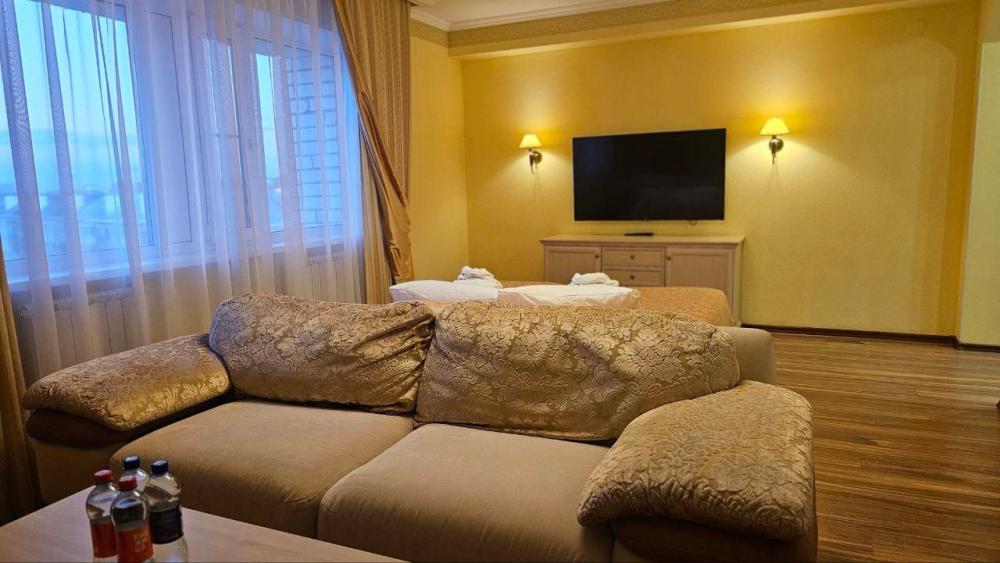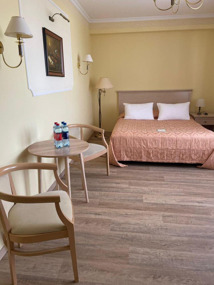 Комфортабельный номер, состоящий из двух раздельных комнат – гостиной и спальни. В номере имеется кухонный уголок, прихожая и ванная комната. Все окна номеров данной категории выходят на центральную улицу. В номере: Диван, Двуспальная кровать (160*200 см.), Журнальный столик, Телевизор ЖК (более 50 каналов), Письменный стол (с канцелярскими принадлежностями), Телефон, Прихожая с просторным гардеробом, Сейф, Кухонный гарнитур, Электрический чайник, Мини-бар (наполнение бара по запросу), Кухонная посуда и столовые приборы на 3 персоны, Туалетные принадлежности