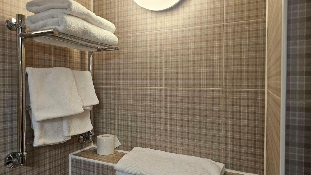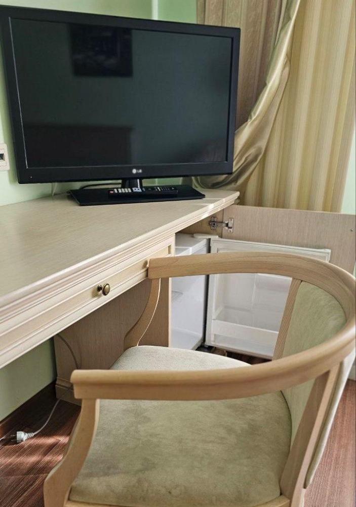 Номер оформлен в теплых бежевых тонах с акцентом на уют и комфорт. В комнате установлена односпальная кровать, что создает атмосферу умиротворения и уединения. Интерьер дополнен нежными шторами и стильной мебелью из светлого дерева. Современная ванная комната оснащена всем необходимым для комфортного пребывания. В номере: Кровать (110*200 см.) Телевизор ЖК(20 каналов) Письменный стол(с канцелярскими принадлежностями) Телефон Небольшая прихожая со шкафом Электрический чайник Мини-холодильник Кухонная посуда и столовые приборы на 1 персону В ванной комнате ванна или душевая кабина Туалетные принадлежности