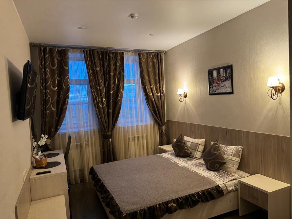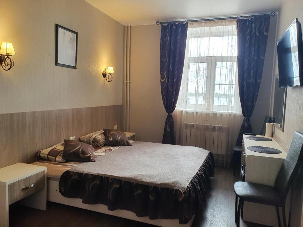 Комната Комфорт. В комнате: двуспальная или 2 односпальные кровати, постельное белье, прикроватные тумбочки, зеркало, стол, стул, ТВ.