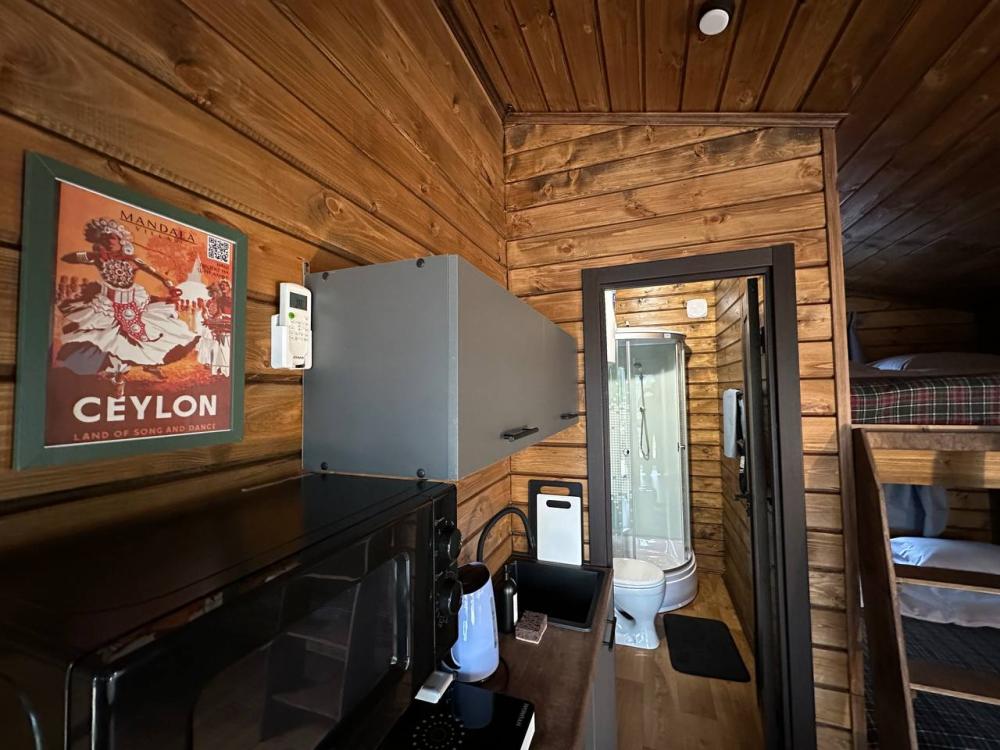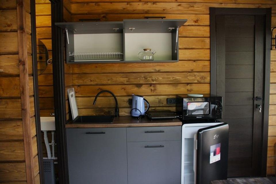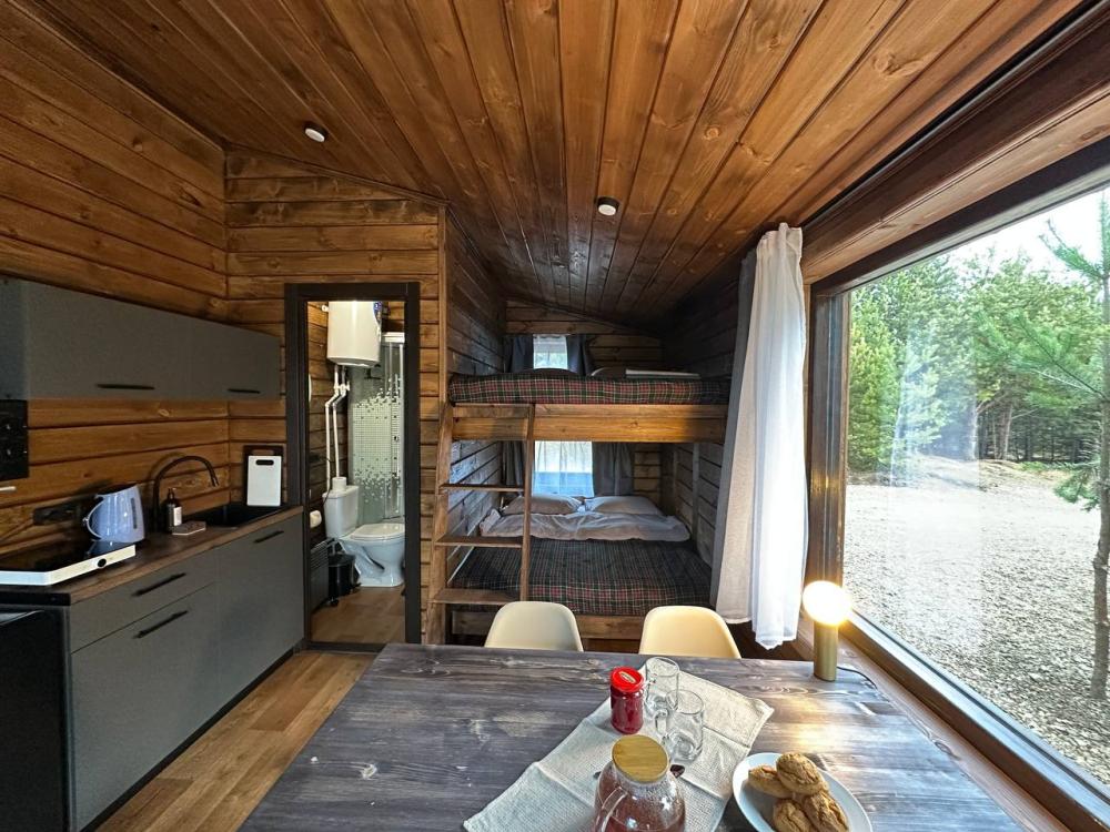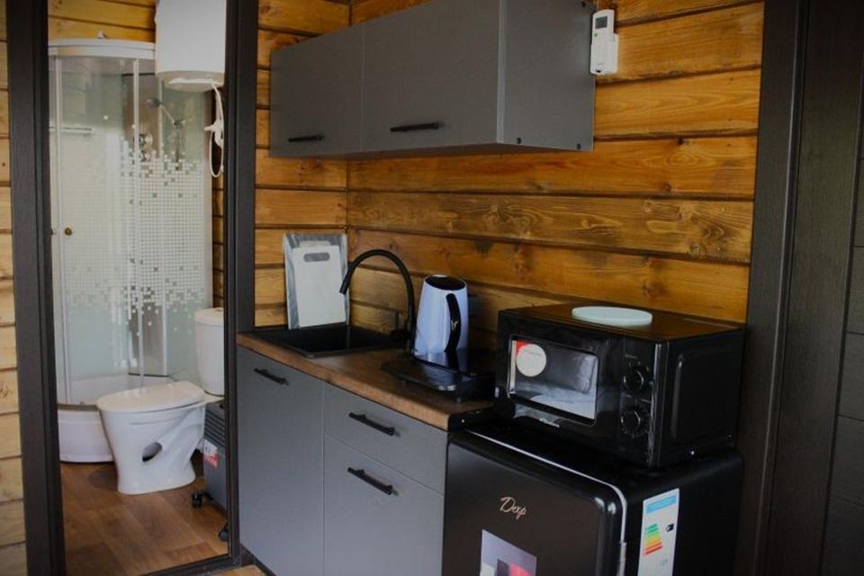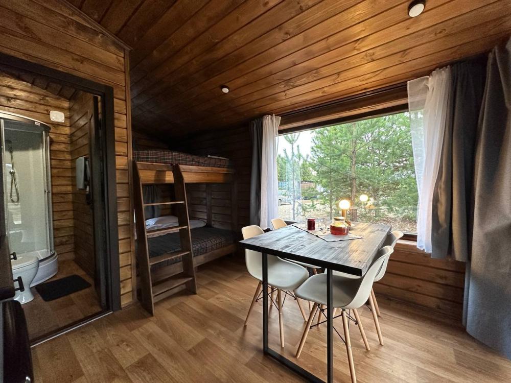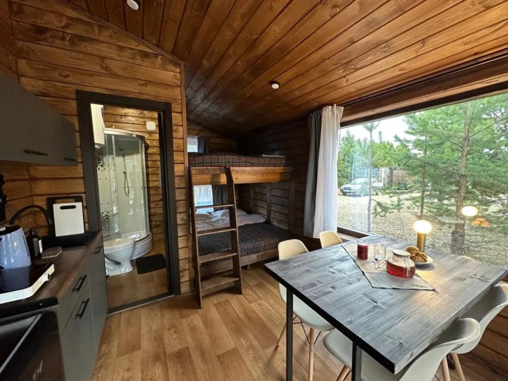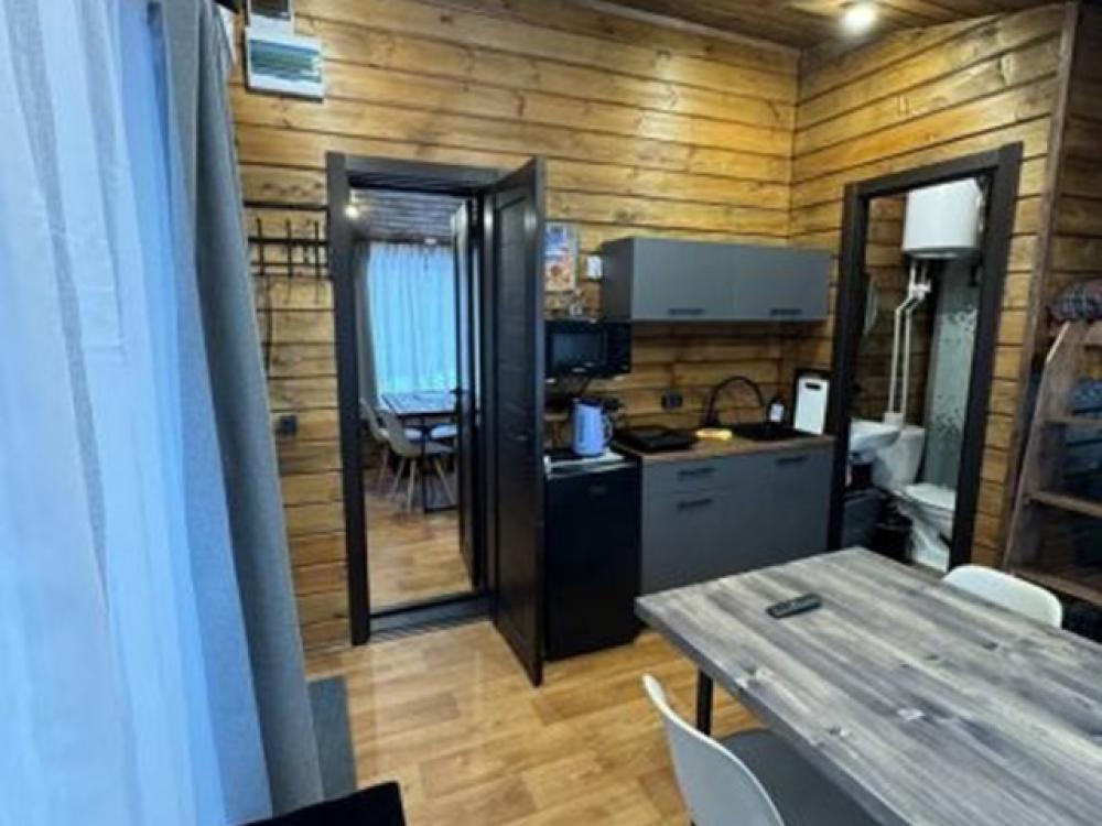 Домик площадью 15 квадратных метров с террасой для размещения до 4-х гостей. В домике есть все необходимое для комфортного пребывания: кухня с микроволновой печью, варочной поверхностью, холодильником, чайником, раковиной и всей необходимой посудой для приготовления. Обеденная зона располагает большим столом и стульями. Спальная зона представлена двуспальной кроватью на первом уровне и еще одной двуспальной кроватью на втором уровне. Каждый домик оборудован санузлом с душевой кабиной. На террасе также имеется стол и скамейка. Около домика расположен мангал.