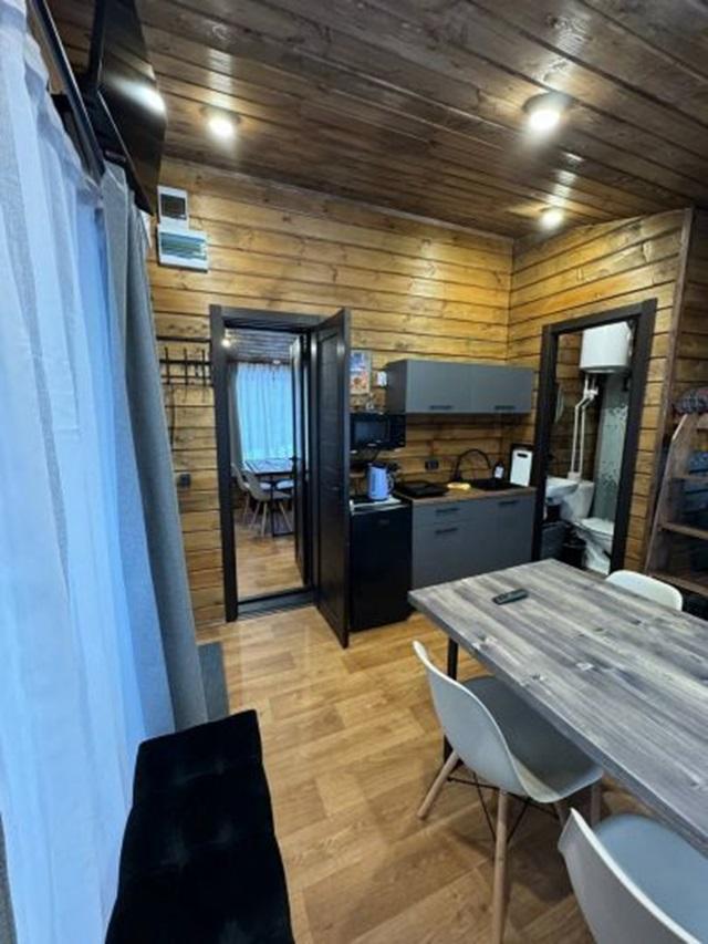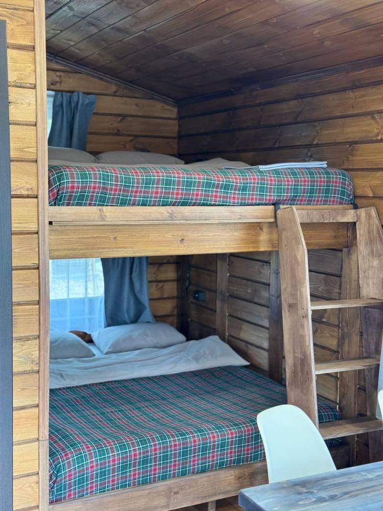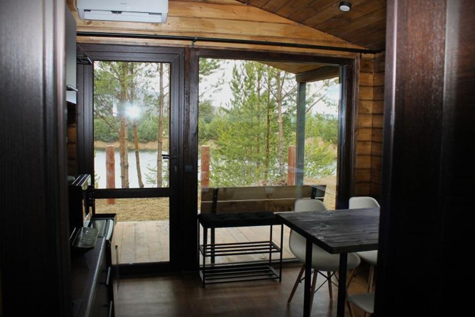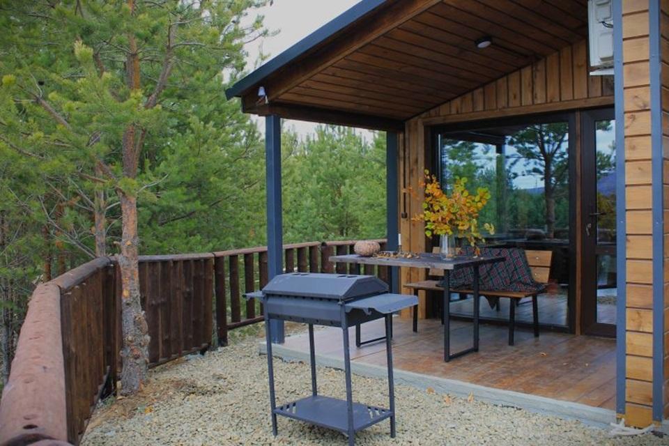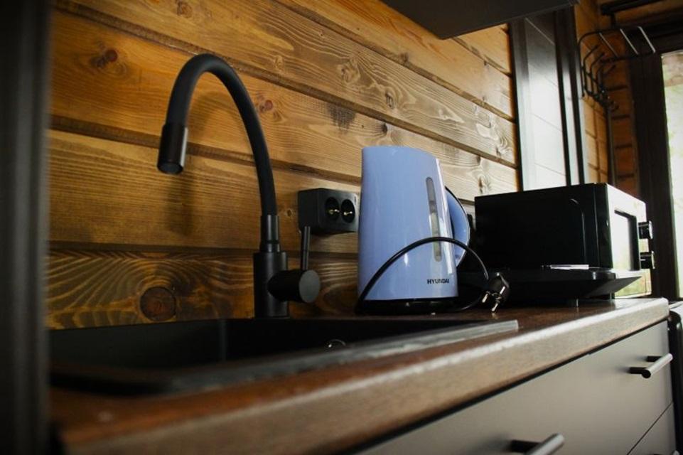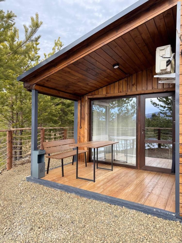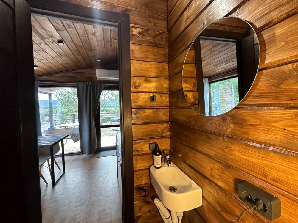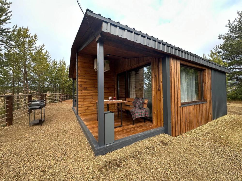 Домик площадью 15 квадратных метров с террасой для размещения до 4-х гостей. В домике есть все необходимое для комфортного пребывания: кухня с микроволновой печью, варочной поверхностью, холодильником, чайником, раковиной и всей необходимой посудой для приготовления. Обеденная зона располагает большим столом и стульями. Спальная зона представлена двуспальной кроватью на первом уровне и еще одной двуспальной кроватью на втором уровне. Каждый домик оборудован санузлом с душевой кабиной. На террасе также имеется стол и скамейка. Около домика расположен мангал.