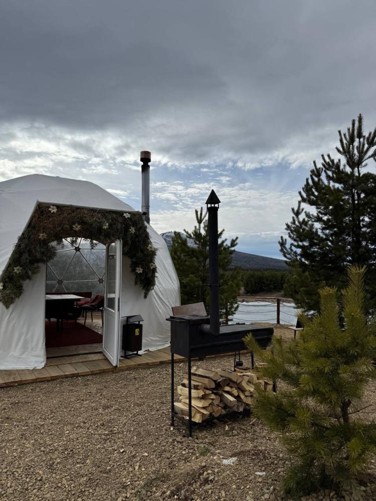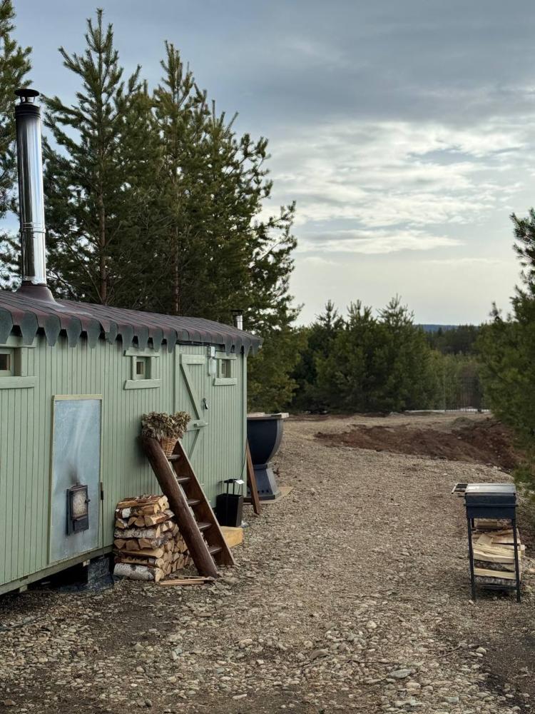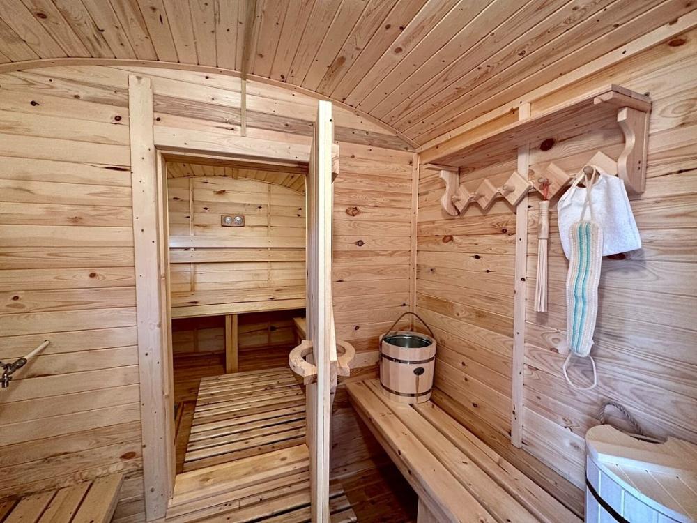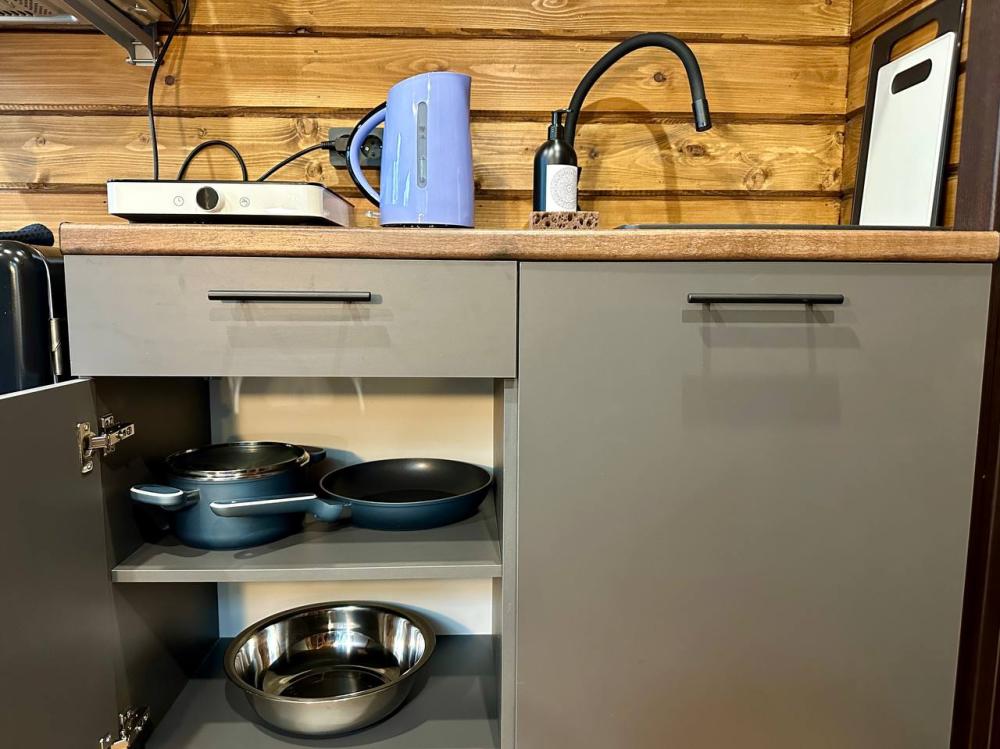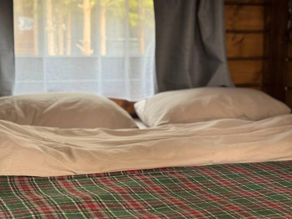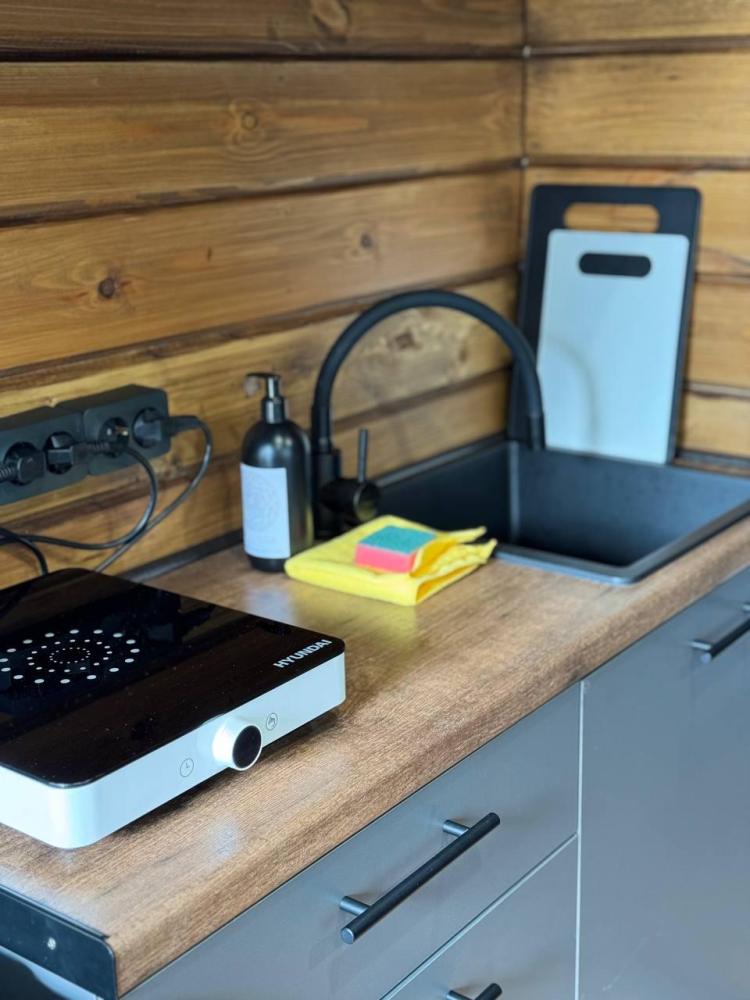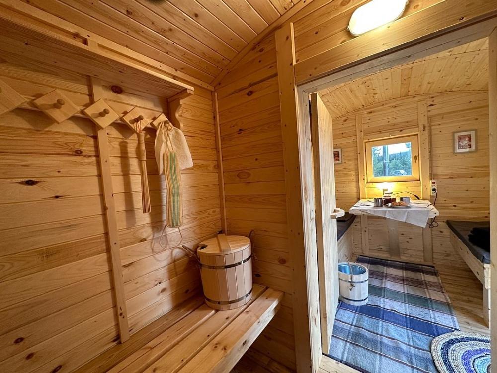 Домик площадью 15 квадратных метров с террасой для размещения до 4-х гостей. В домике есть все необходимое для комфортного пребывания: кухня с микроволновой печью, варочной поверхностью, холодильником, чайником, раковиной и всей необходимой посудой для приготовления. Обеденная зона располагает большим столом и стульями. Спальная зона представлена двуспальной кроватью на первом уровне и еще одной двуспальной кроватью на втором уровне. Каждый домик оборудован санузлом с душевой кабиной. На террасе также имеется стол и скамейка. Около домика расположен мангал.