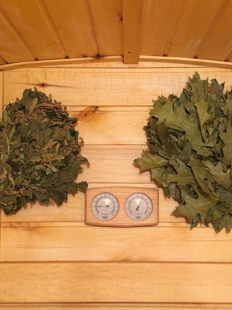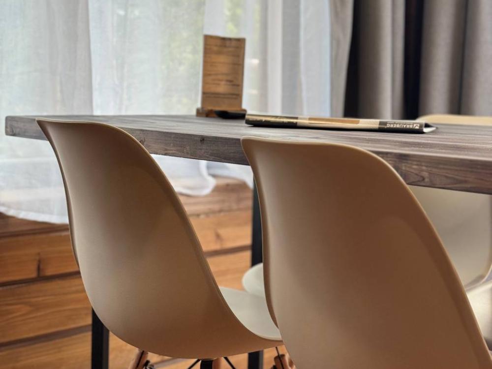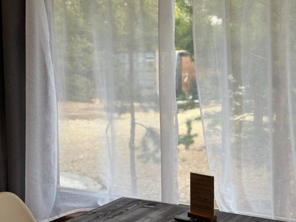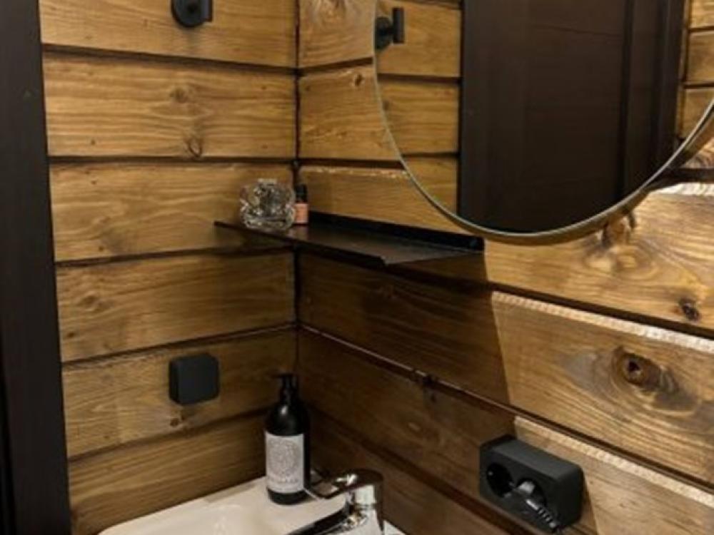 Домик площадью 30 квадратных метров с террасой, смежный, для размещения до 8-ми гостей. В домике есть все необходимое для комфортного пребывания: кухня с микроволновой печью, варочной поверхностью, холодильником, чайником, раковиной и всей необходимой посудой для приготовления. Обеденная зона располагает большим столом и стульями. Спальная зона представлена двуспальной кроватью на первом уровне и еще одной двуспальной кроватью на втором уровне. Каждый домик оборудован санузлом с душевой кабиной. На террасе также имеется стол и скамейка. Около домика расположен мангал.