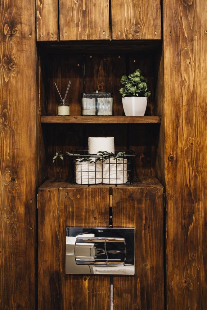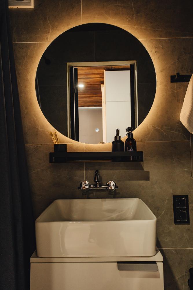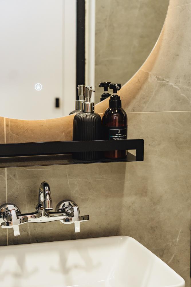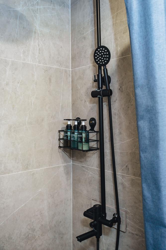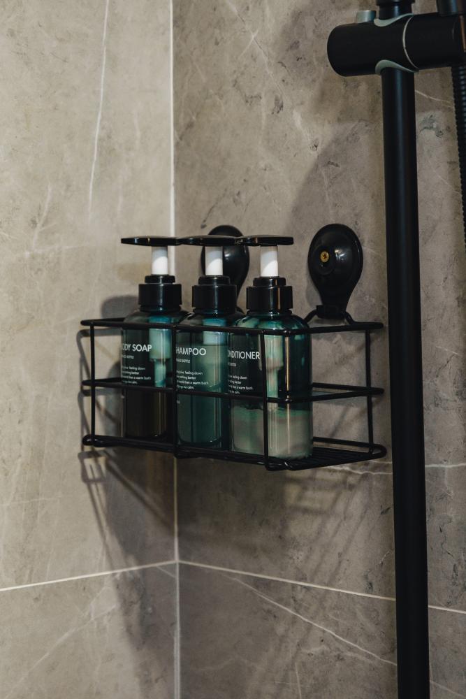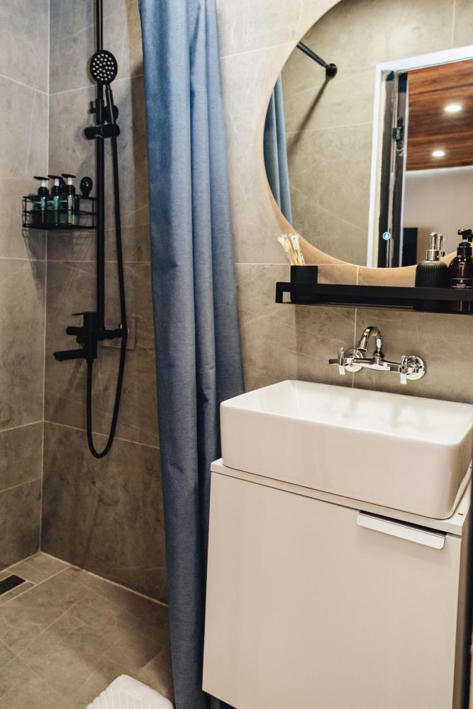 Ванная комната с большой душевой кабинкой и всеми средствами гигиены.