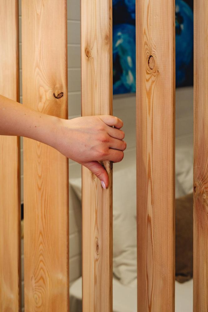Большая двуспальная кровать с ортопедическим матрасом, которую можно оградить жалюзи. Раскладной двухместный диван.