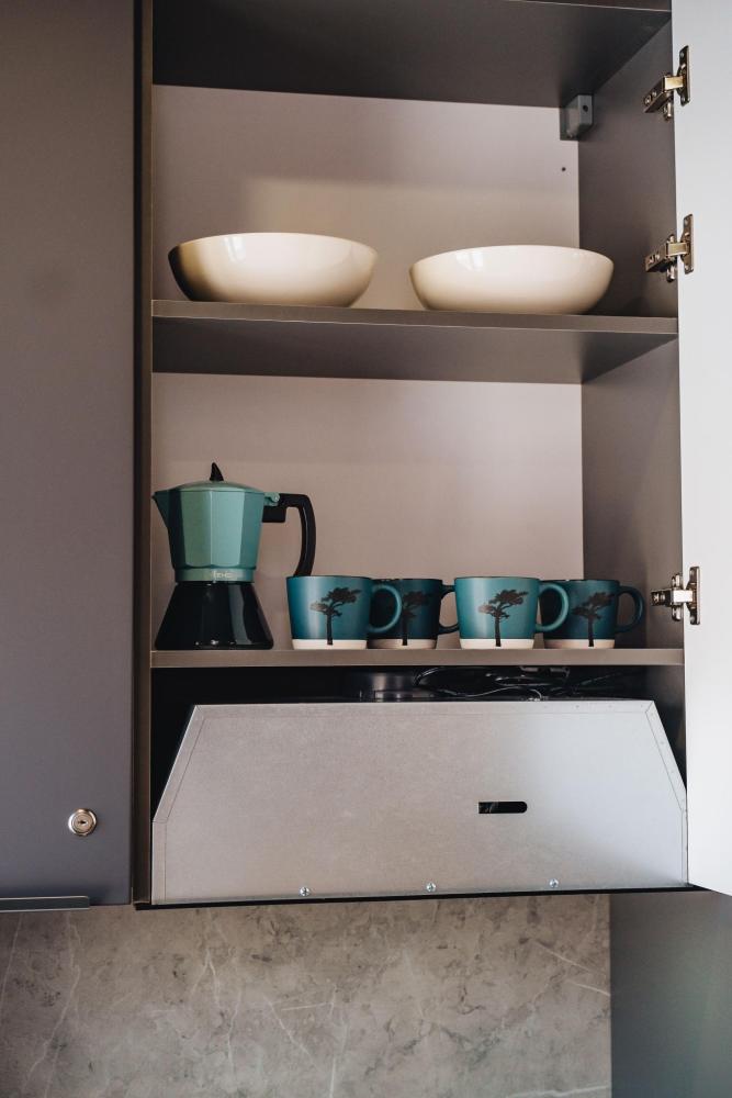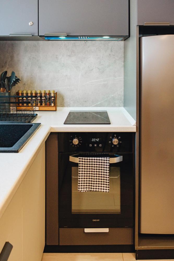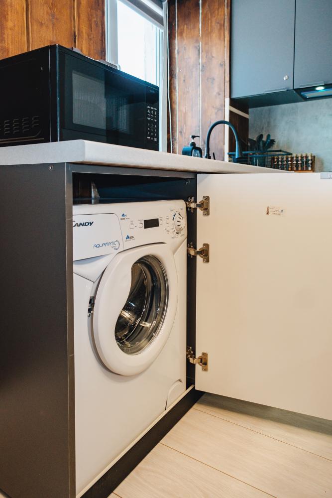 Холодильник, варочная поверхность, духовка, стиральная машина, микроволновка, чайник и гейзерная кофеварка.